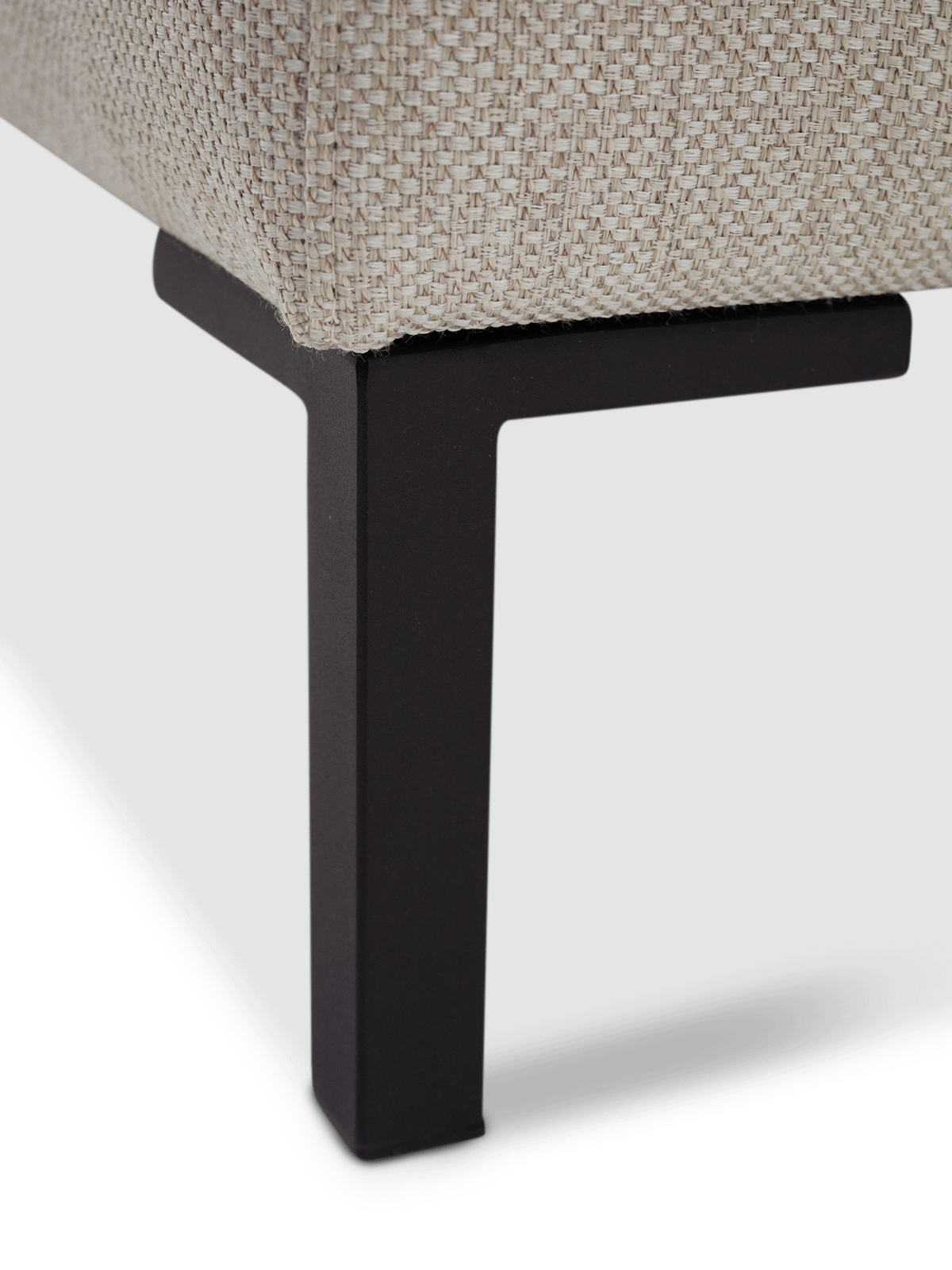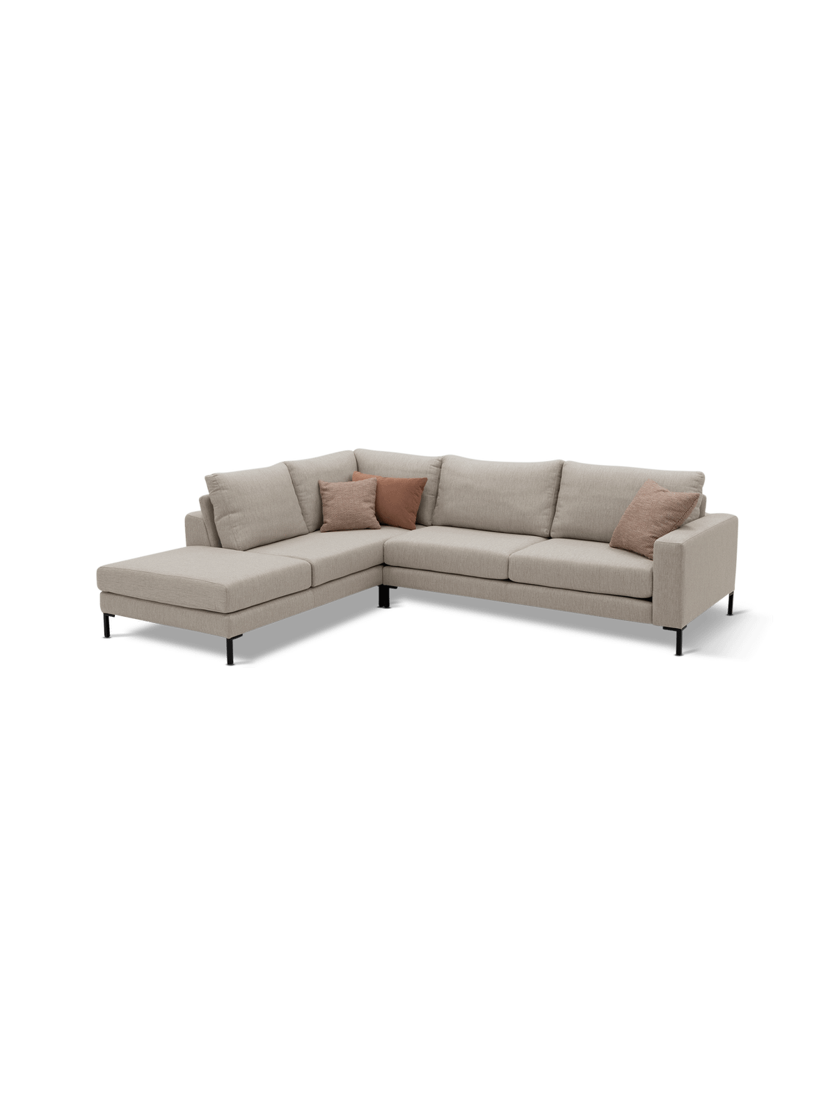 De neutrale beige tint van de bekleding straalt warmte en sereniteit uit, terwijl de fijne zwarte poten zorgen voor een luchtige, moderne toets. Dankzij de hoogwaardige stoffen afwerking en de zachte kussens biedt het salon Flavie dagelijks comfort voor het hele gezin. De subtiele kleuraccenten van de sierkussens geven het geheel een gezellige en persoonlijke uitstraling.