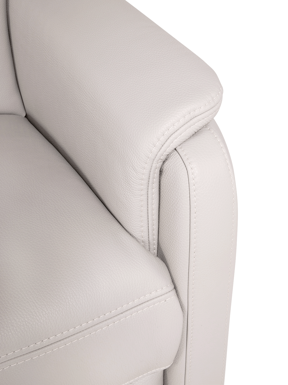 Net zoals de relaxvariant is deze zetel bekleed met kwaliteitsvol leder dat niet alleen duurzaam is, maar ook een warme, luxueuze uitstraling geeft. De verfijnde stiksels en zorgvuldige afwerking onderstrepen het vakmanschap dat je mag verwachten van een Belgisch product.