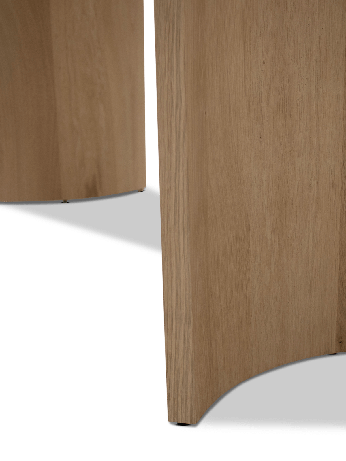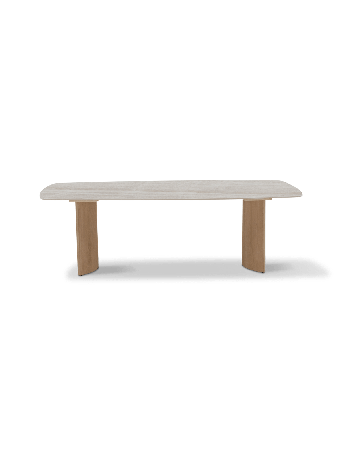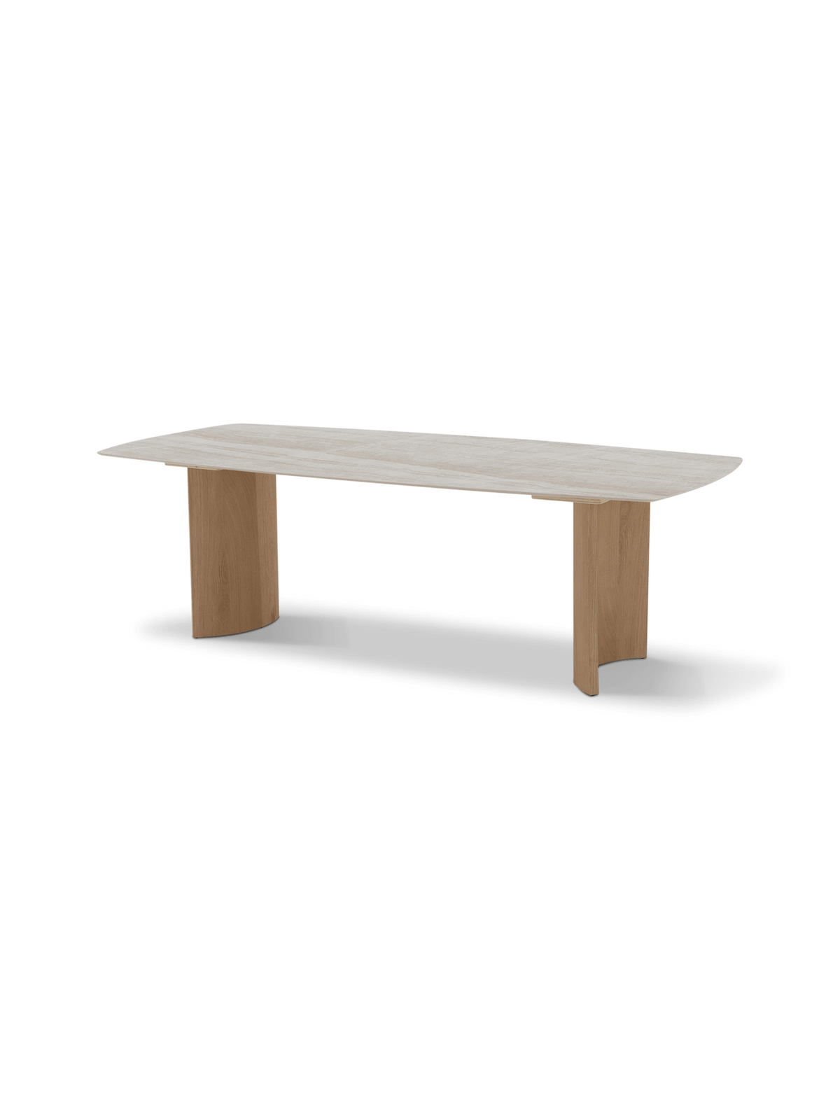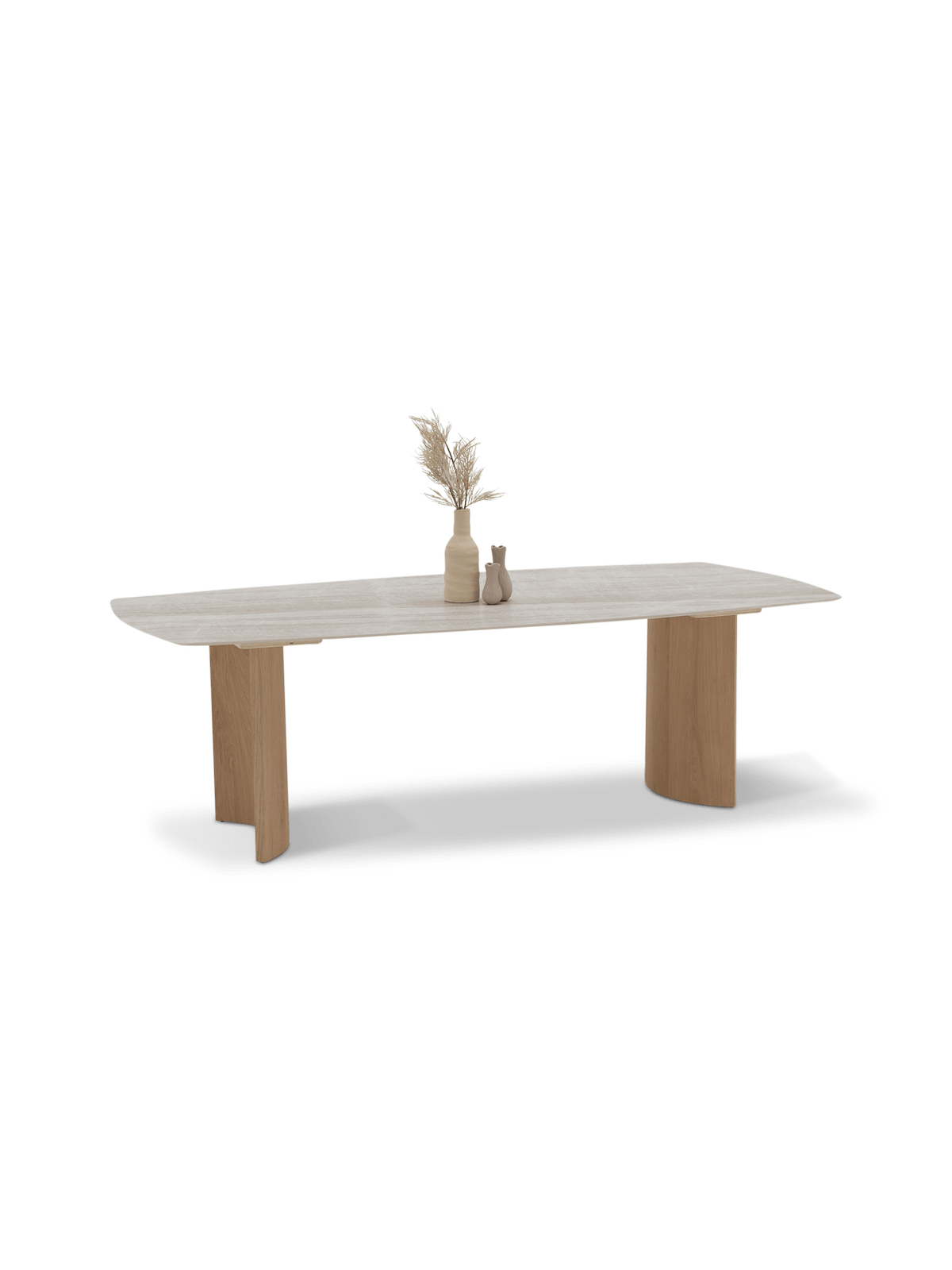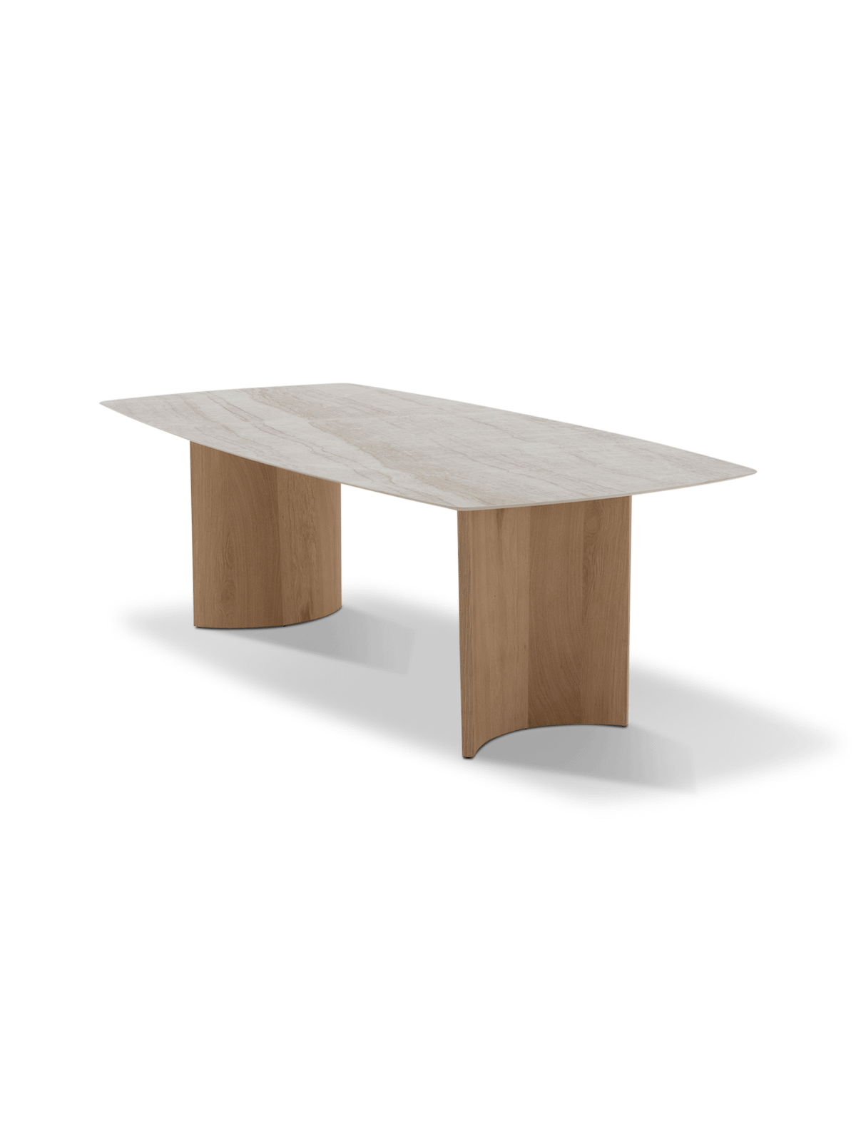 De naturel eikenhouten poten brengen warmte en balans in het ontwerp. Door de vormgeving blijft de tafel luchtig ogen, terwijl ze toch stevig en stabiel aanvoelt. Zo combineert deze eettafel moeiteloos design met comfort, van een snelle koffie tot een volledige avond tafelen.