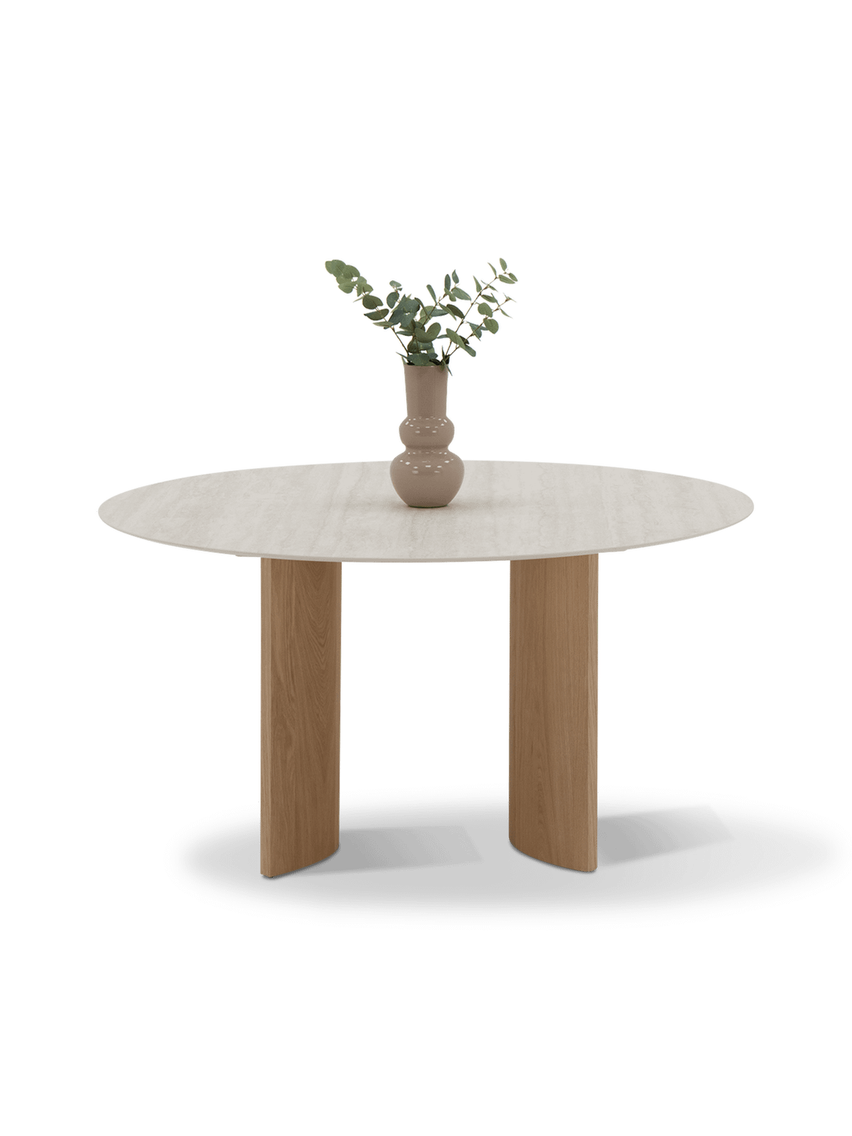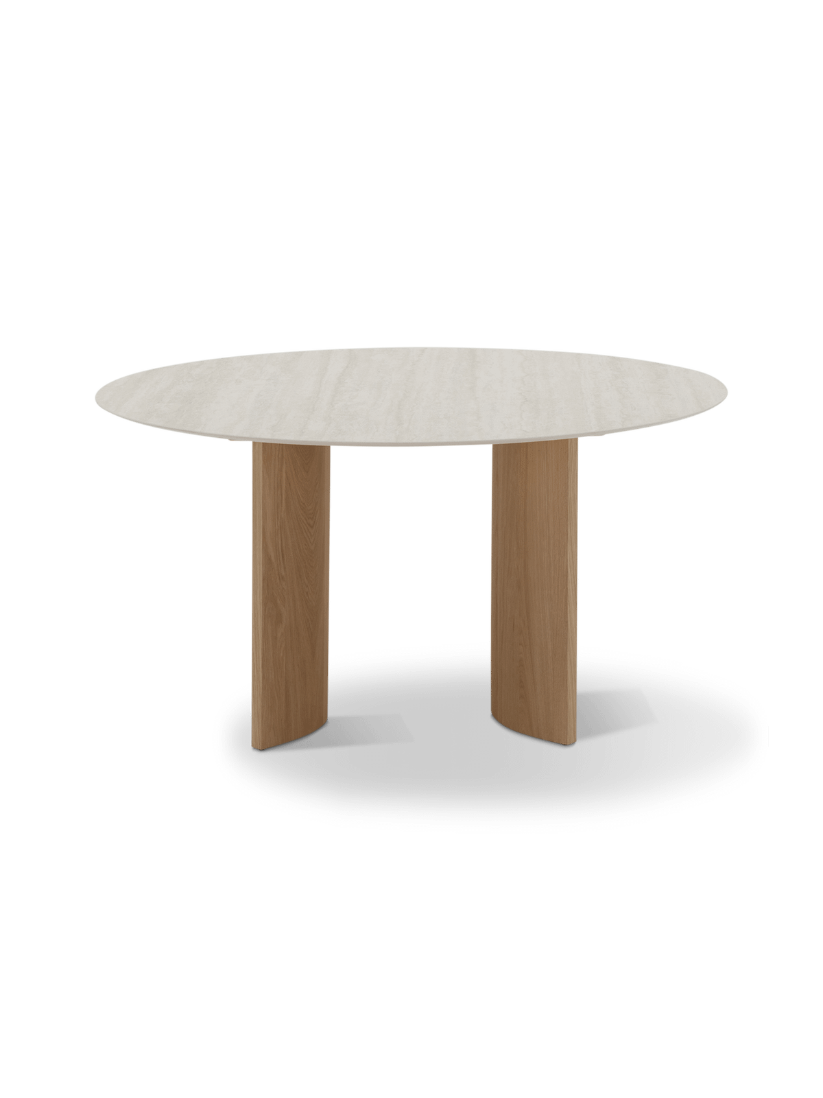 De Nice eettafel combineert natuurlijke materialen met een tijdloze vormgeving. Het ronde tafelblad in travertijn straalt verfijning uit, terwijl de pootconstructie in naturel eikenhout warmte toevoegt aan het geheel. De nerftekening van het hout vormt een mooi contrast met de lichte kleur van het blad.