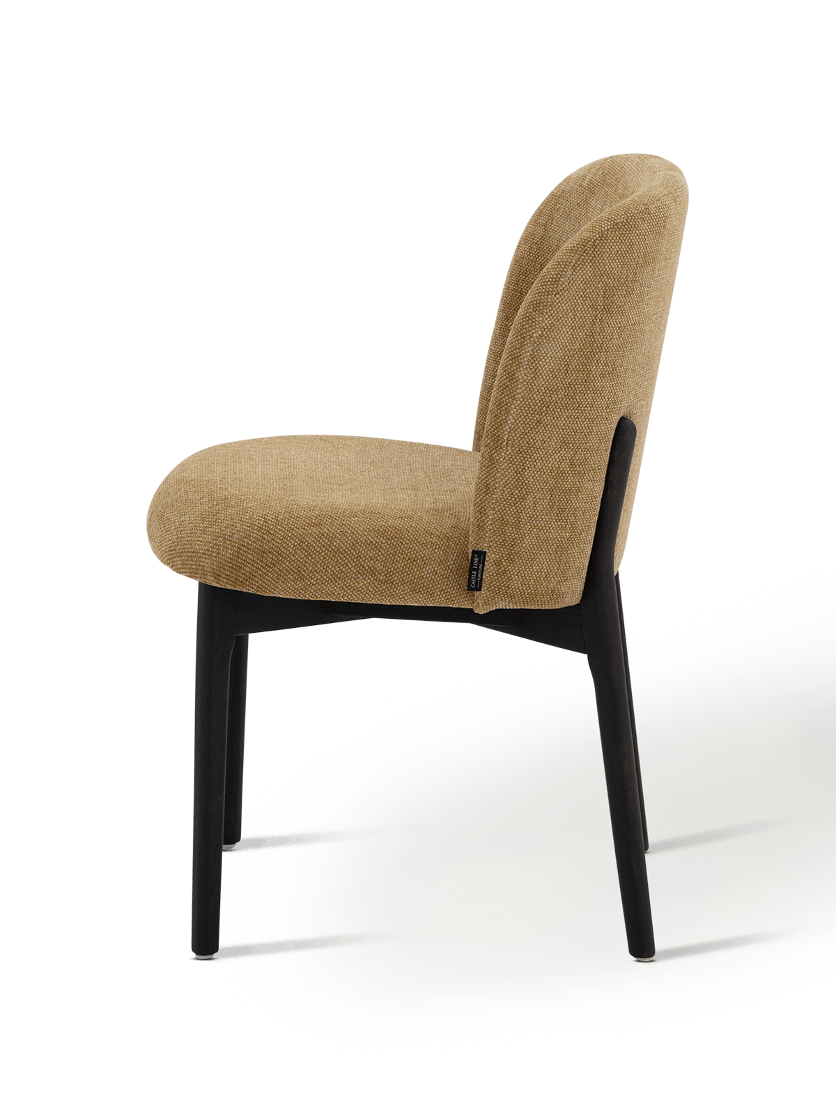 De poten zijn uitgevoerd in massief eikenhout en donker gebeitst, wat een elegant contrast vormt met de stoffering. De verfijnde potensetting en licht taps toelopende vorm geven de stoel een luchtige uitstraling en onderstrepen het vakmanschap waar Castle Line om bekendstaat.