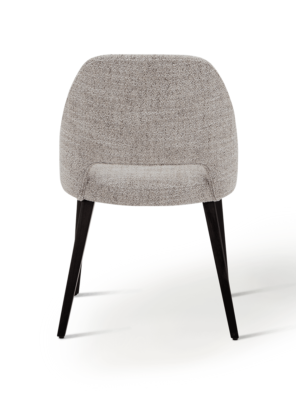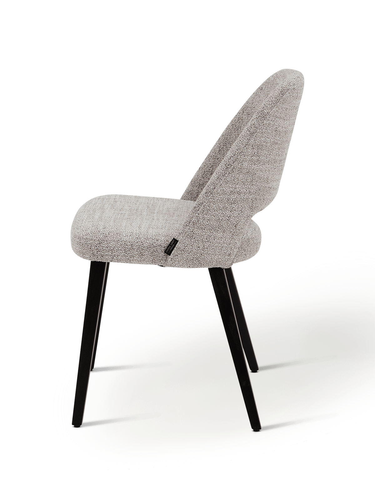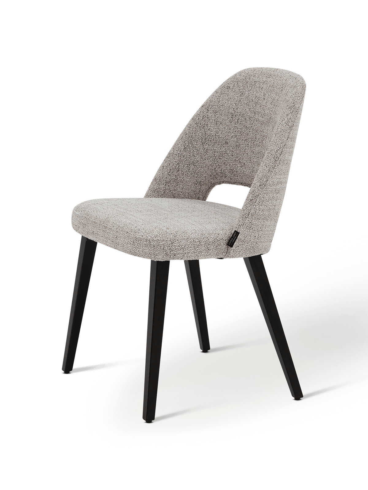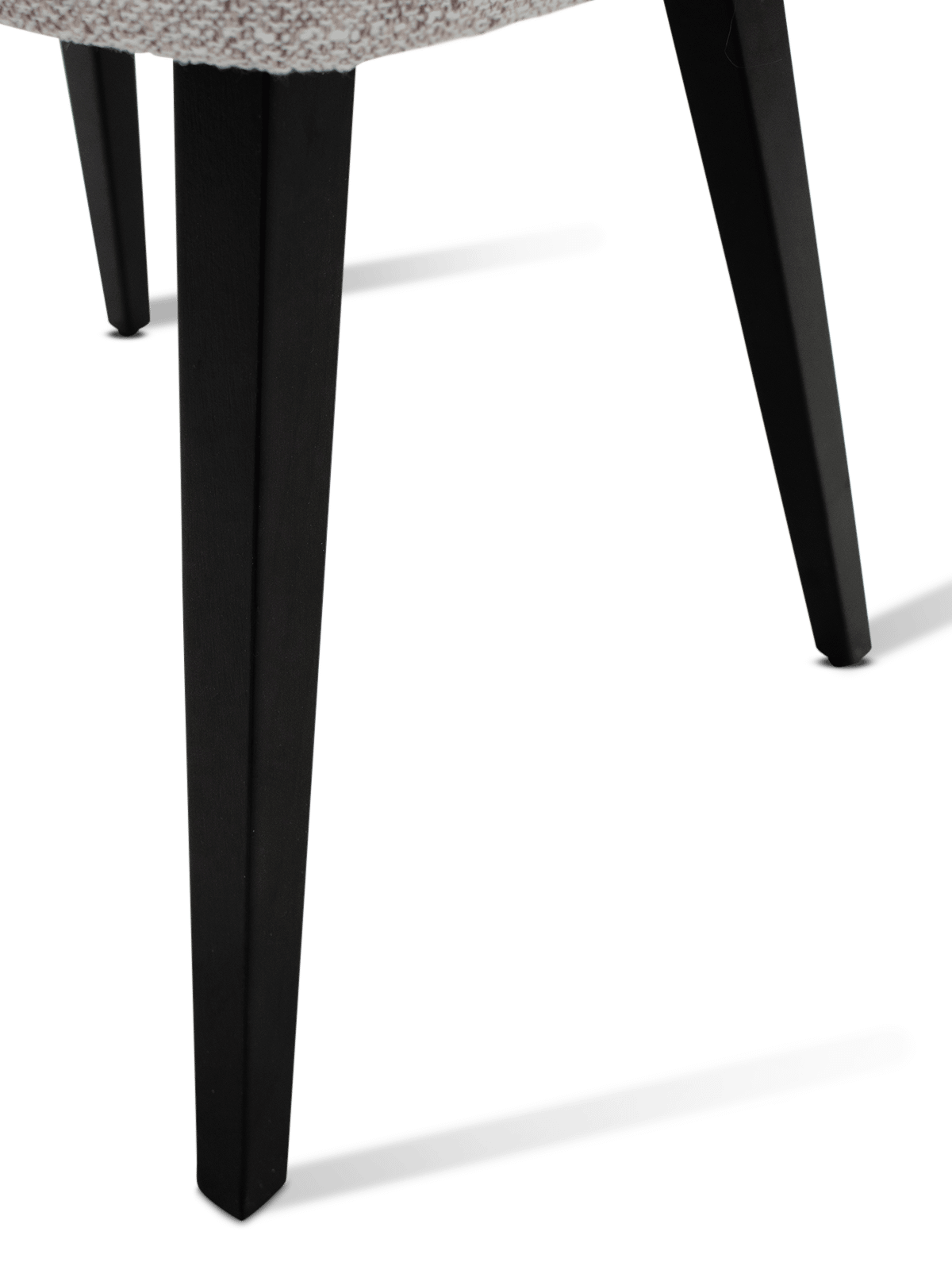 De vierkante houten poten in wengé zorgen voor een stijlvol contrast met de lichte bekleding. Ze geven de stoel een stevige basis en een iets strakkere look, waardoor het geheel mooi in balans blijft. Het resultaat: een stoel die elegant oogt, maar tegelijk gemaakt is voor dagelijks gebruik.