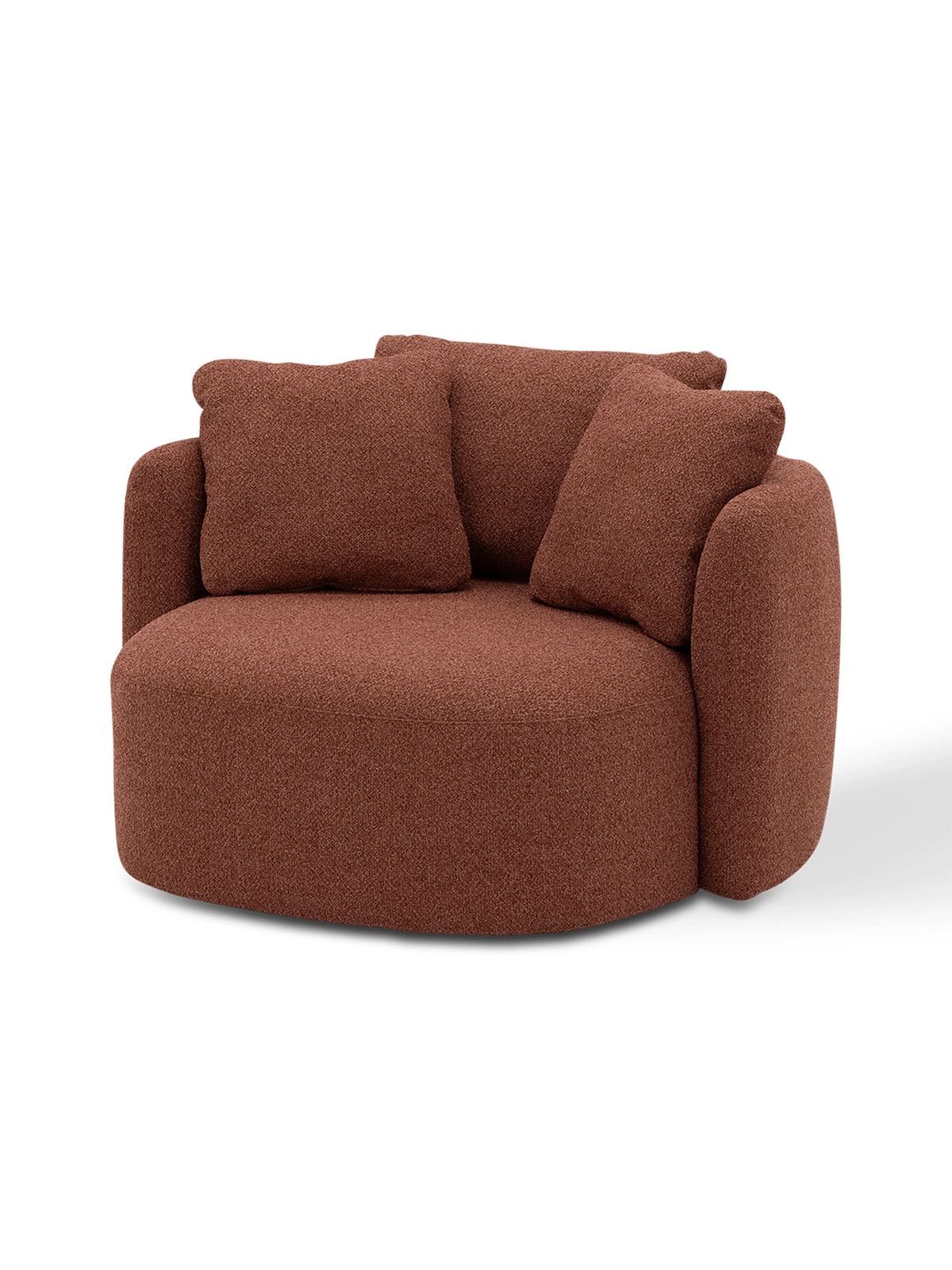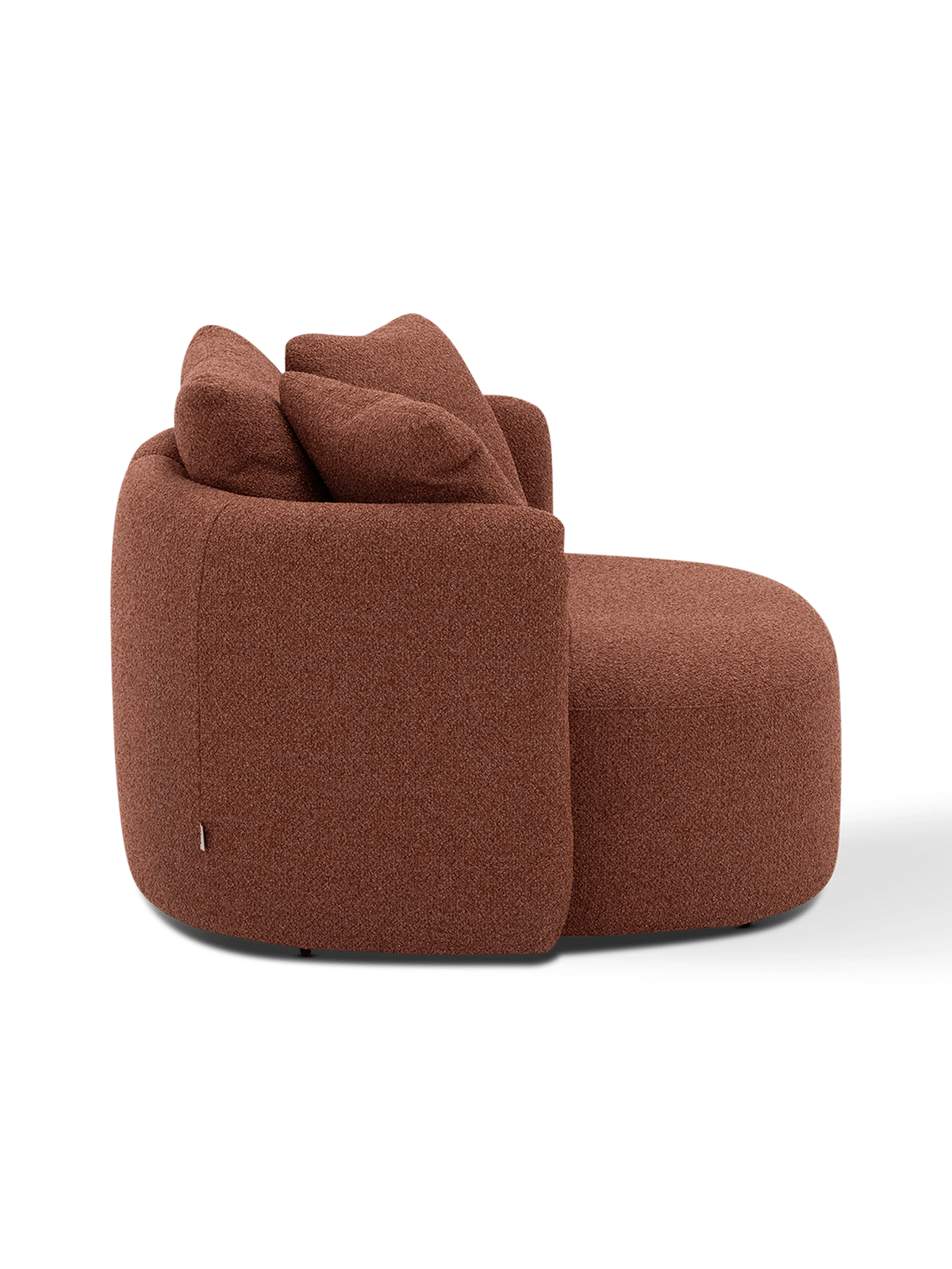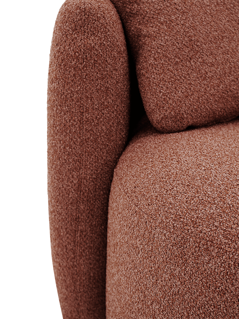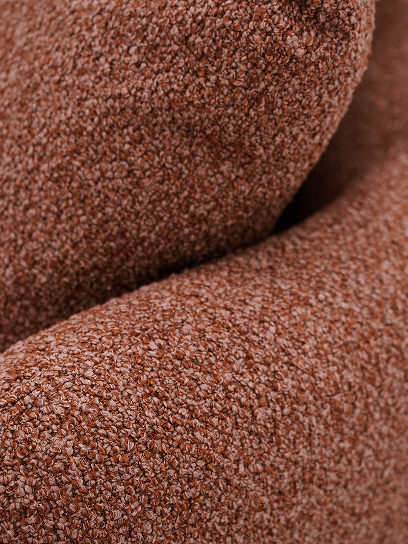 De uitvoering in een warme terracottastof versterkt het cosy gevoel en geeft deze fauteuil een moderne, sfeervolle uitstraling die past in zowel eigentijdse als meer natuurlijke interieurs.