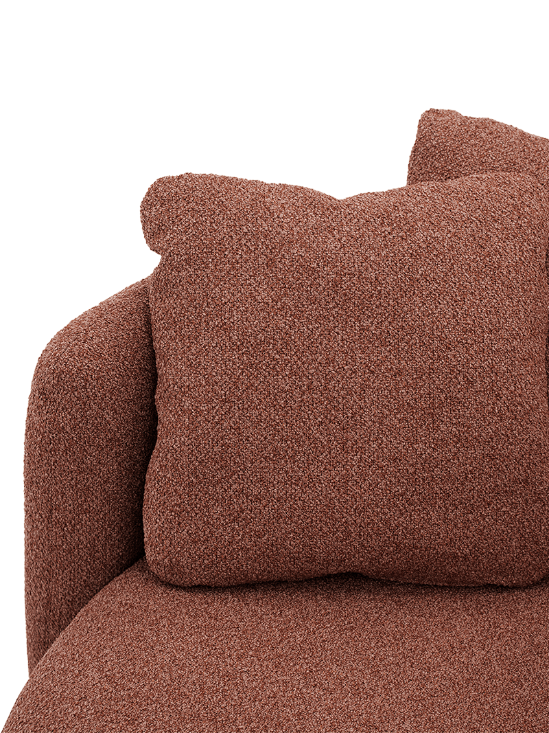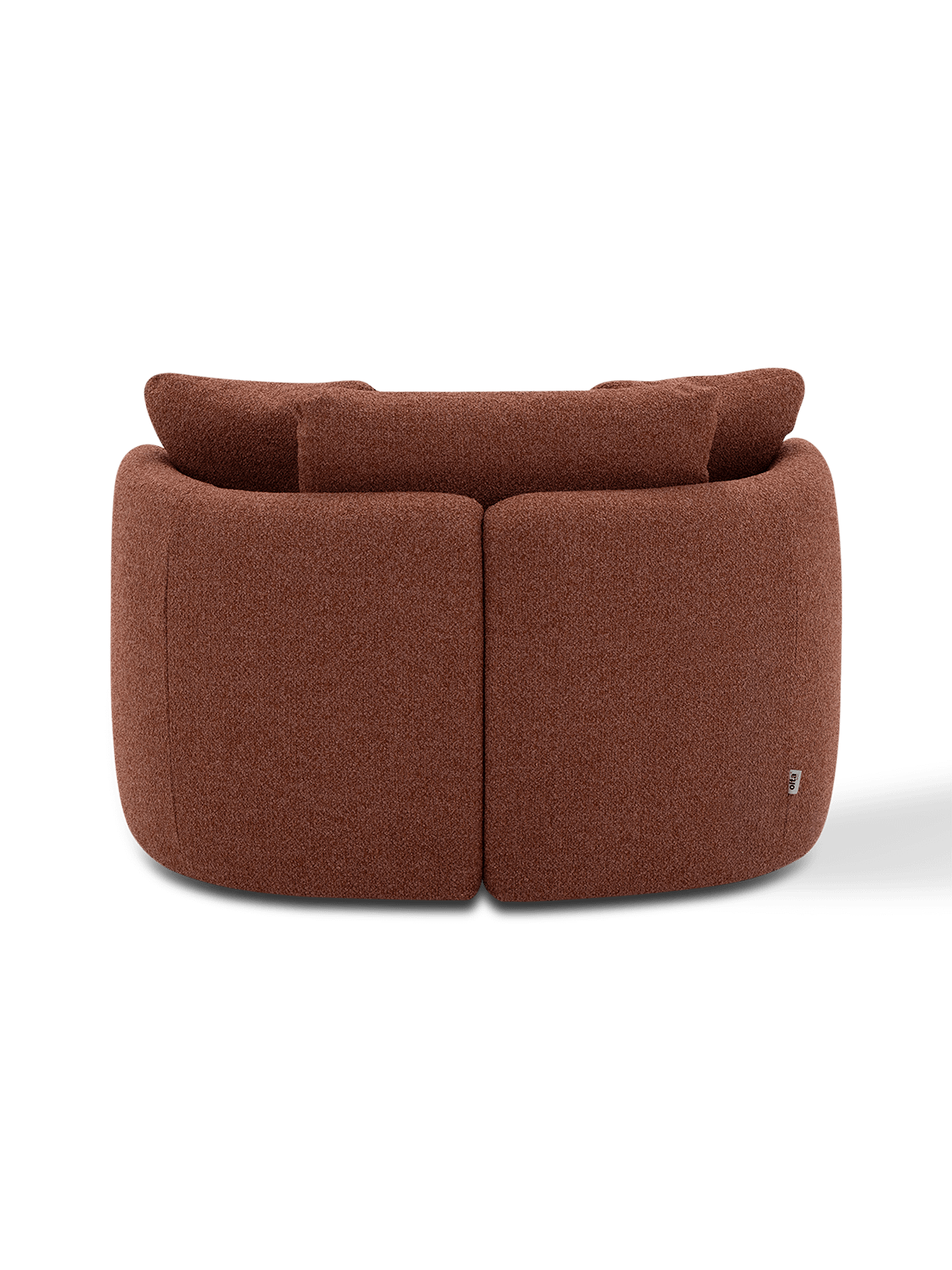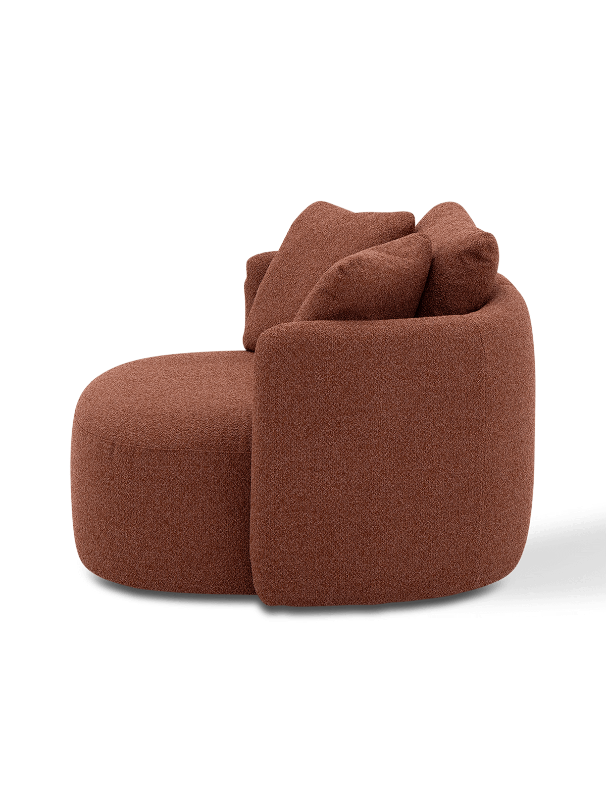 De uitvoering in een warme terracottastof versterkt het cosy gevoel en geeft deze fauteuil een moderne, sfeervolle uitstraling die past in zowel eigentijdse als meer natuurlijke interieurs.