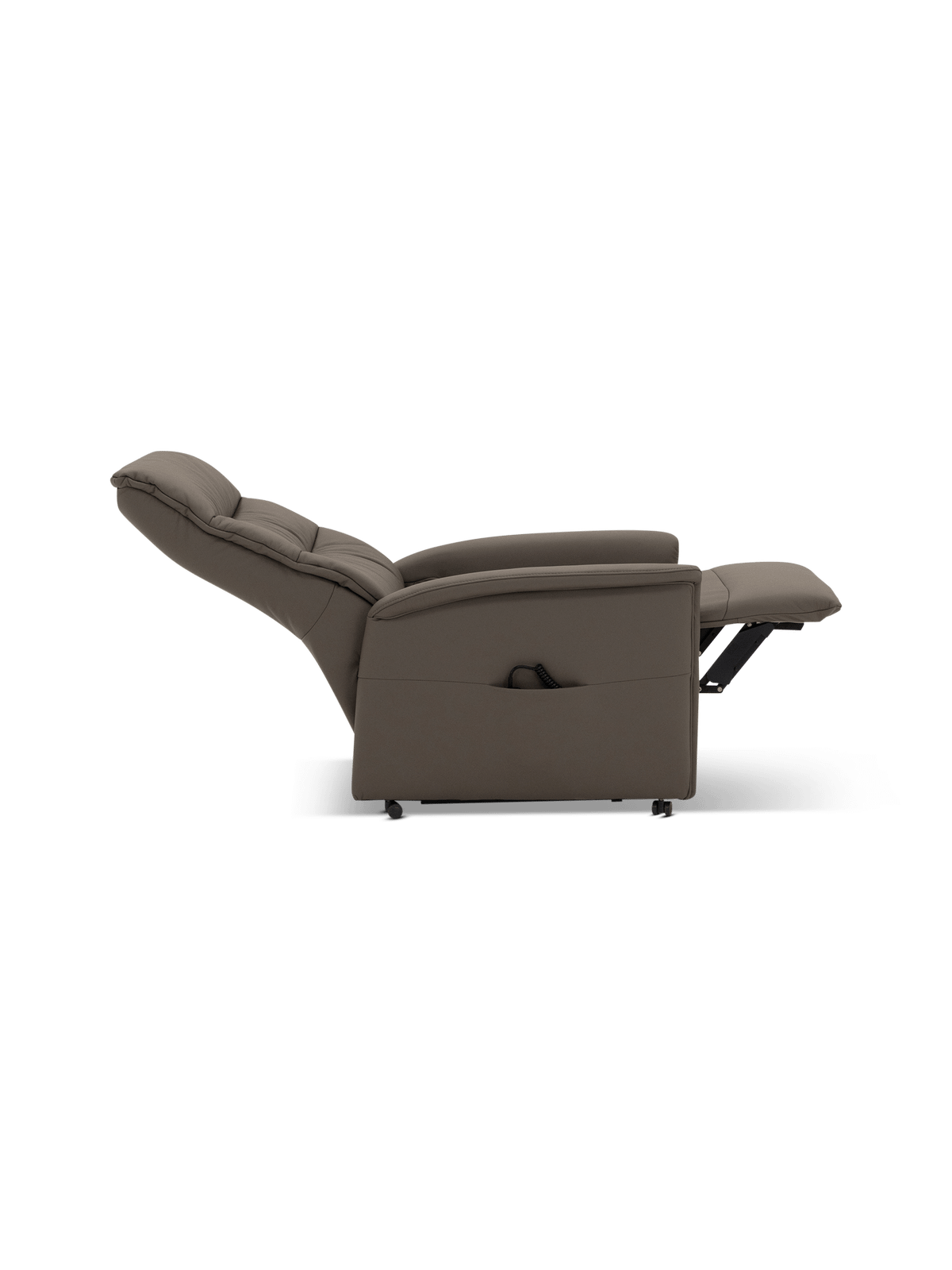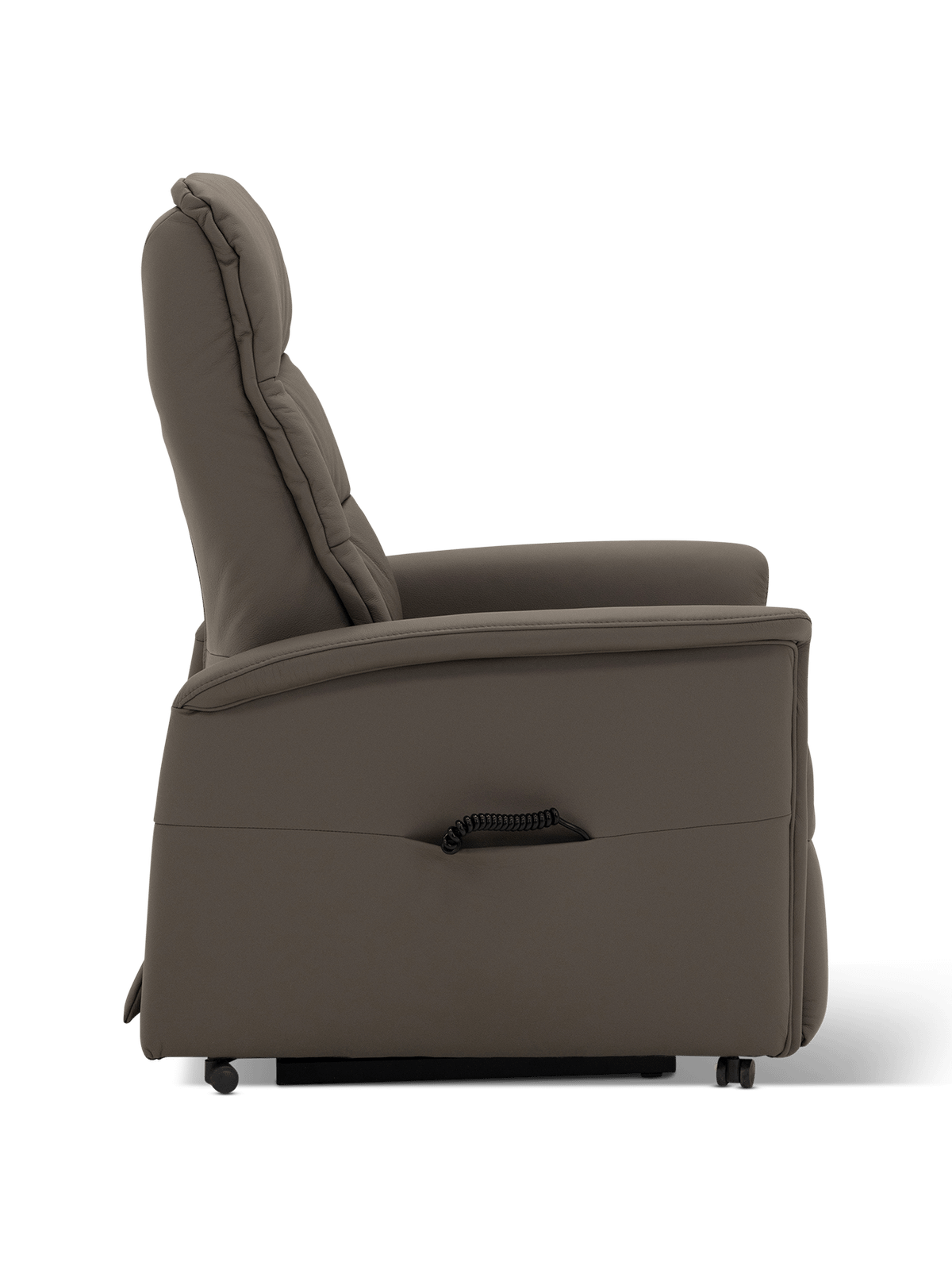 De geïntegreerde wieltjes maken de fauteuil eenvoudig verplaatsbaar, bijvoorbeeld van woonkamer naar zithoek, terwijl de afstandbediening binnen handbereik blijft via het discreet geïntegreerde opbergvak.