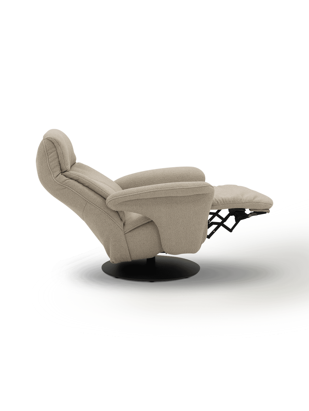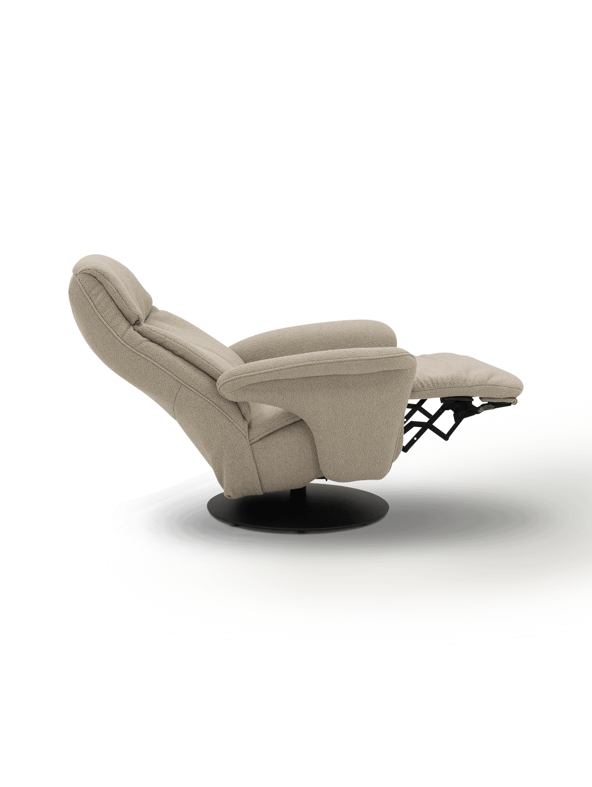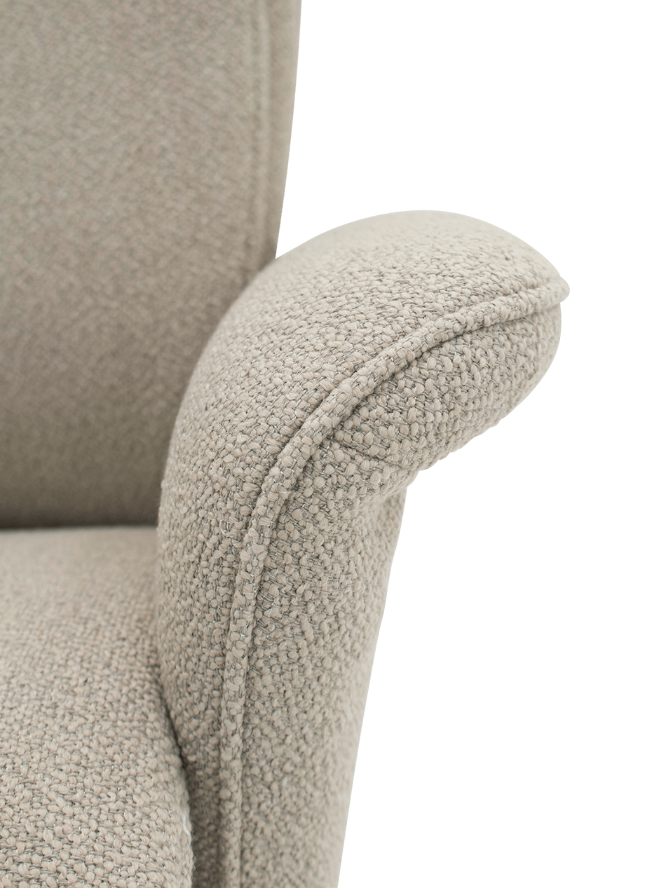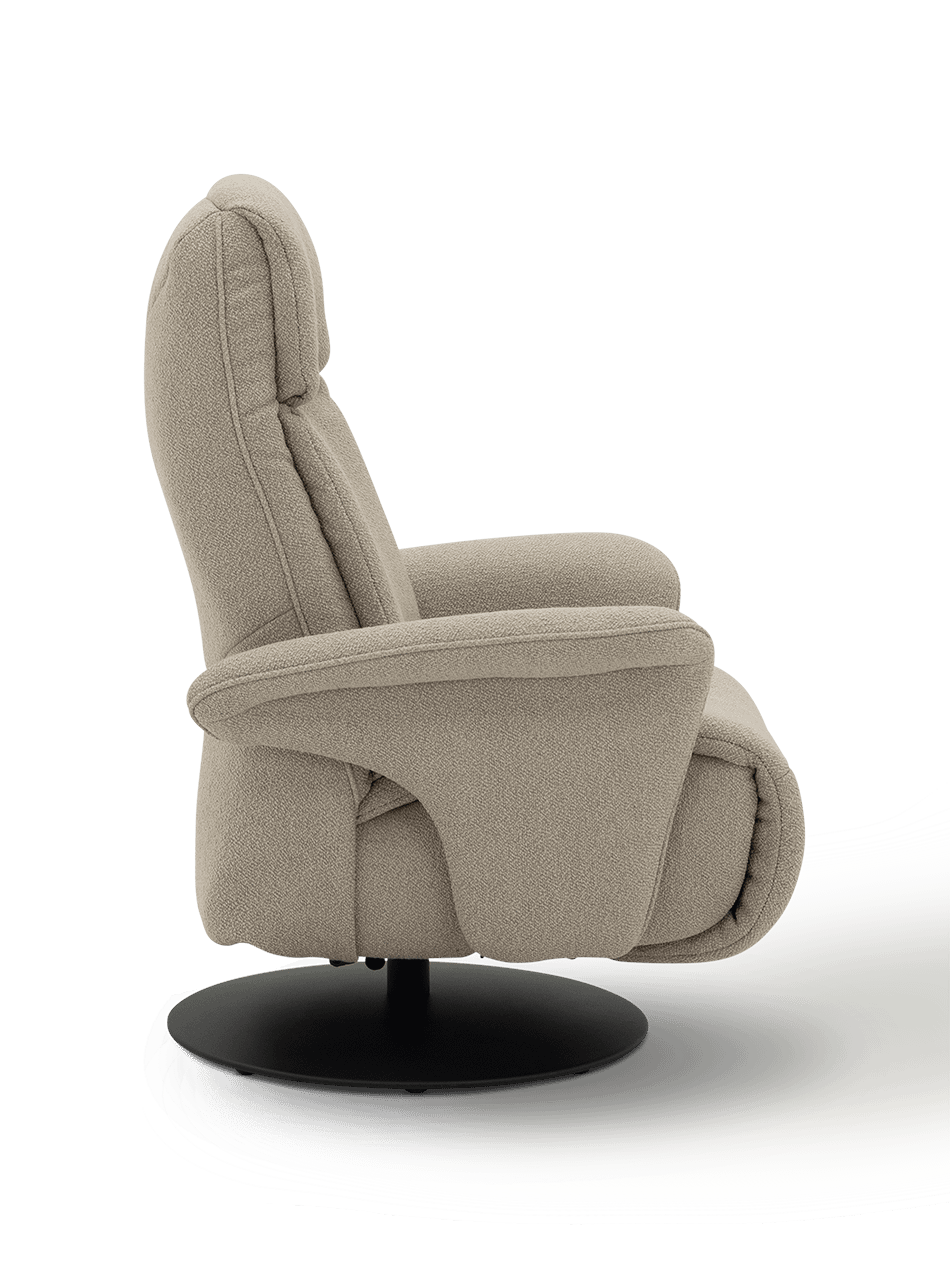 De rugleuning en voetensteun worden manueel bediend met een soepele hendel aan de zijkant. Zo bepaal je zelf moeiteloos jouw favoriete relaxpositie — van rechtop lezen tot volledig achterover ontspannen. Dankzij het uitgebalanceerde mechanisme beweegt de fauteuil in één vloeiende beweging.