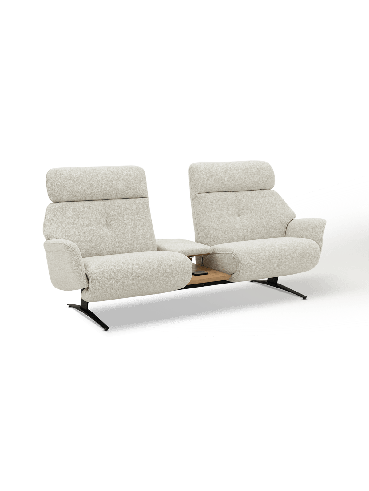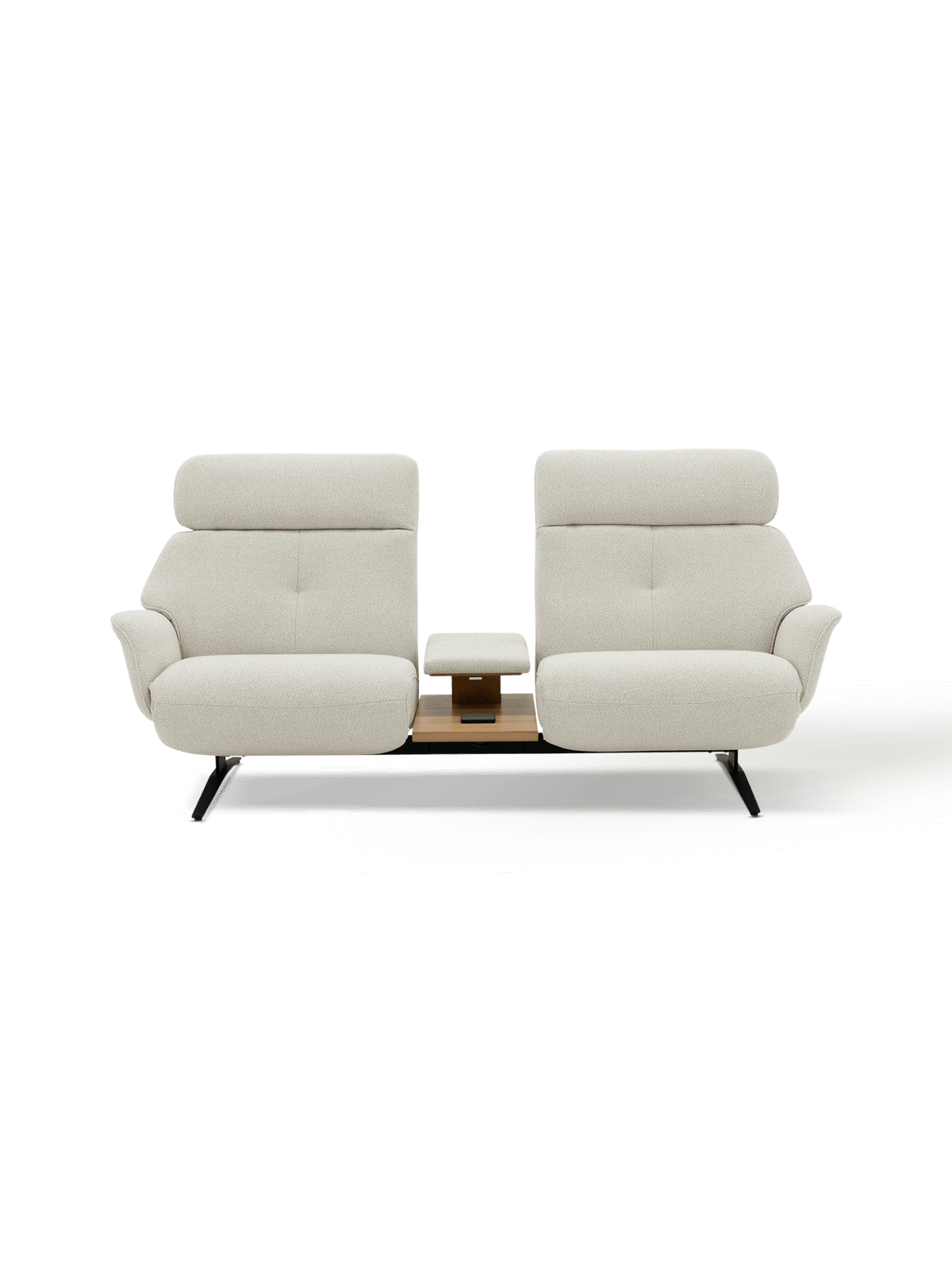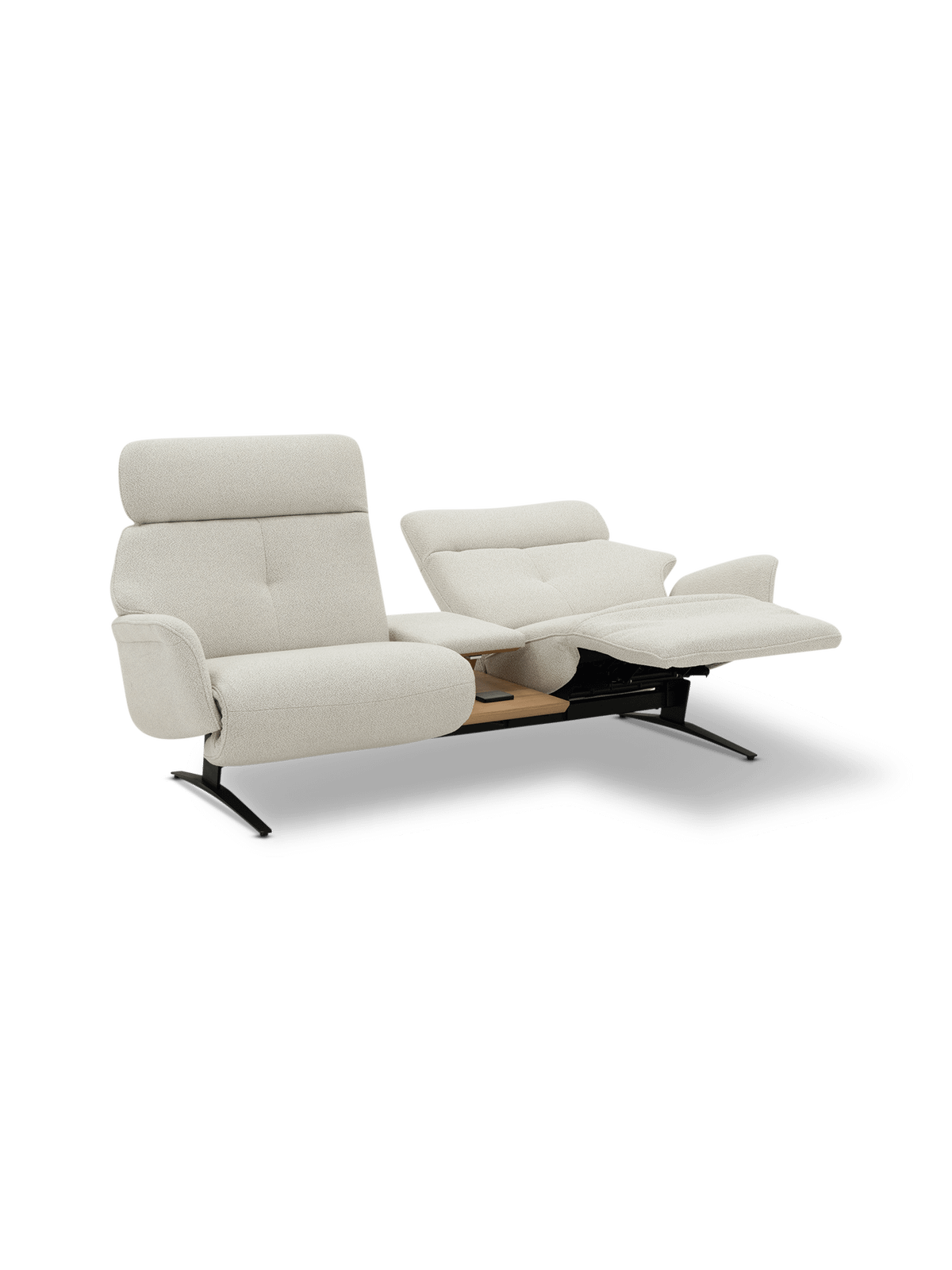 De Ceyla gaat verder dan comfort alleen: het houten middenelement biedt extra functionaliteit met een geïntegreerde tafel, USB-aansluiting en stopcontact en LED-verlichting voor een warme sfeer. Bovendien kan deze 2-zit worden uitgerust met een externe batterij, zodat je van alle elektrische functies kunt genieten zonder storende kabels.