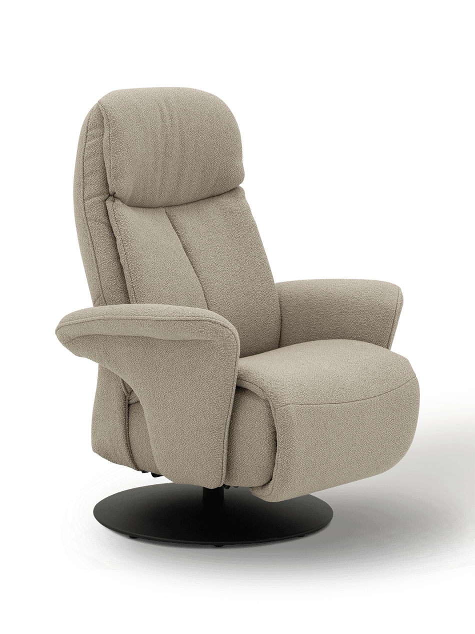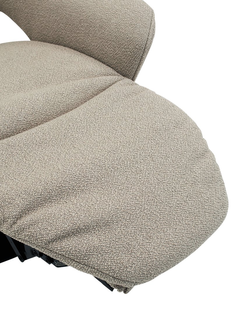 De rugleuning en voetensteun worden manueel bediend met een soepele hendel aan de zijkant. Zo bepaal je zelf moeiteloos jouw favoriete relaxpositie — van rechtop lezen tot volledig achterover ontspannen. Dankzij het uitgebalanceerde mechanisme beweegt de fauteuil in één vloeiende beweging.