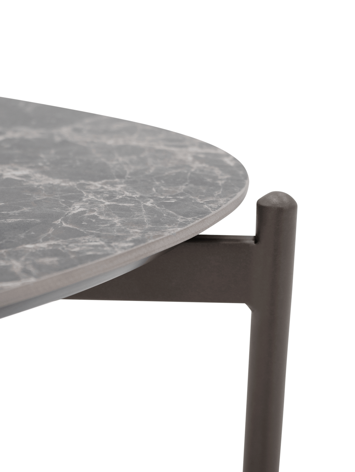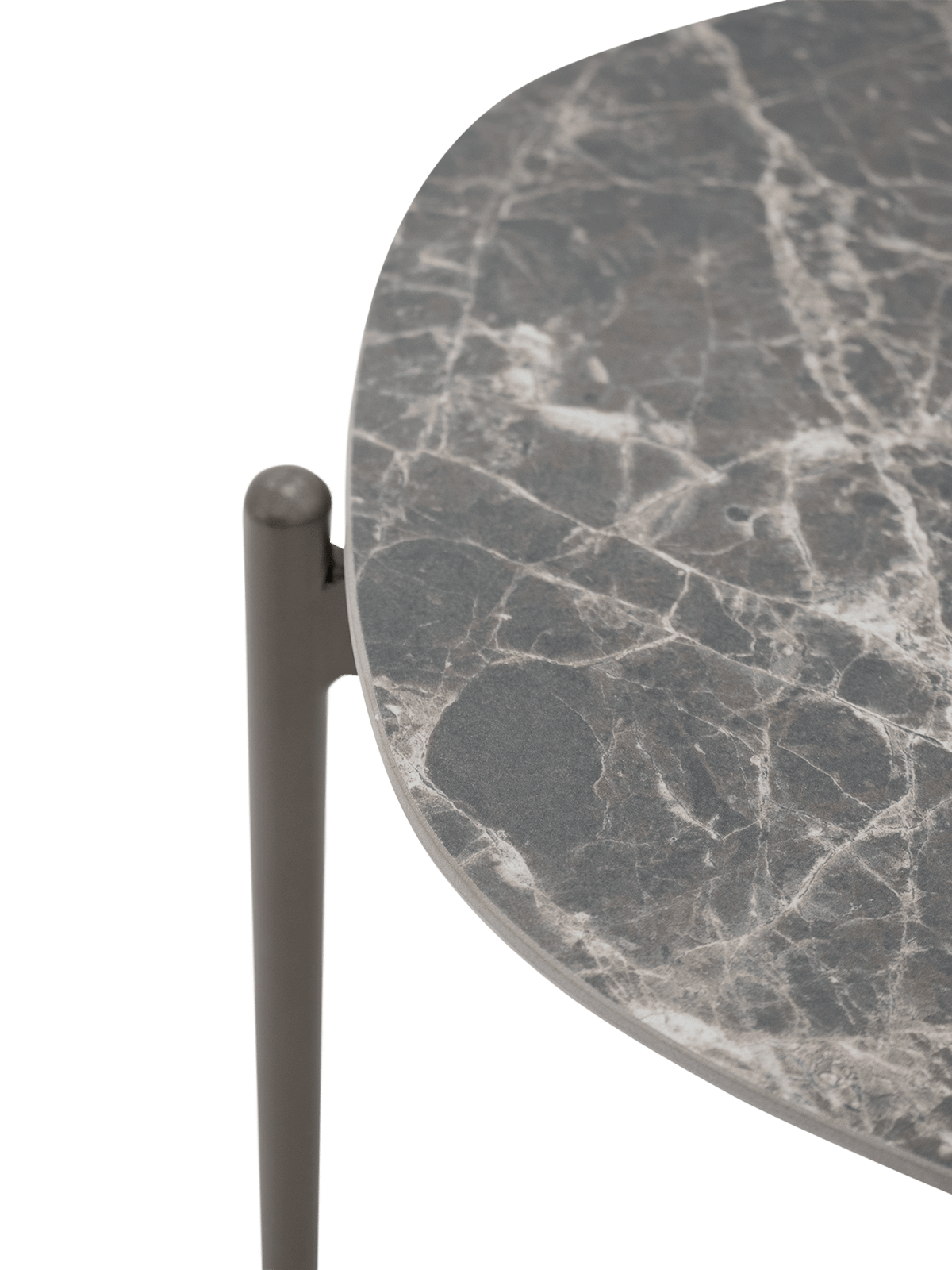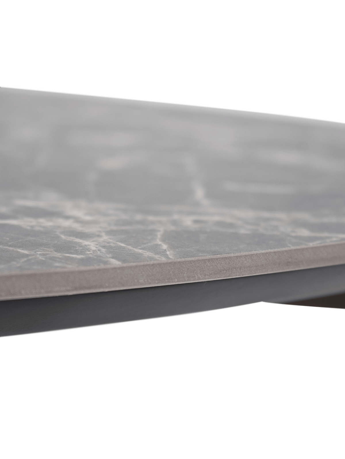 De bijzettafel Pesaro valt op door haar organisch afgeronde blad en elegante uitstraling. Het donkere keramische oppervlak weerspiegelt een subtiele marmerstructuur en brengt een vleugje verfijning in elke woonkamer. In combinatie met het strakke metalen onderstel vormt dit ontwerp een harmonieus geheel.