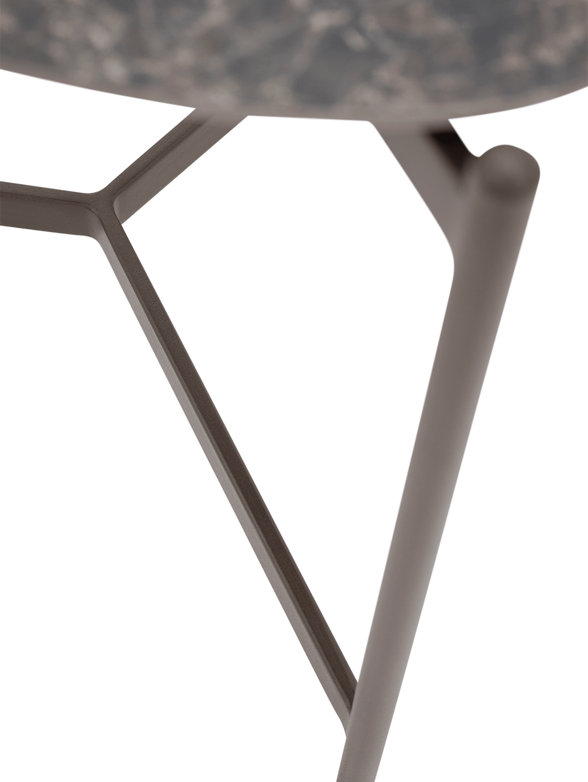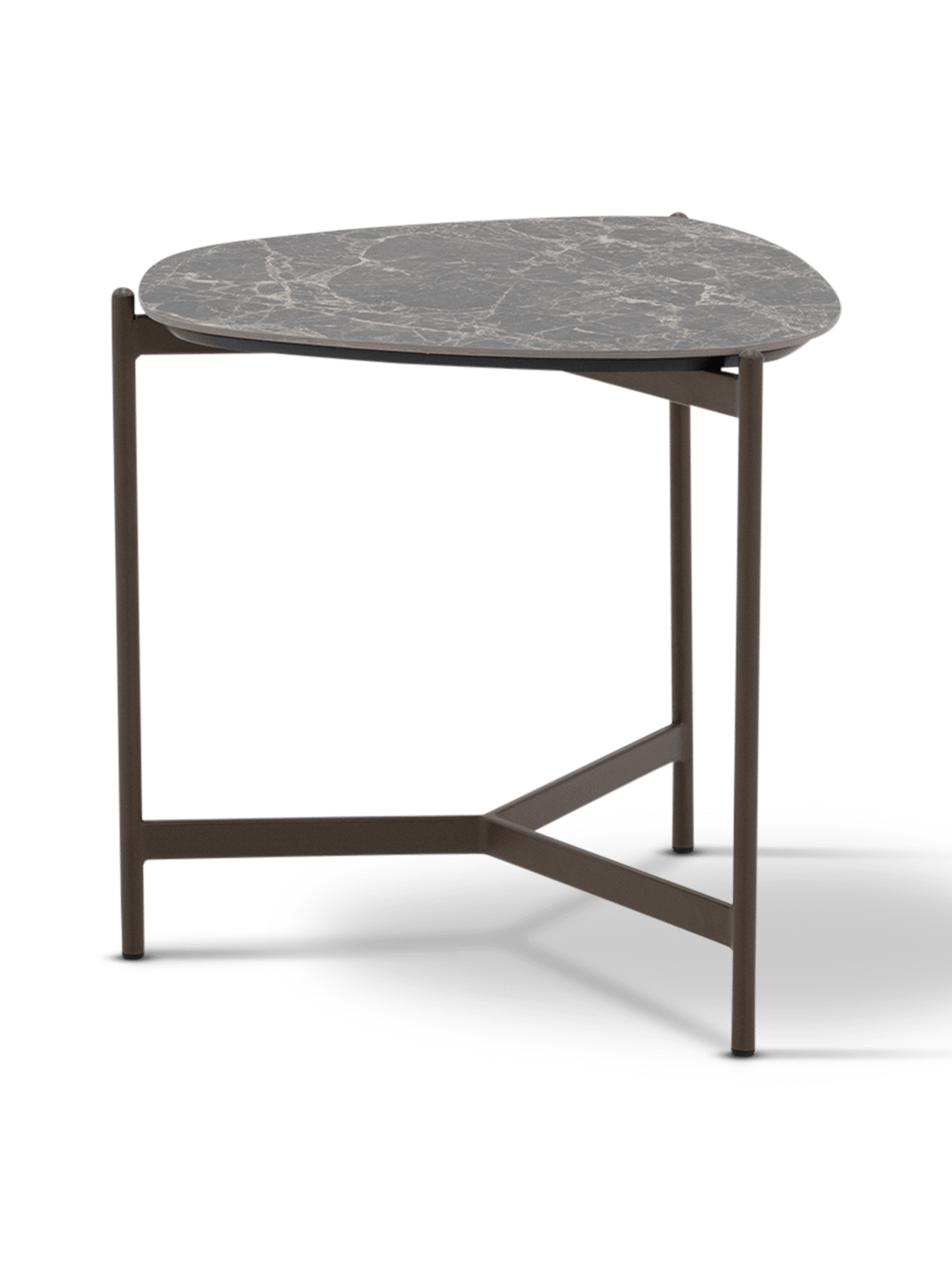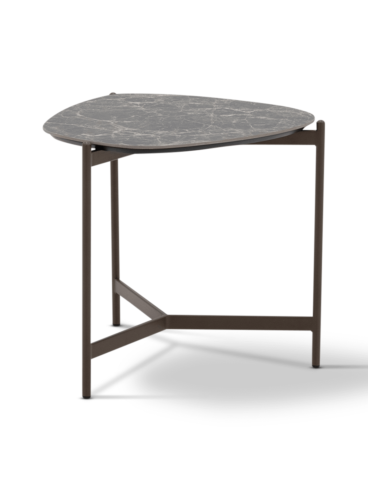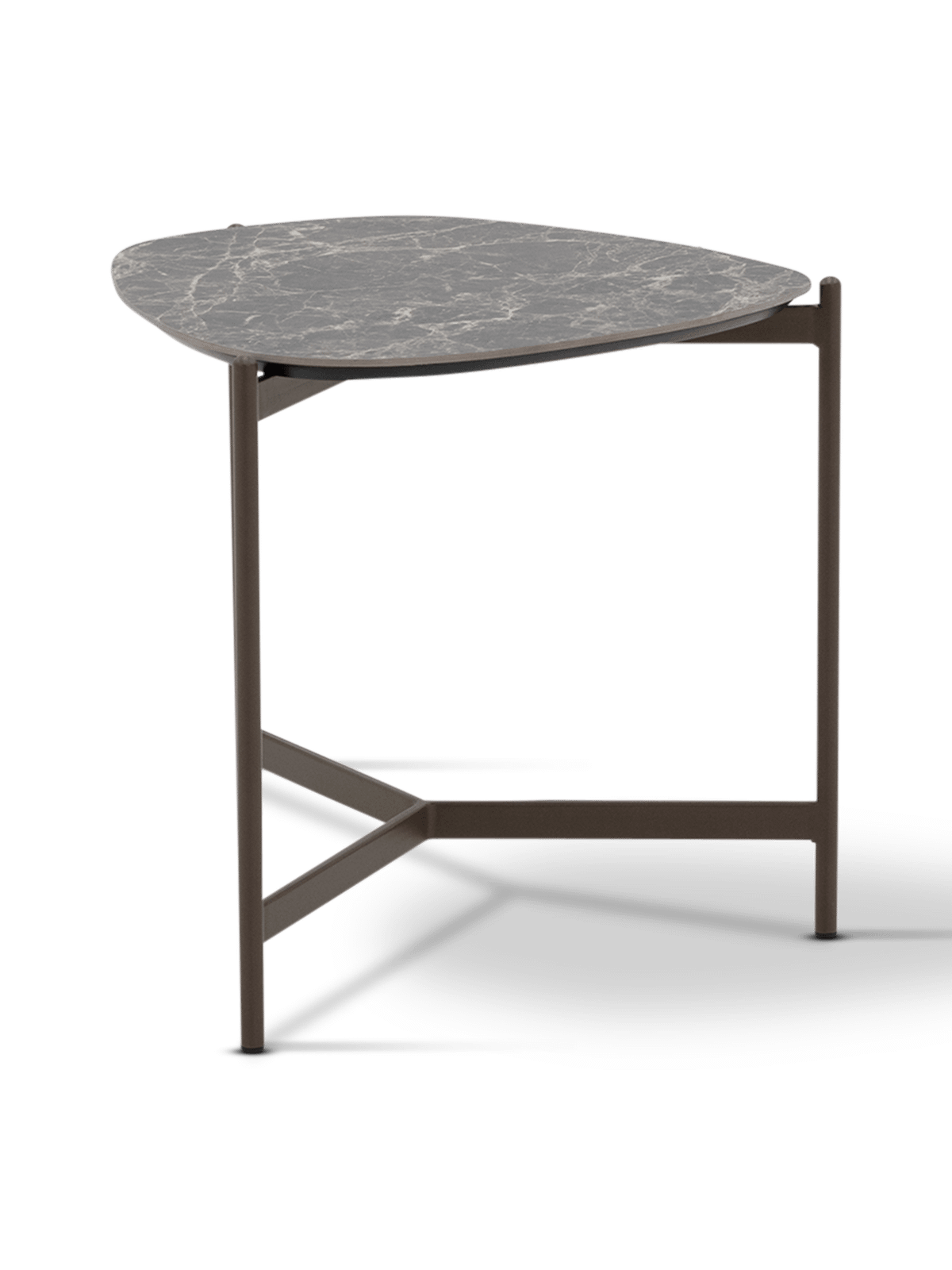 De bijzettafel Pesaro valt op door haar organisch afgeronde blad en elegante uitstraling. Het donkere keramische oppervlak weerspiegelt een subtiele marmerstructuur en brengt een vleugje verfijning in elke woonkamer. In combinatie met het strakke metalen onderstel vormt dit ontwerp een harmonieus geheel.