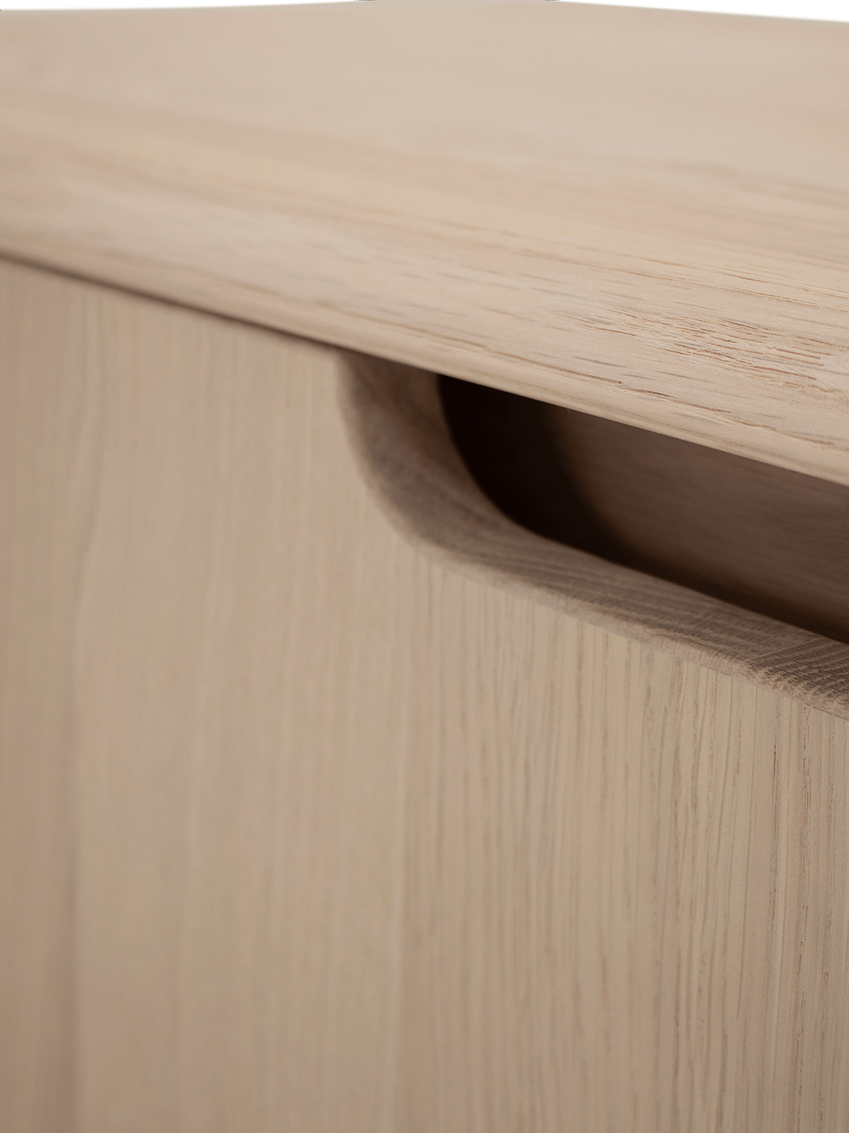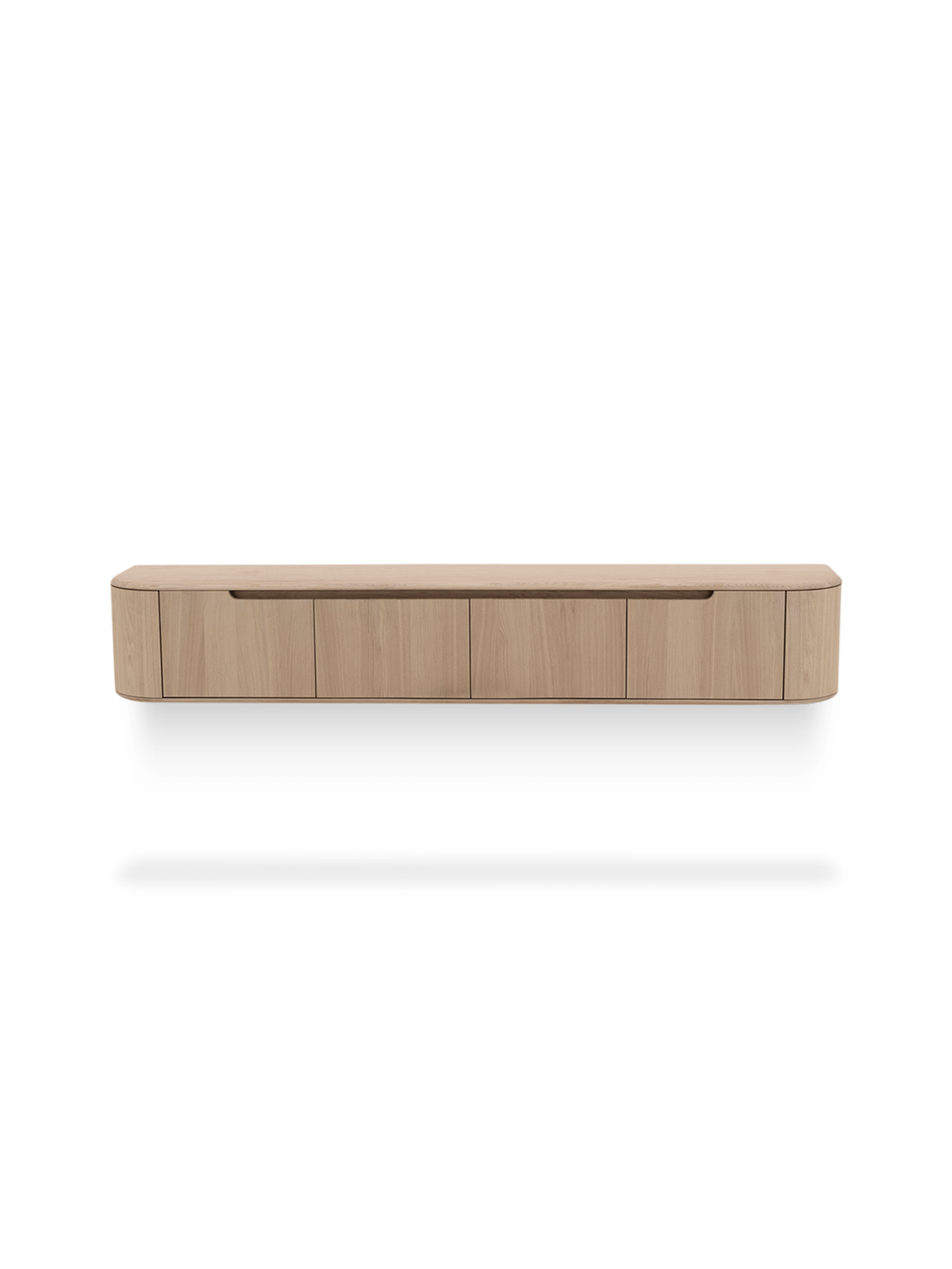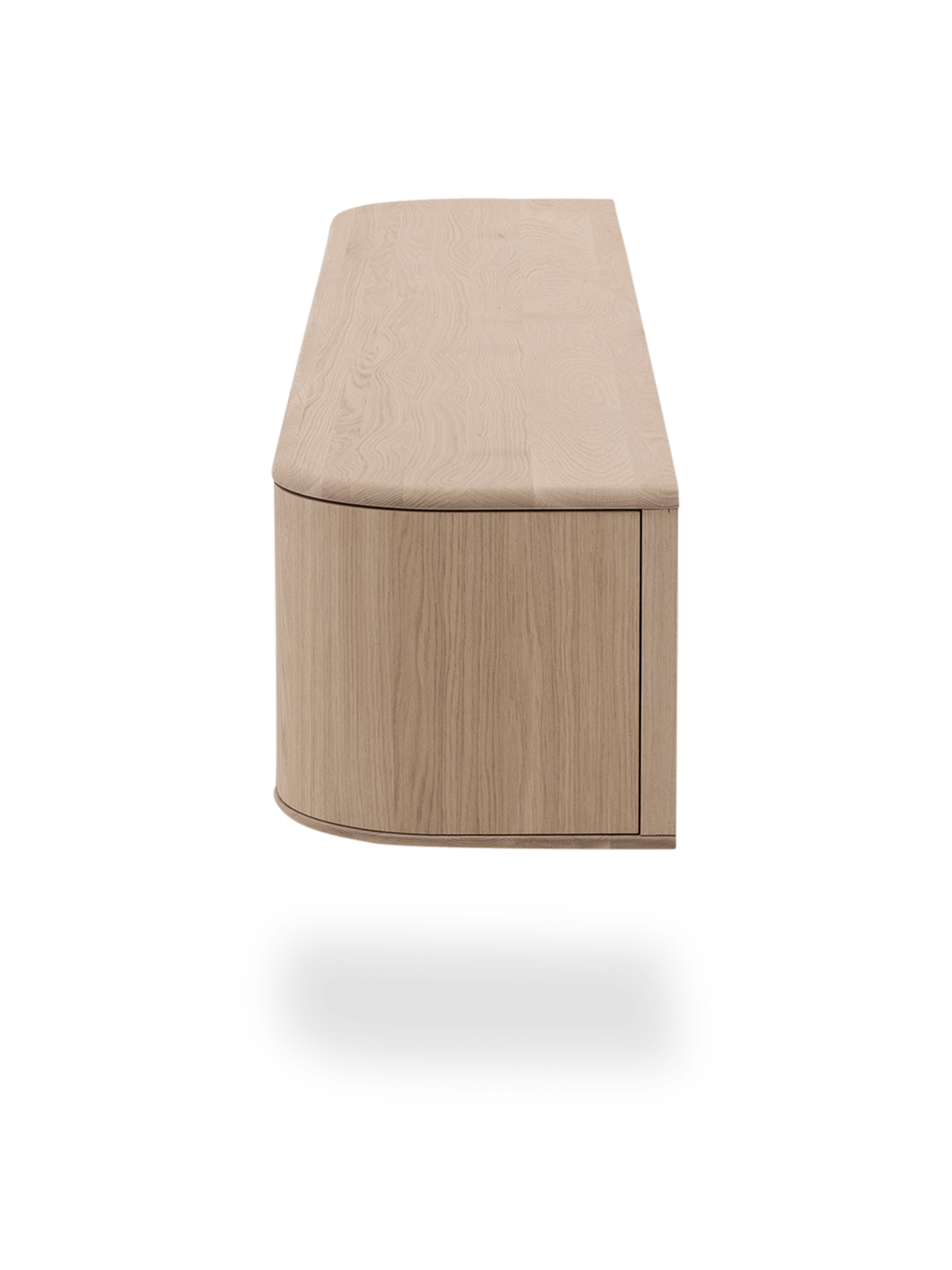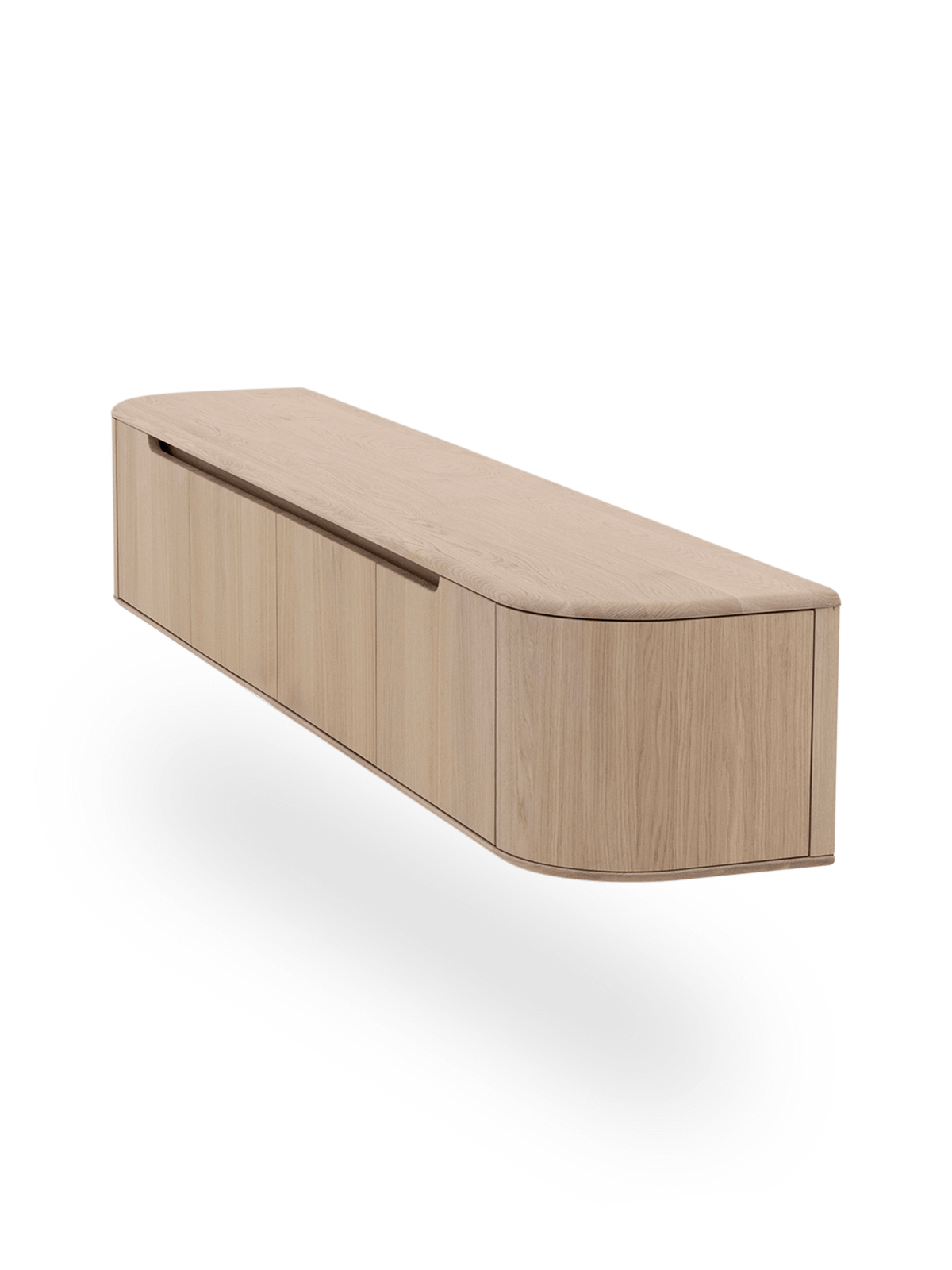 Het hangende tv-meubel June brengt rust en verfijning in je interieur. De afgeronde vormen, het natuurlijke lichte hout en de perfect geïntegreerde greepuitsparingen zorgen voor een tijdloze uitstraling. Dankzij het zwevende ontwerp lijkt het meubel licht en elegant, terwijl het toch een solide, luxueuze indruk achterlaat.