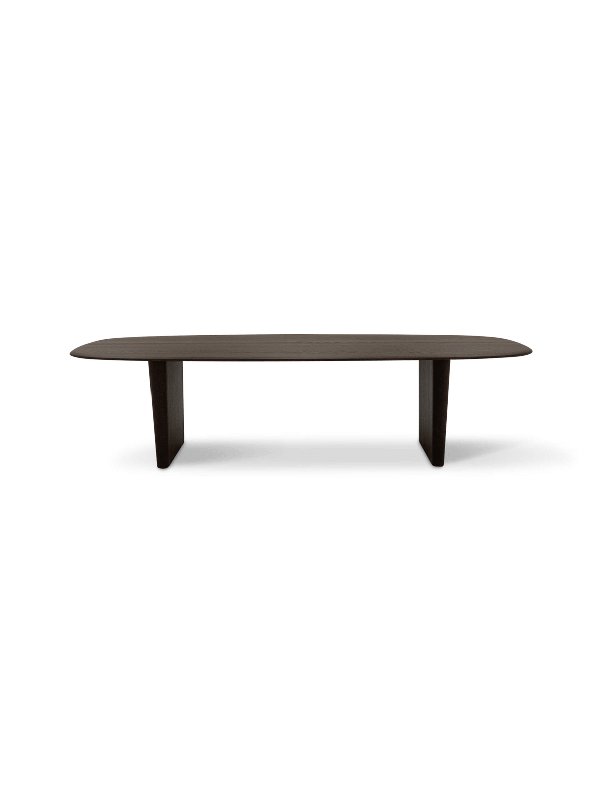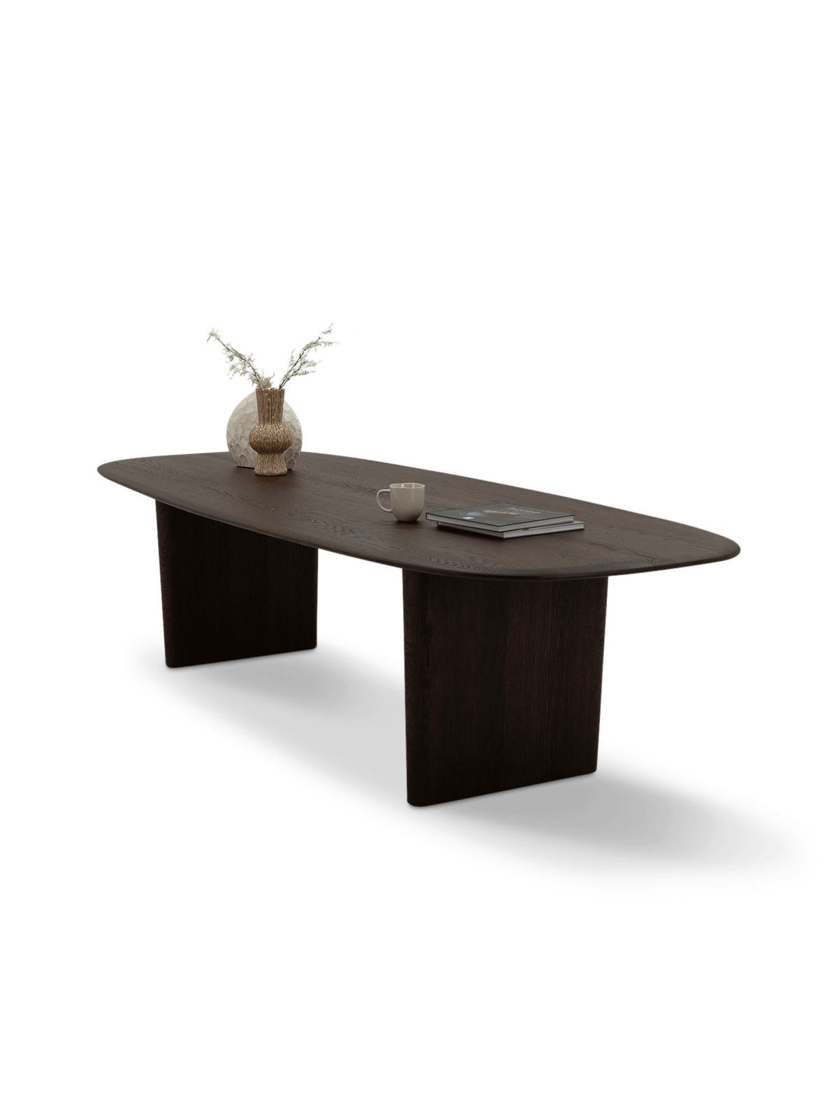 Met afmetingen van 300 x 120 cm biedt Deen T plaats aan familie en vrienden zonder aan elegantie in te boeten. De twee gebogen poten dragen het ovale blad (3 cm dik) op een manier die zowel stevig als verfijnd oogt. De afgeronde lijnen geven het ontwerp een organische zachtheid, terwijl het donkere hout zorgt voor een moderne, luxueuze uitstraling.