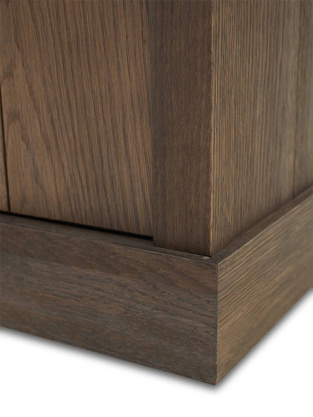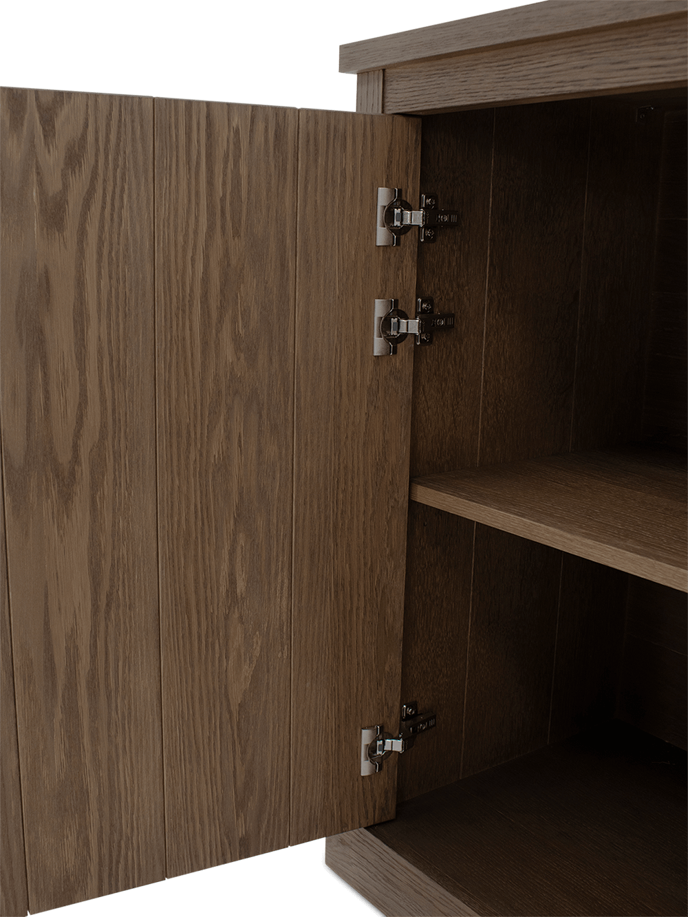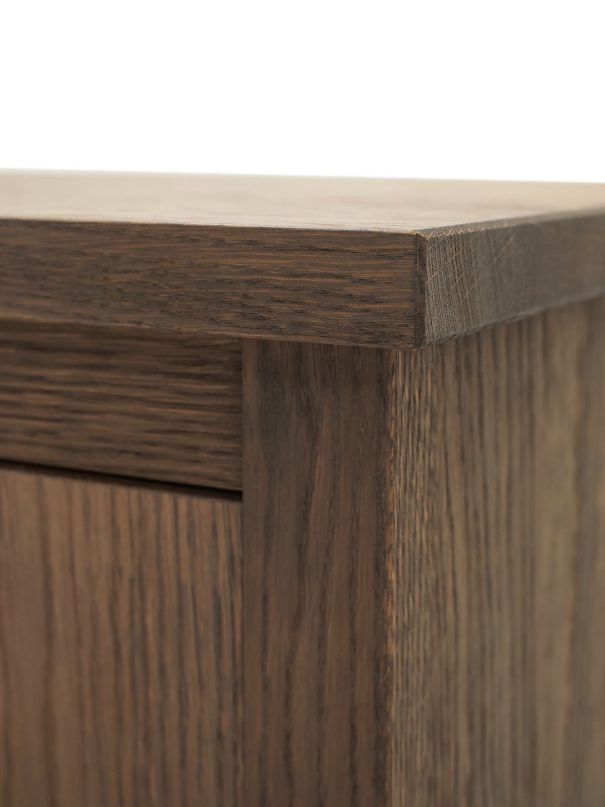 Het dressoir Portland Gold belichaamt de essentie van Belgisch vakmanschap. Elk meubel wordt met zorg vervaardigd in een eigen atelier, waar kwaliteit en afwerking op het hoogste niveau staan. De kast is volledig opgebouwd uit massief eikenhout met een gerookte afwerking, wat zorgt voor een warme, natuurlijke uitstraling met een hedendaagse toets.