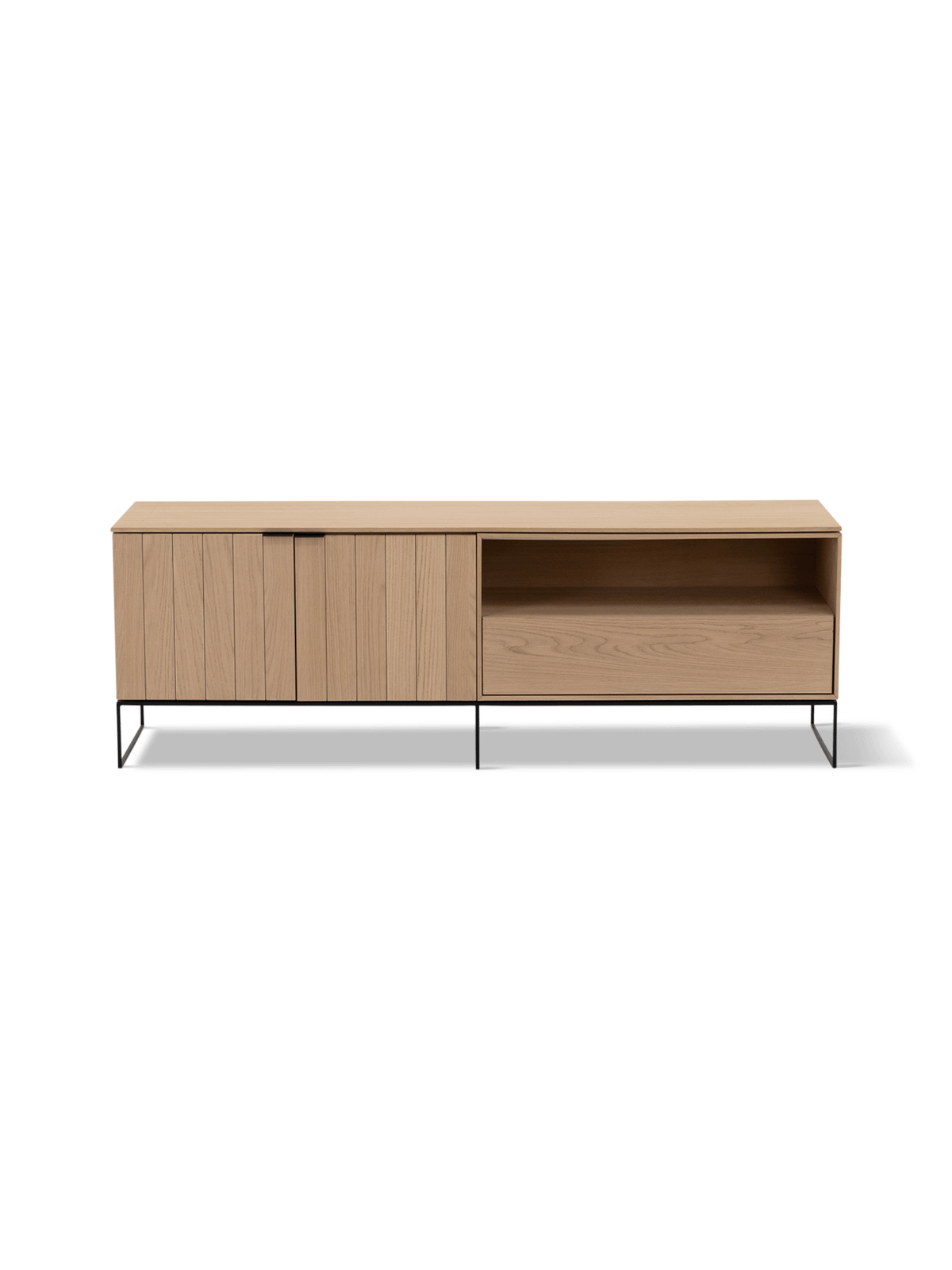 De verfijnde verticale belijning en de ranke metalen poten zorgen voor een moderne, lichte uitstraling. Net als de andere meubels uit de Samir-collectie wordt dit tv-meubel met zorg vervaardigd in massieve eik volgens Belgische traditie, en is het verkrijgbaar in verschillende afmetingen, houtkleuren en afwerkingen. Zo past Samir zich moeiteloos aan jouw interieur aan.