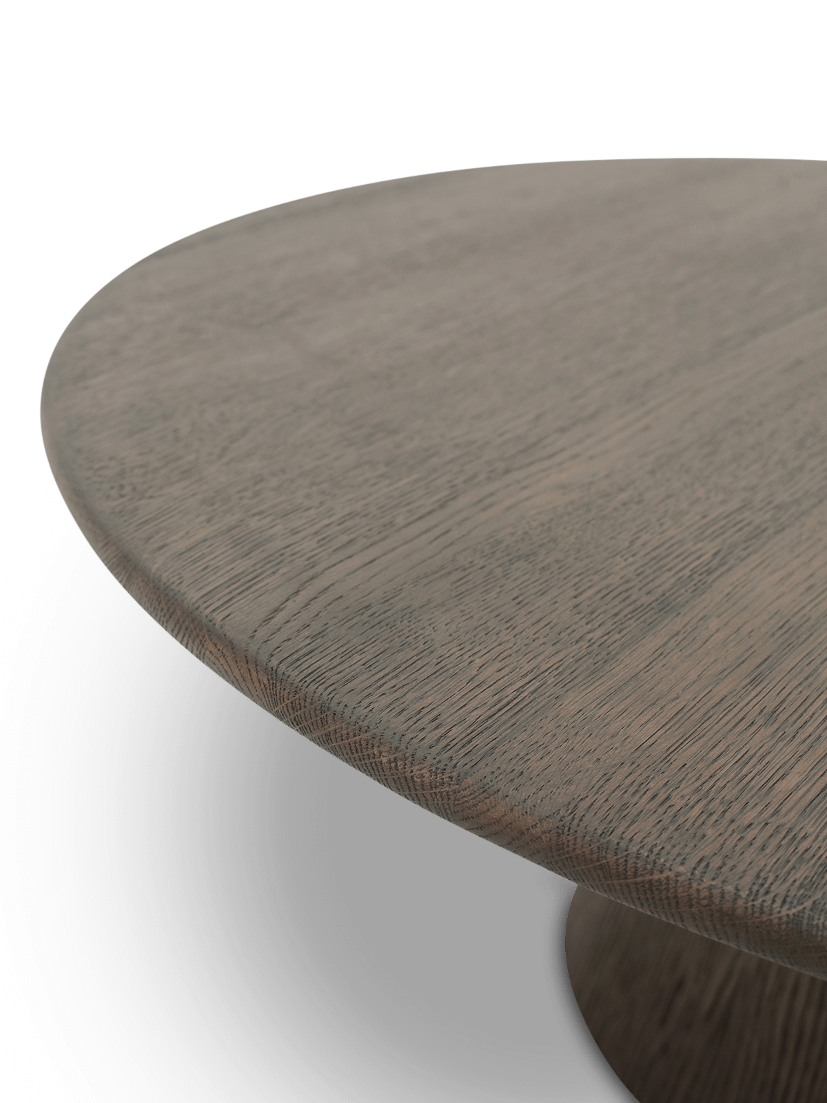 De salontafel Globe A van Robu is een toonbeeld van verfijnd design en vakmanschap. Met zijn ronde vorm en diameter van 90 cm vormt deze tafel het hart van je zithoek. Het massieve eikenhout, afgewerkt in een walnut beits, zorgt voor een warme en rokerige uitstraling die moeiteloos combineert met verschillende interieurstijlen.
