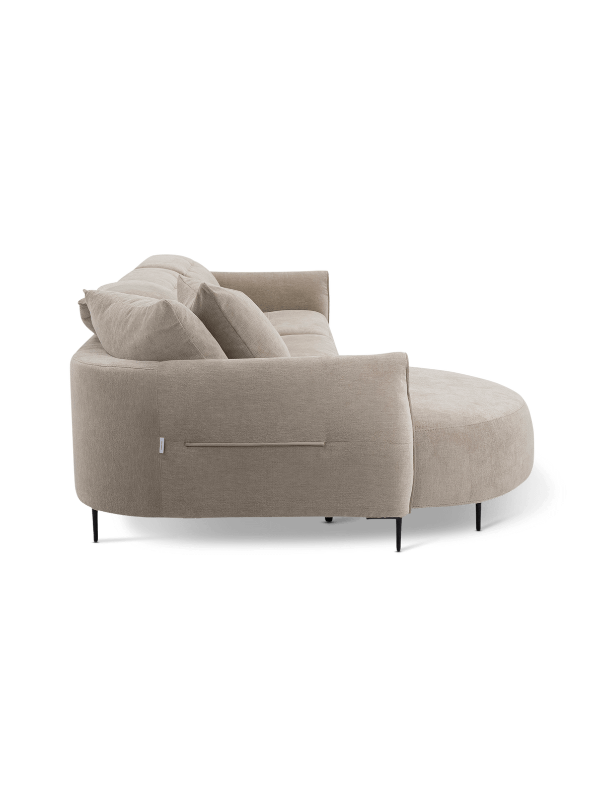 Het afgeronde lounge-/hoekeiland geeft de sofa een uitgesproken moderne uitstraling en nodigt uit om languit te ontspannen. De royale kussens en de uitgepuurde stoffering in fluweel zorgen voor een luxueus gevoel zonder te domineren in de ruimte.