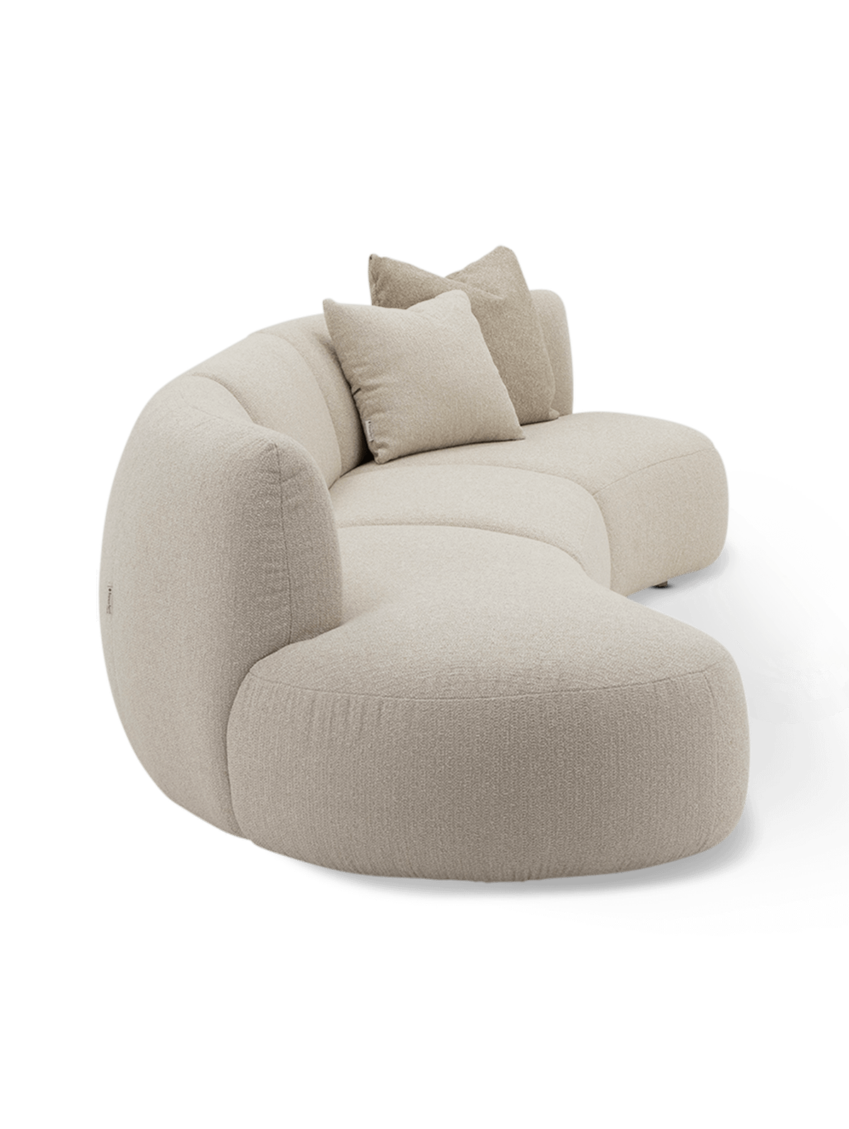 Hoeksalon Eleni biedt een harmonieuze balans tussen comfort en structuur. De kussens zijn zacht maar veerkrachtig, wat zorgt voor langdurige ondersteuning zonder in te boeten aan zachtheid. Dankzij de lichte ronding van de zetel ontstaat een subtiel speels effect dat het geheel luchtig en modern houdt.