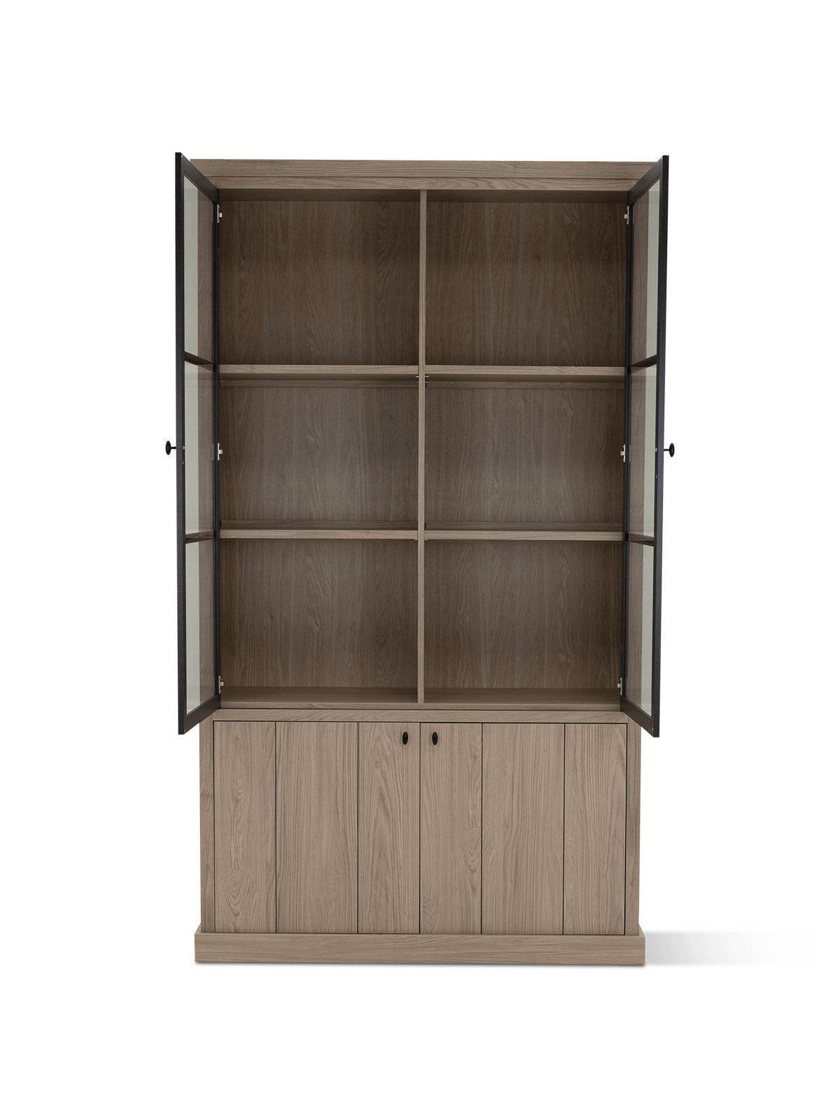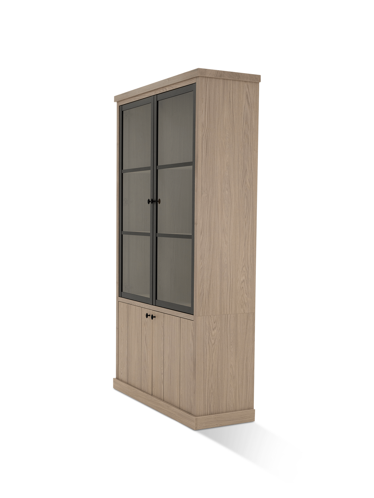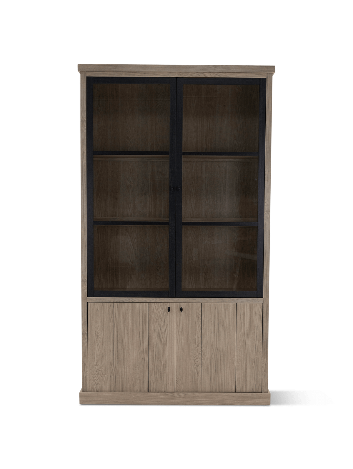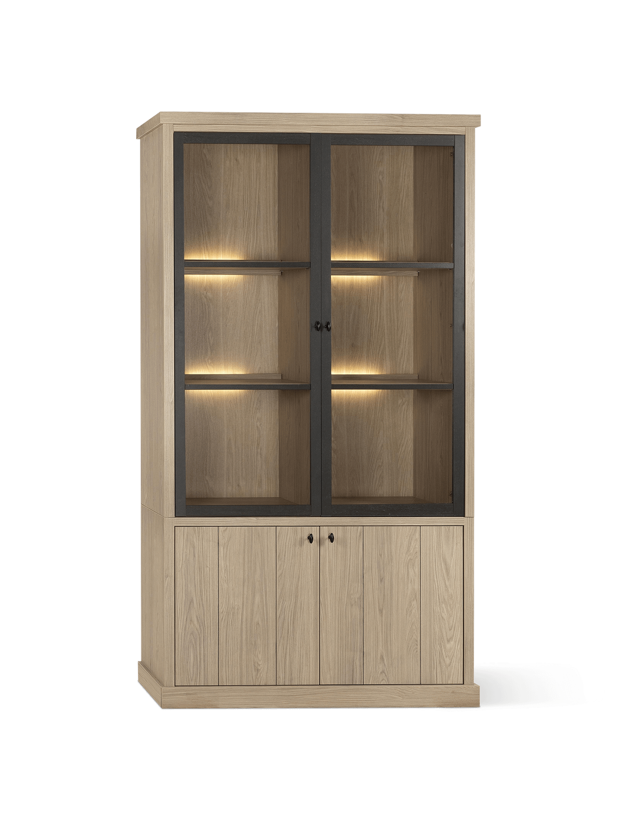 De kast heeft twee glazen deuren bovenaan – ideaal om servies, decoratie of glaswerk stijlvol te presenteren – en twee gesloten deuren onderaan voor praktische opbergruimte. De zwarte accenten rond de glasdeuren geven het meubel een eigentijdse toets en versterken het contrast met de lichte houtkleur.