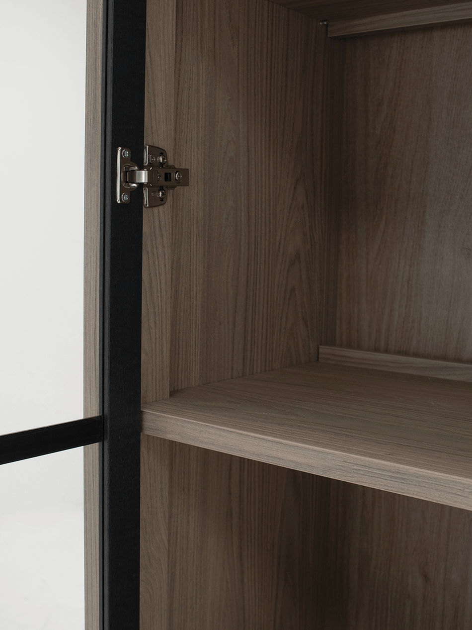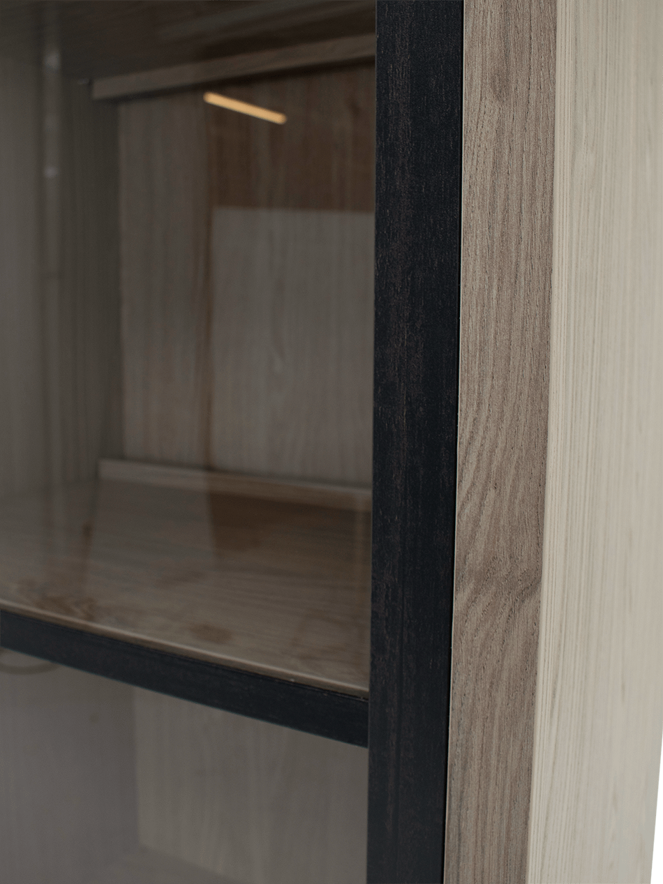 De subtiele ronde knopgrepen en het evenwichtige ontwerp zorgen voor een rustige, uitgebalanceerde look. De kast is bovendien compatibel met LED-verlichting (niet inbegrepen), zodat je de inhoud extra kunt laten schitteren in een warme, gezellige sfeer.