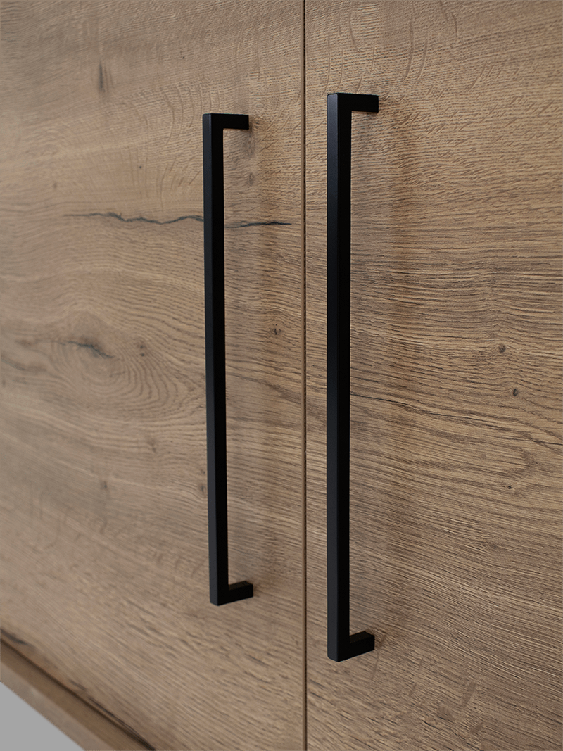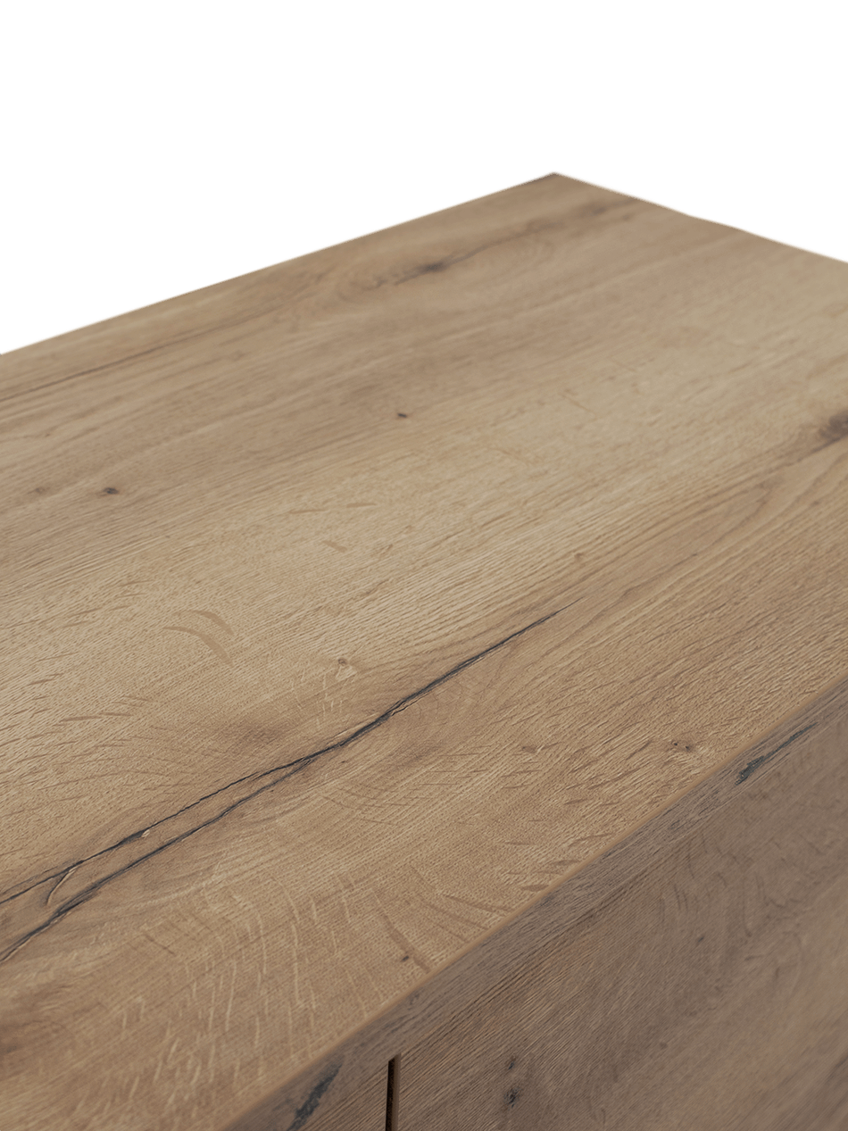 De dressoir is uitgevoerd in Lamulux kleur Natur, een hoogwaardig en onderhoudsvriendelijk materiaal dat de natuurlijke uitstraling van hout combineert met de stevigheid van moderne technologie. Het subtiele nerfpatroon brengt diepte en warmte in je interieur, terwijl de zwart gepoedercoate grepen voor een strak en eigentijds contrast zorgen.