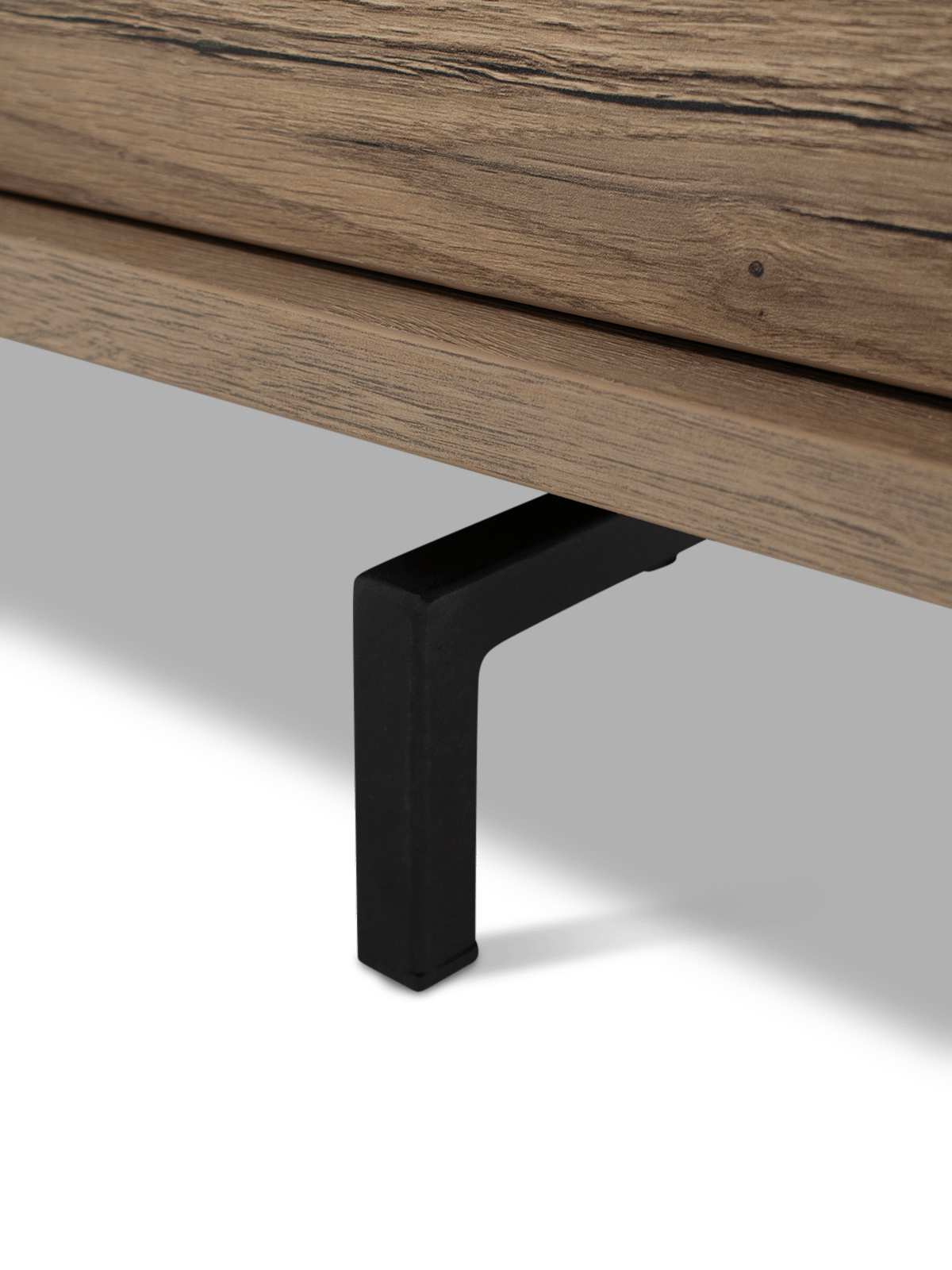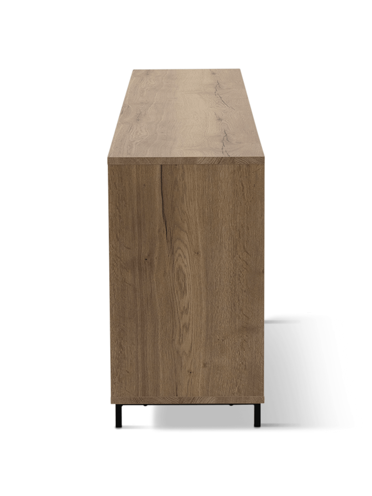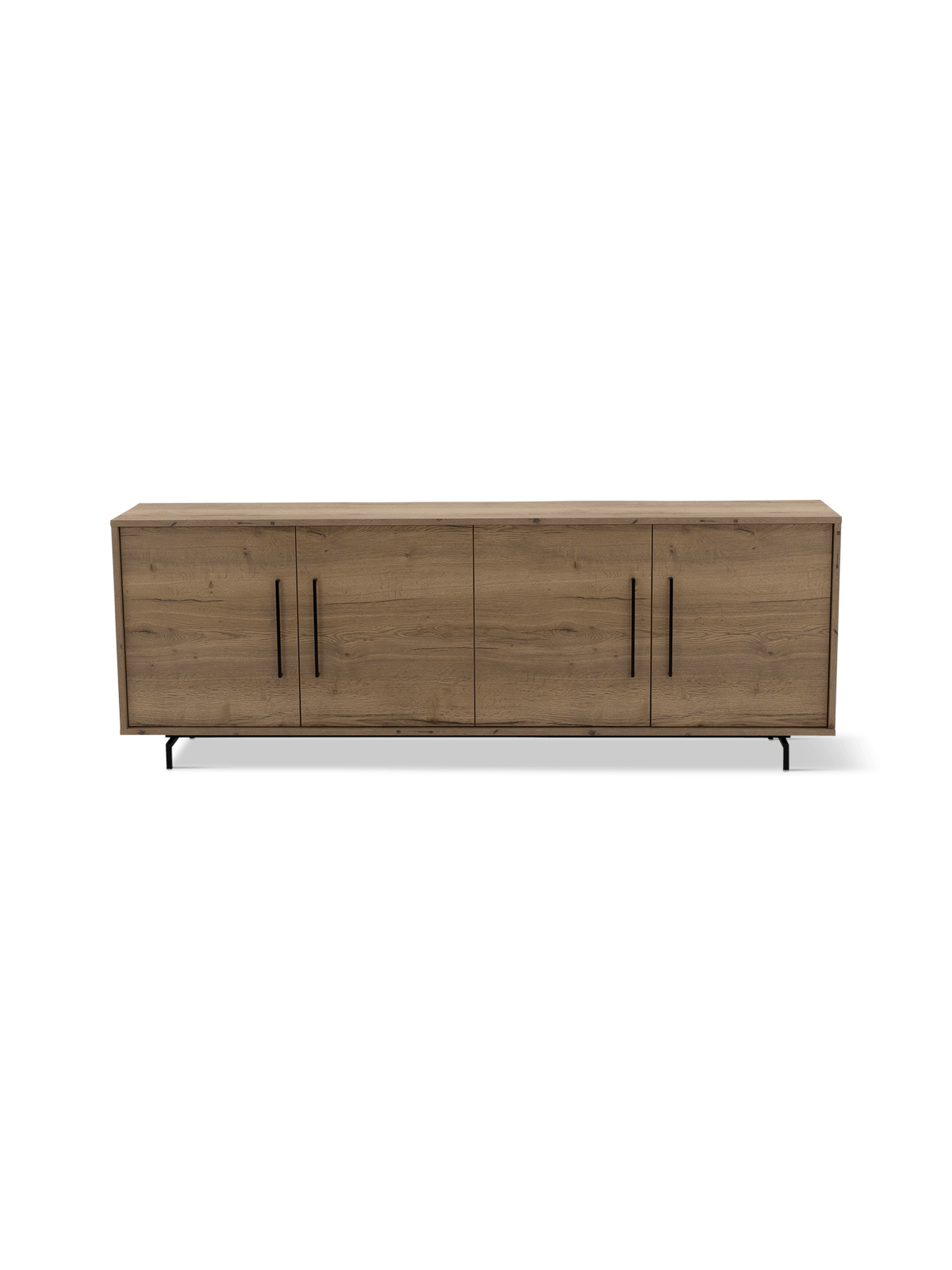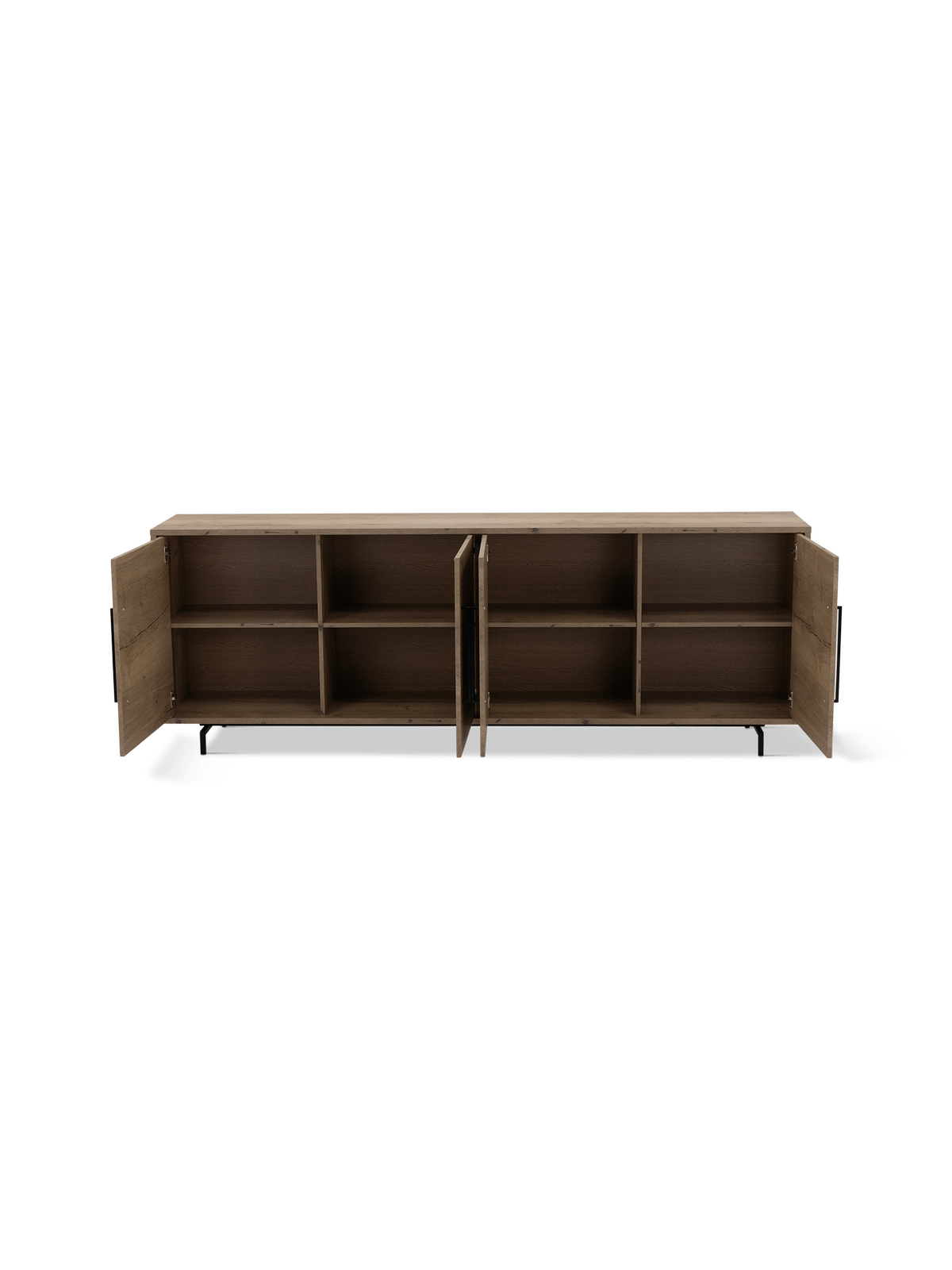 Met zijn vier deuren biedt de Halden dressoir een overvloed aan opbergruimte voor servies, tafellinnen en decoratie. De softclose-sluiting garandeert een geruisloze en vloeiende bediening – ideaal voor dagelijks gebruik. De lage metalen poten voegen een luchtig karakter toe en versterken het moderne lijnenspel.