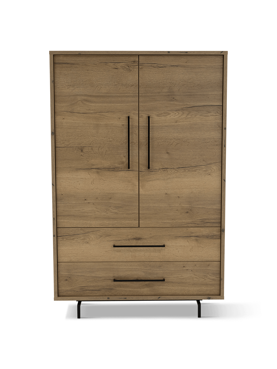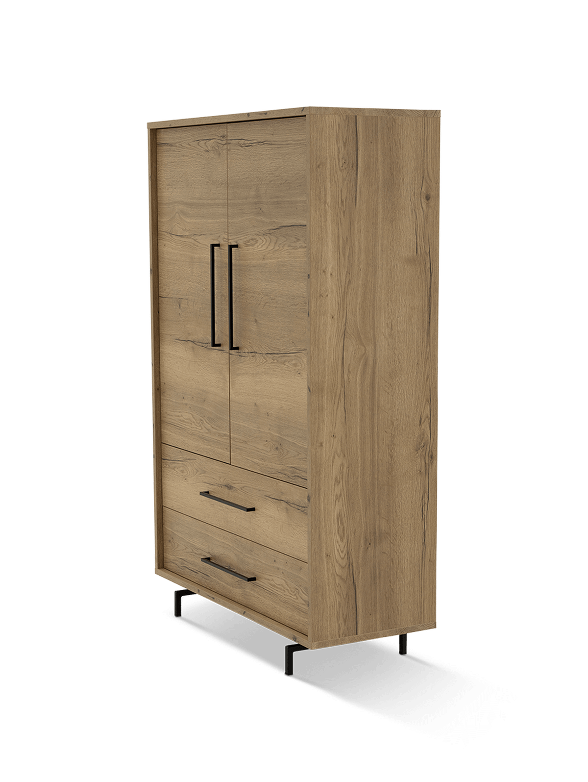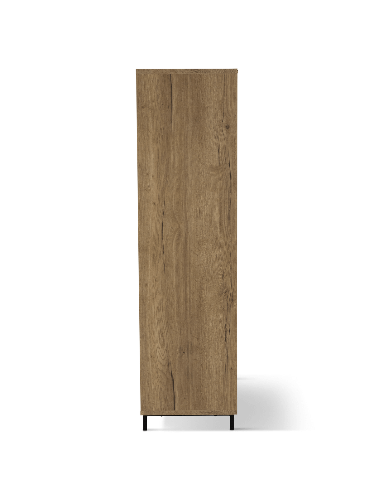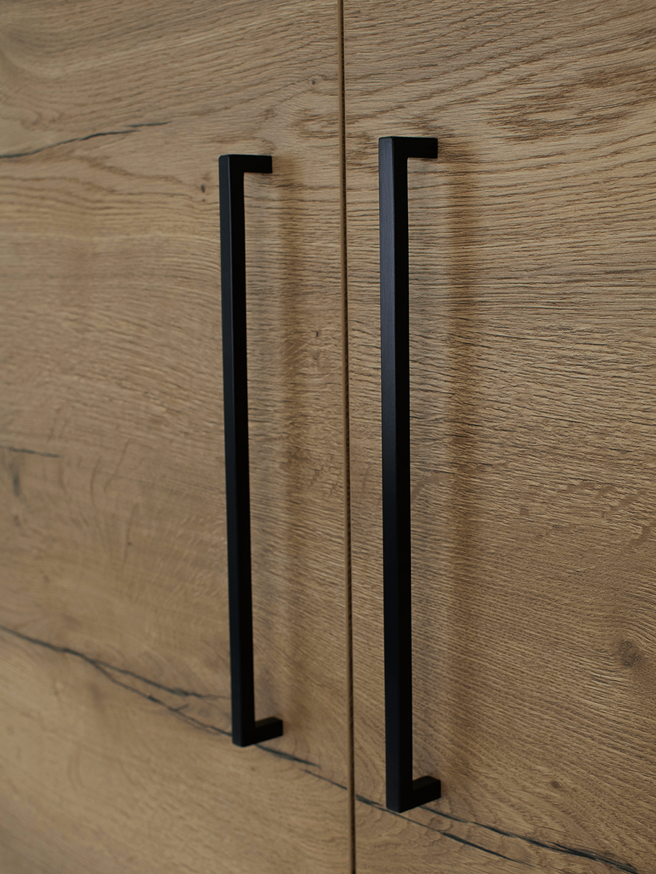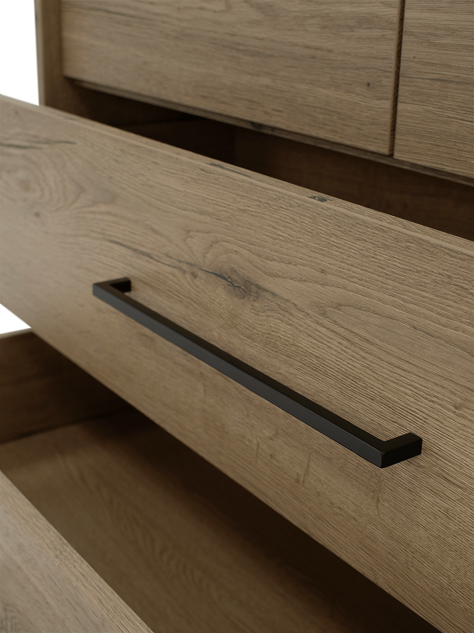 Vervaardigd uit Lamulux in kleur Natur, weerspiegelt de kast de authentieke charme van hout met een moderne, onderhoudsvriendelijke twist. De zachte houttekening wordt mooi geaccentueerd door de zwarte gepoedercoate grepen, die het geheel een eigentijdse uitstraling geven.
