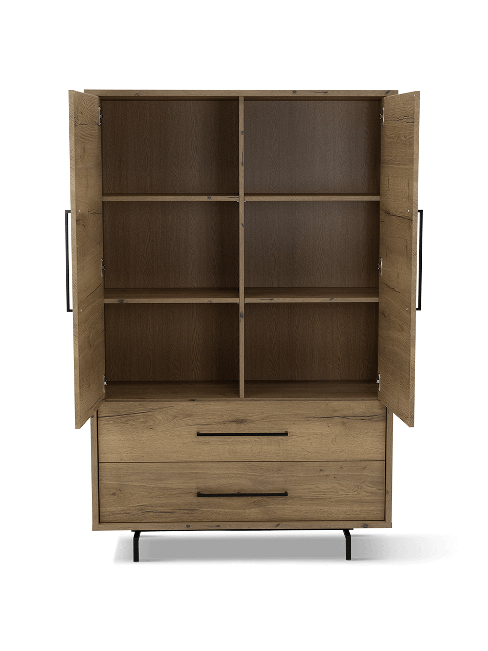 De Halden buffetkast beschikt over twee ruime lades en twee deuren met softclose-sluiting, waardoor ze fluisterstil sluiten. Achter de deuren schuilt voldoende opbergruimte voor servies, glazen of andere accessoires, terwijl het bovenste gedeelte een mooi oppervlak biedt voor decoratie of verlichting.