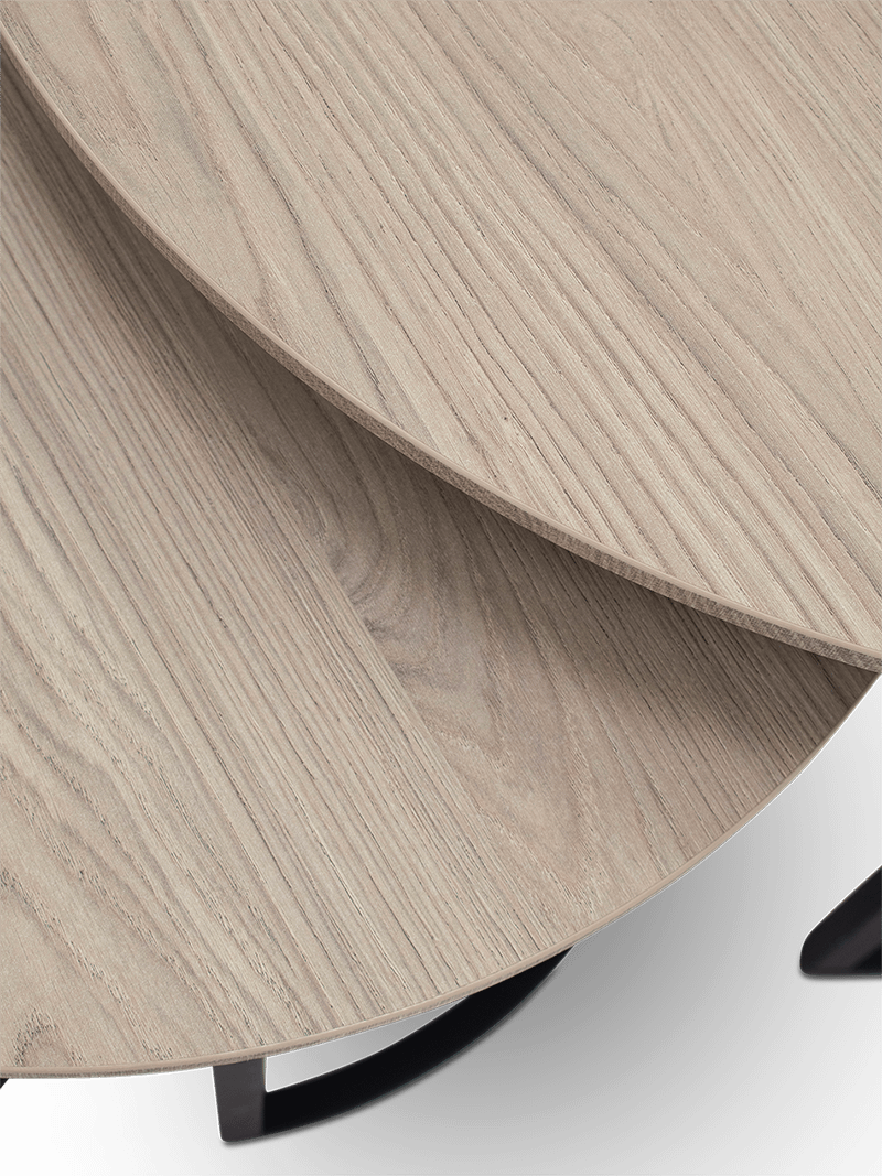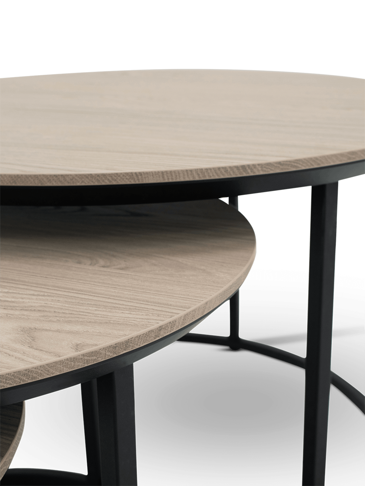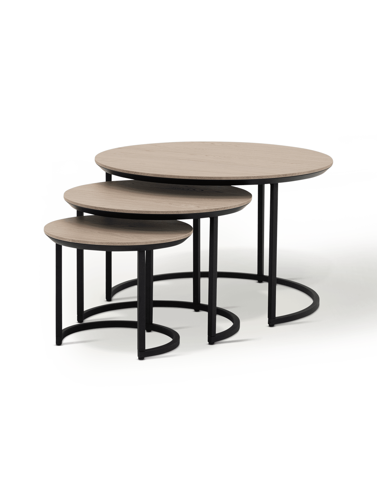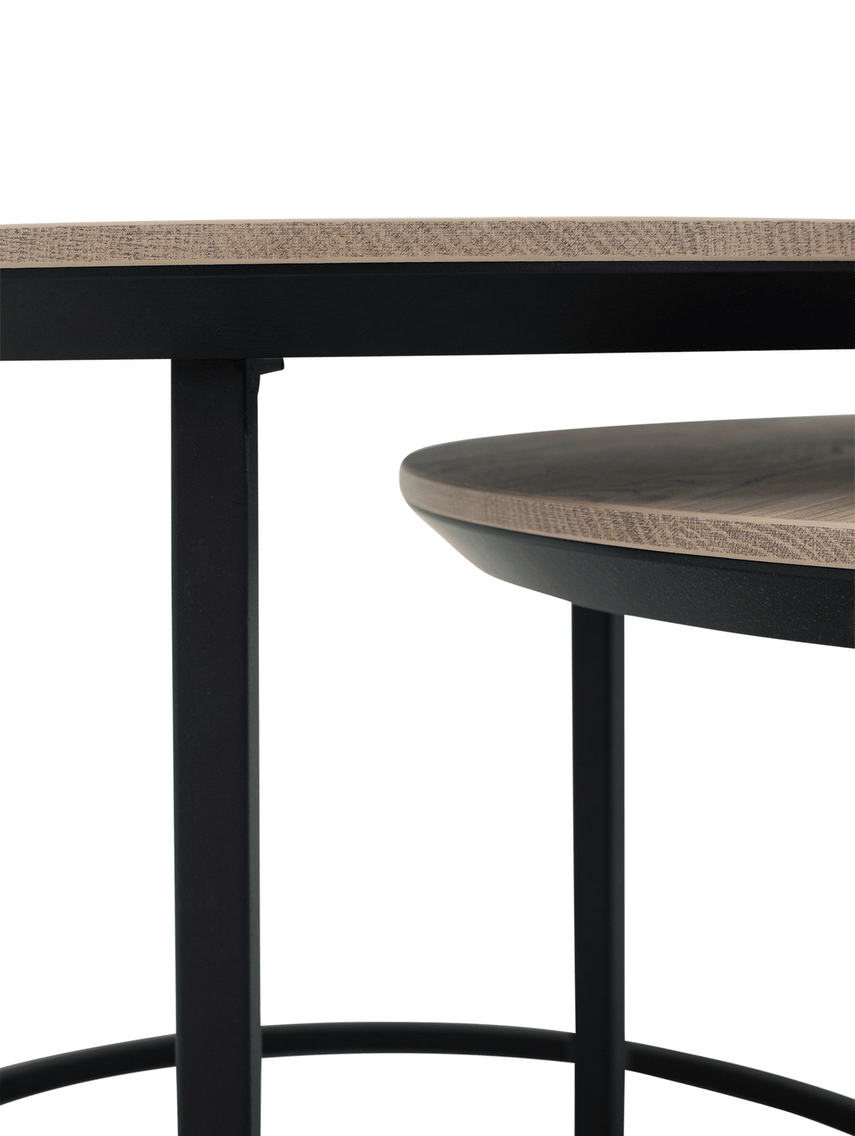 Met de set van drie salontafels Maxton breng je meteen meer sfeer én flexibiliteit in je zithoek. De ronde vormen zorgen voor een zachte uitstraling, terwijl de combinatie van misty oak en zwart metaal een moderne, tijdloze toets geeft.