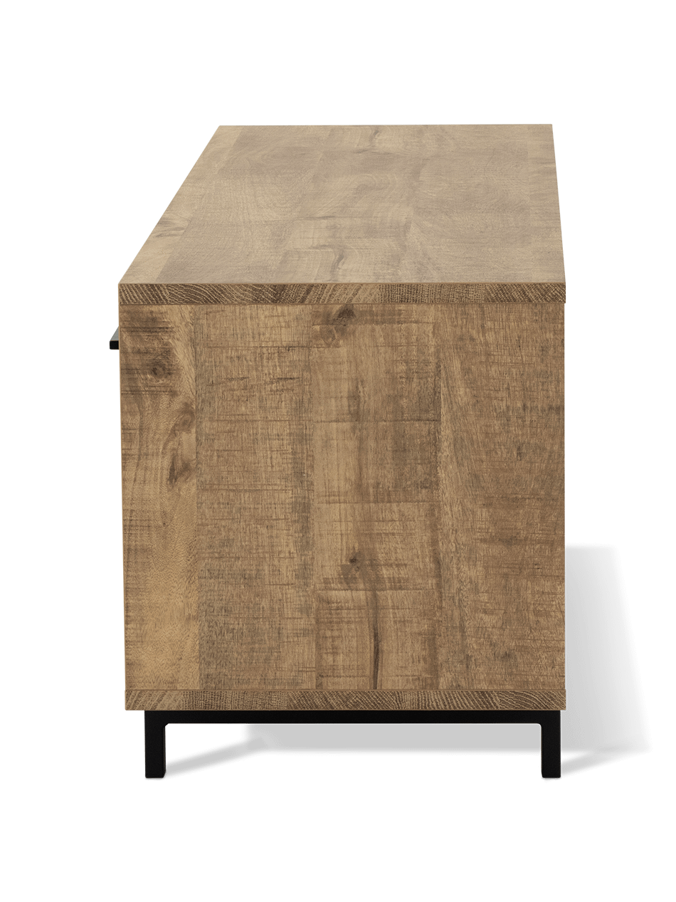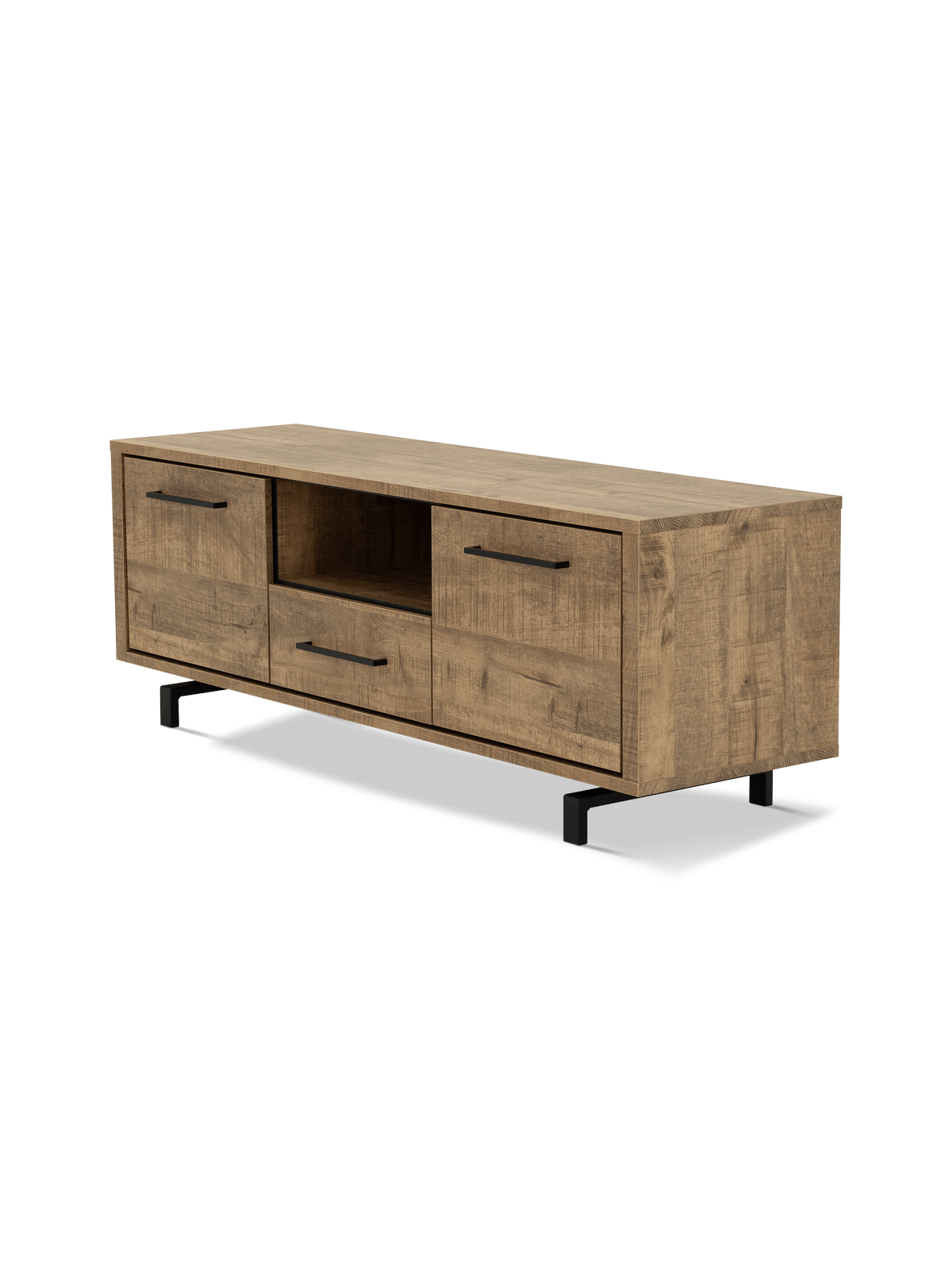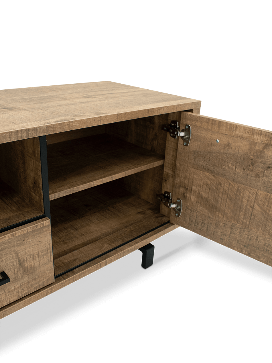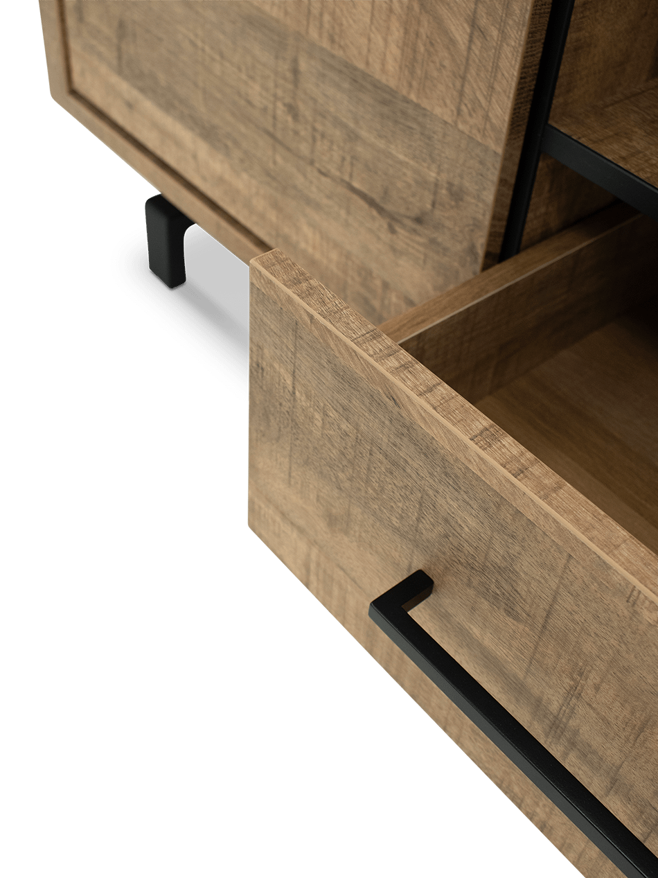 Het compacte Kundar-tv-meubel sluit perfect aan bij de andere meubels uit dezelfde collectie, zoals het dressoir of de grotere tv-kast. Samen vormen ze een uitgebalanceerde, moderne woonstijl met een natuurlijke warmte die rust uitstraalt.