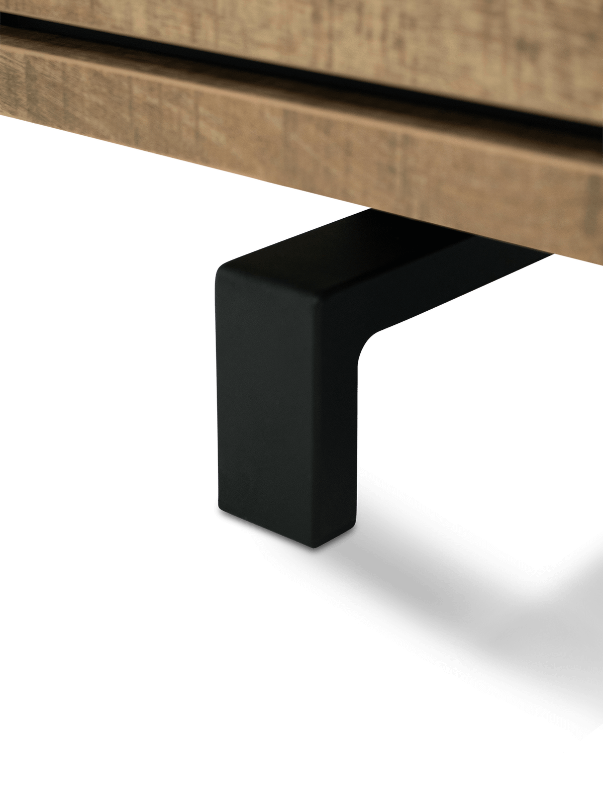 Het tv-meubel Kundar combineert een tijdloos ontwerp met een warme, natuurlijke uitstraling. De Lamulux-afwerking in kleur Mango geeft het meubel de look en feel van massief hout, met subtiele kleurnuances en een levendige nerfstructuur. De zwarte metalen poten en handgrepen zorgen voor een elegant industrieel accent dat perfect contrasteert met de warme houttint.