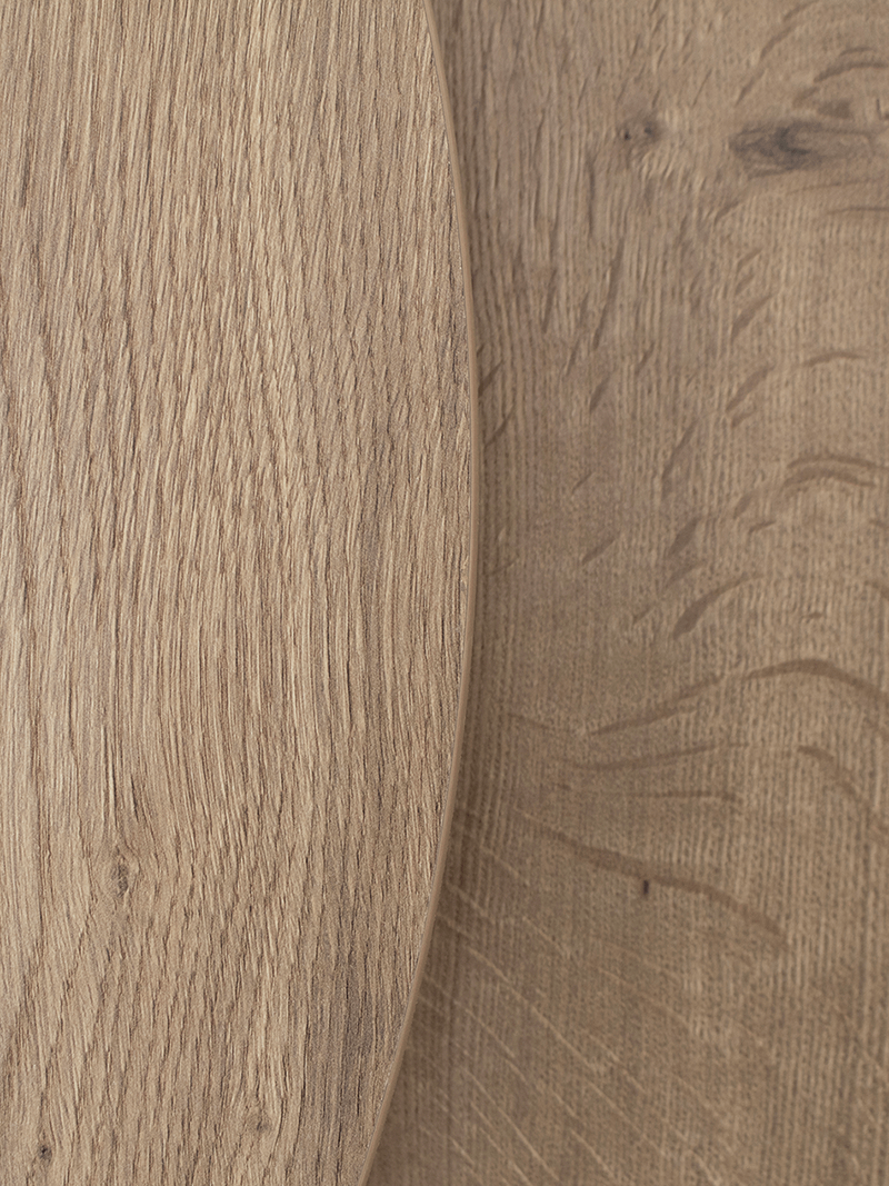 De bladen zijn uitgevoerd in Lamulux kleur Natur, een onderhoudsvriendelijk en krasbestendig materiaal met de authentieke uitstraling van echt hout. De natuurlijke tint zorgt voor een warme, uitnodigende sfeer die prachtig contrasteert met het zwart gepoedercoate metalen frame.