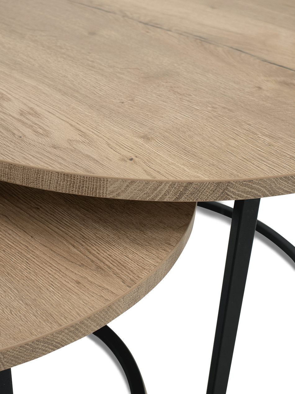 De Lexton salontafelset combineert een warme houtlook met stoere, metalen details. De drie ronde tafels verschillen in hoogte en diameter, waardoor ze zowel samen als apart gebruikt kunnen worden. Dankzij hun speelse opstelling creëer je moeiteloos diepte en dynamiek in je zithoek.