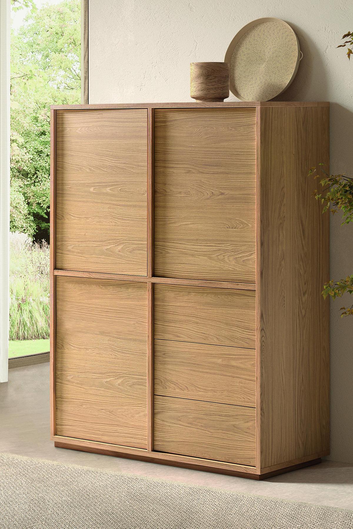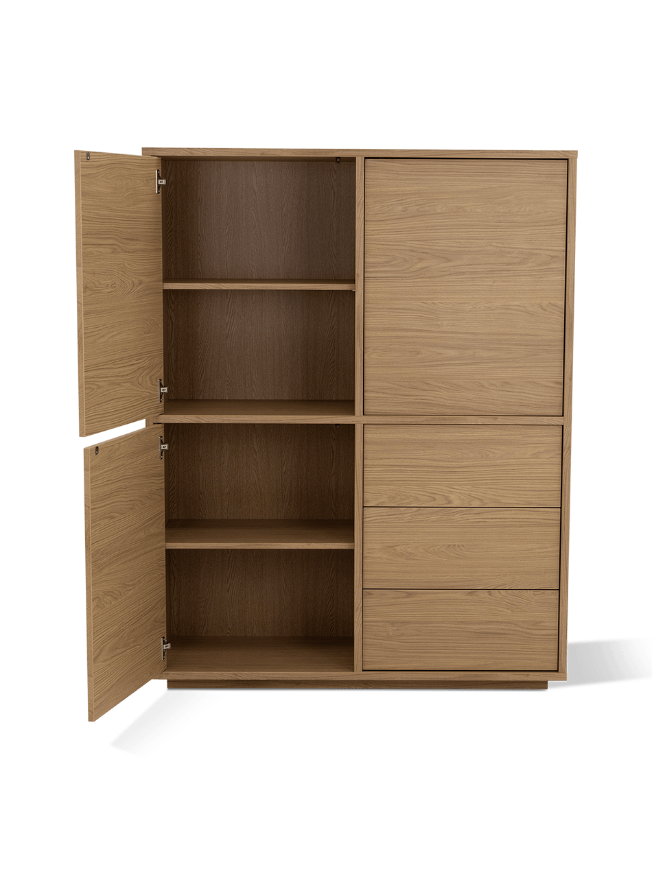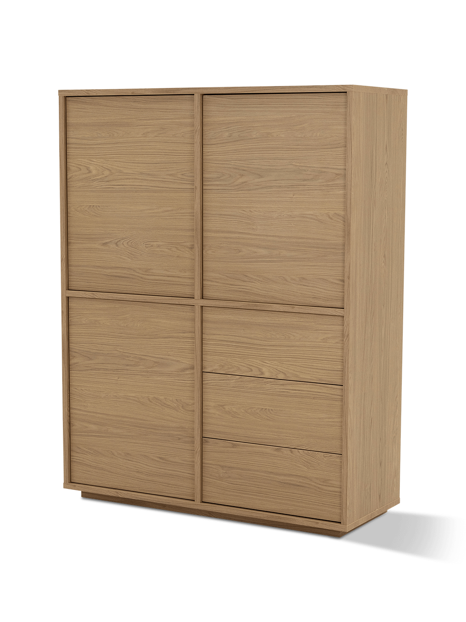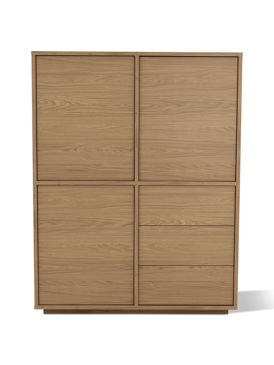 Met een hoogte van 154 cm vormt de barkast een elegant statementstuk in de woonkamer, eetkamer of hal. De rechte lijnen, onzichtbare grepen en verfijnde afwerking maken Yamato zowel modern als tijdloos — ideaal voor wie houdt van een interieur met rust, ritme en natuurlijke charme.