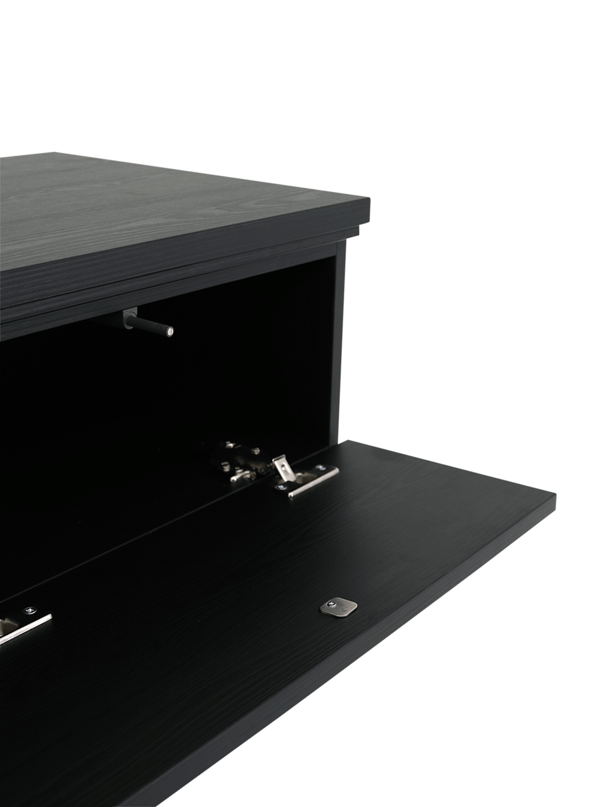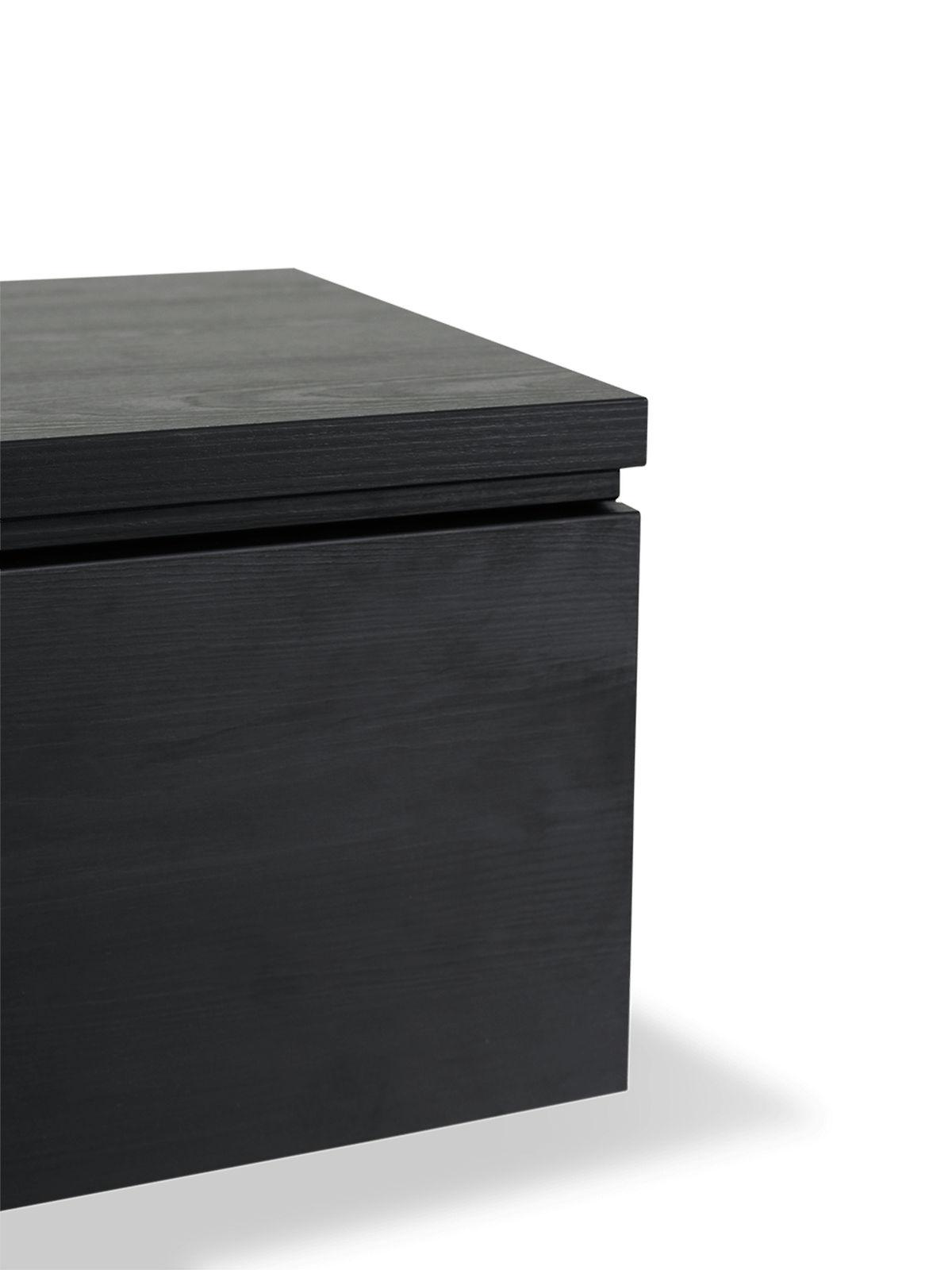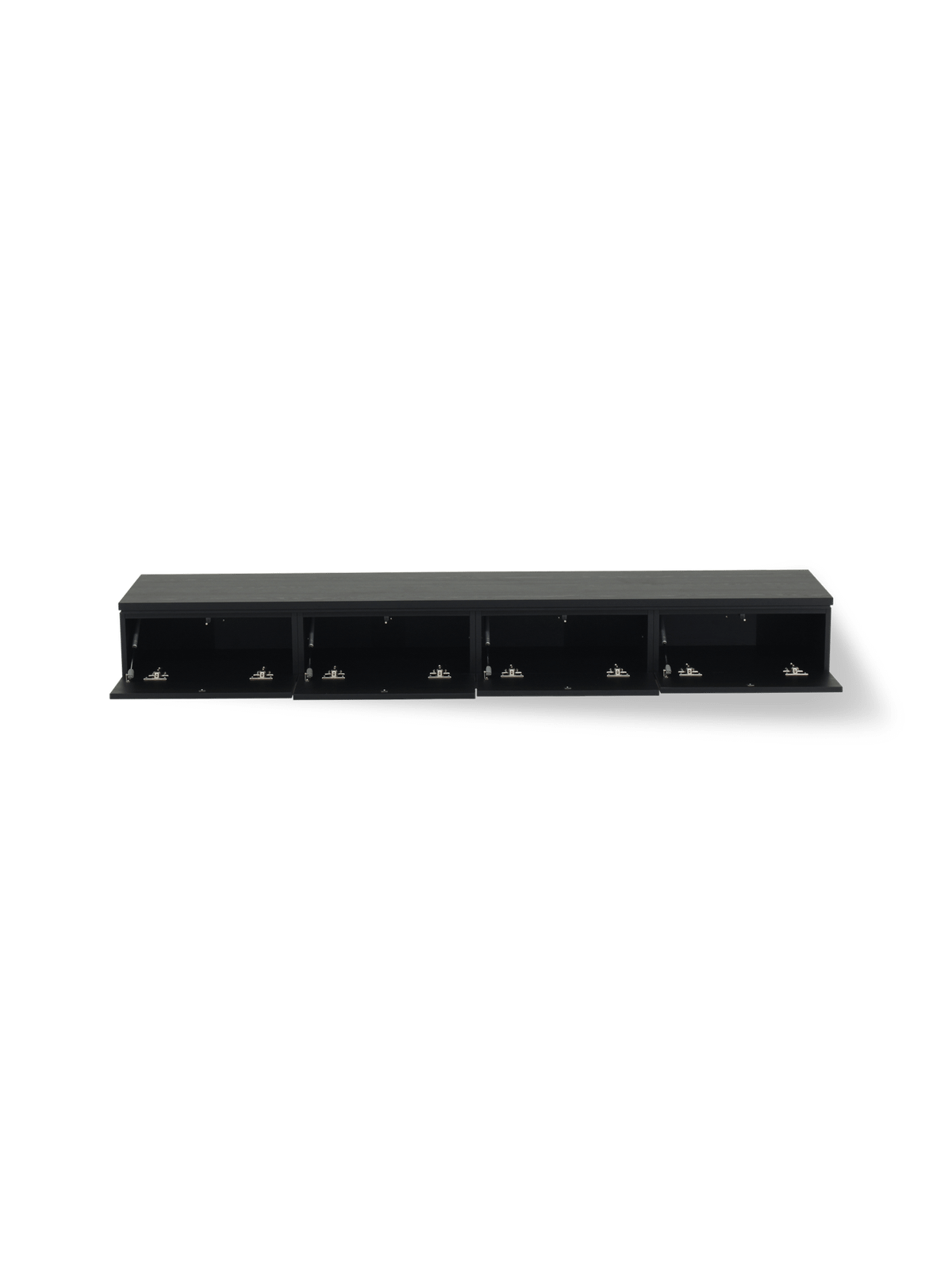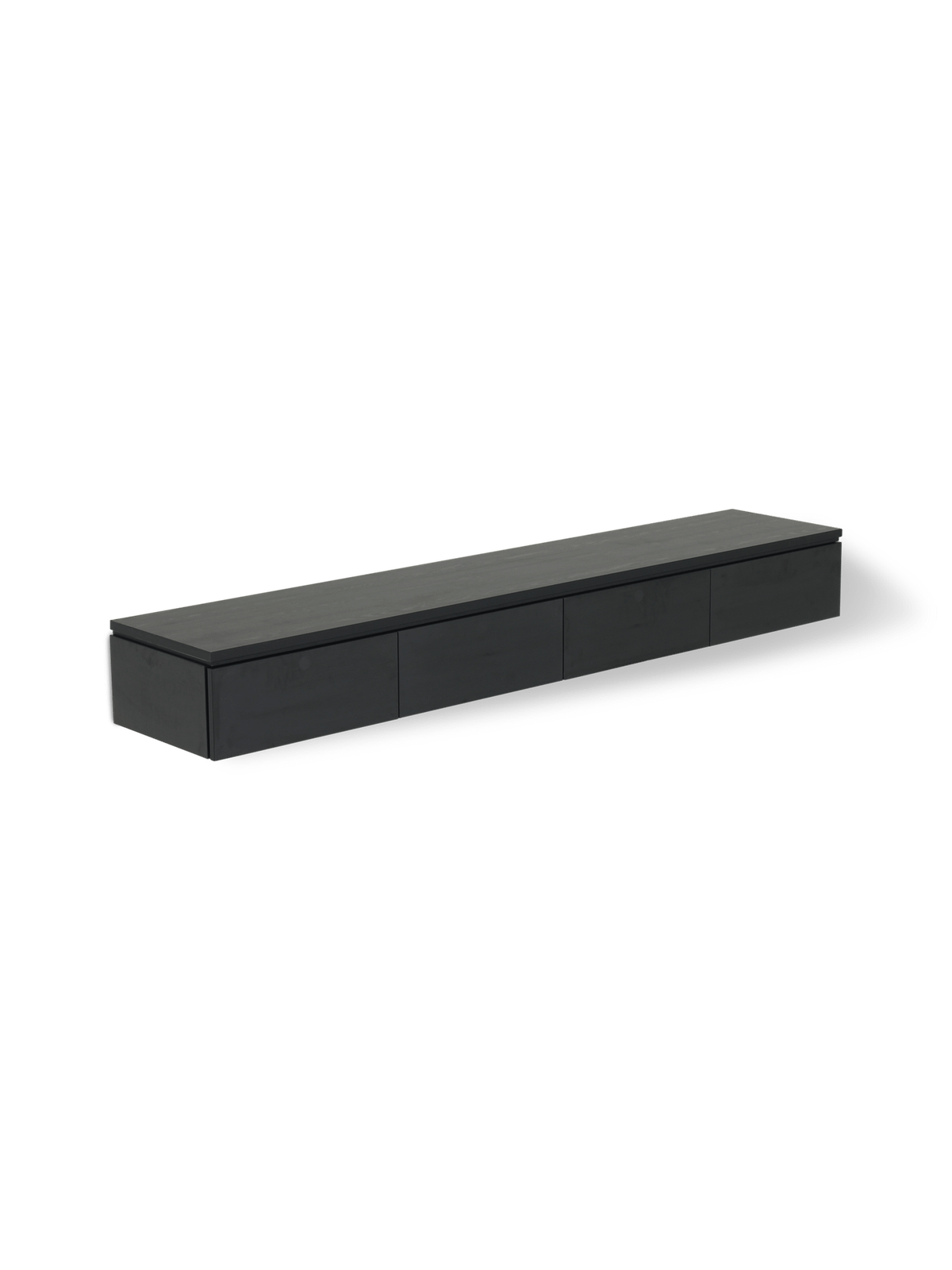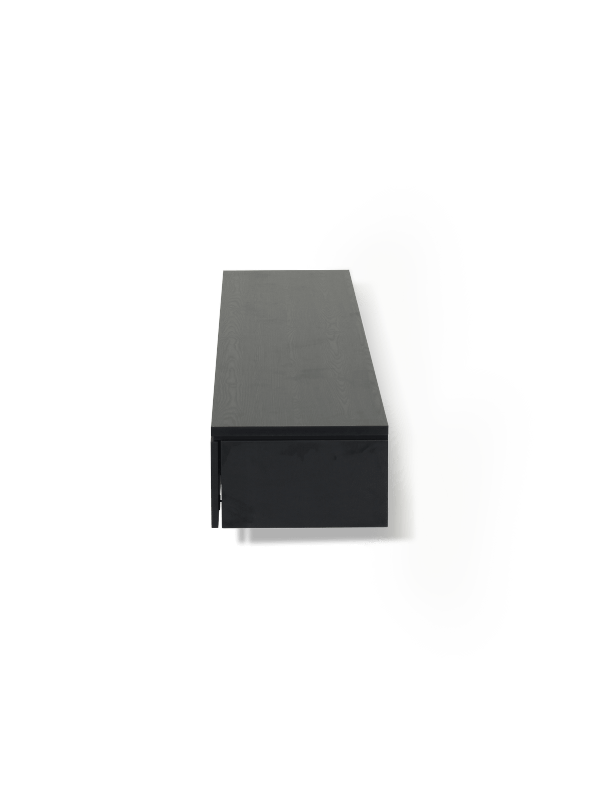 Dankzij zijn vlakke onderzijde is Milton geschikt voor zwevende montage of lage plaatsing op poten. In beide uitvoeringen oogt het meubel luchtig en architecturaal. De donkere tint Noir laat zich bovendien uitstekend combineren met lichte wanden, messing accenten of zachte stoffen in greige of zandkleur.