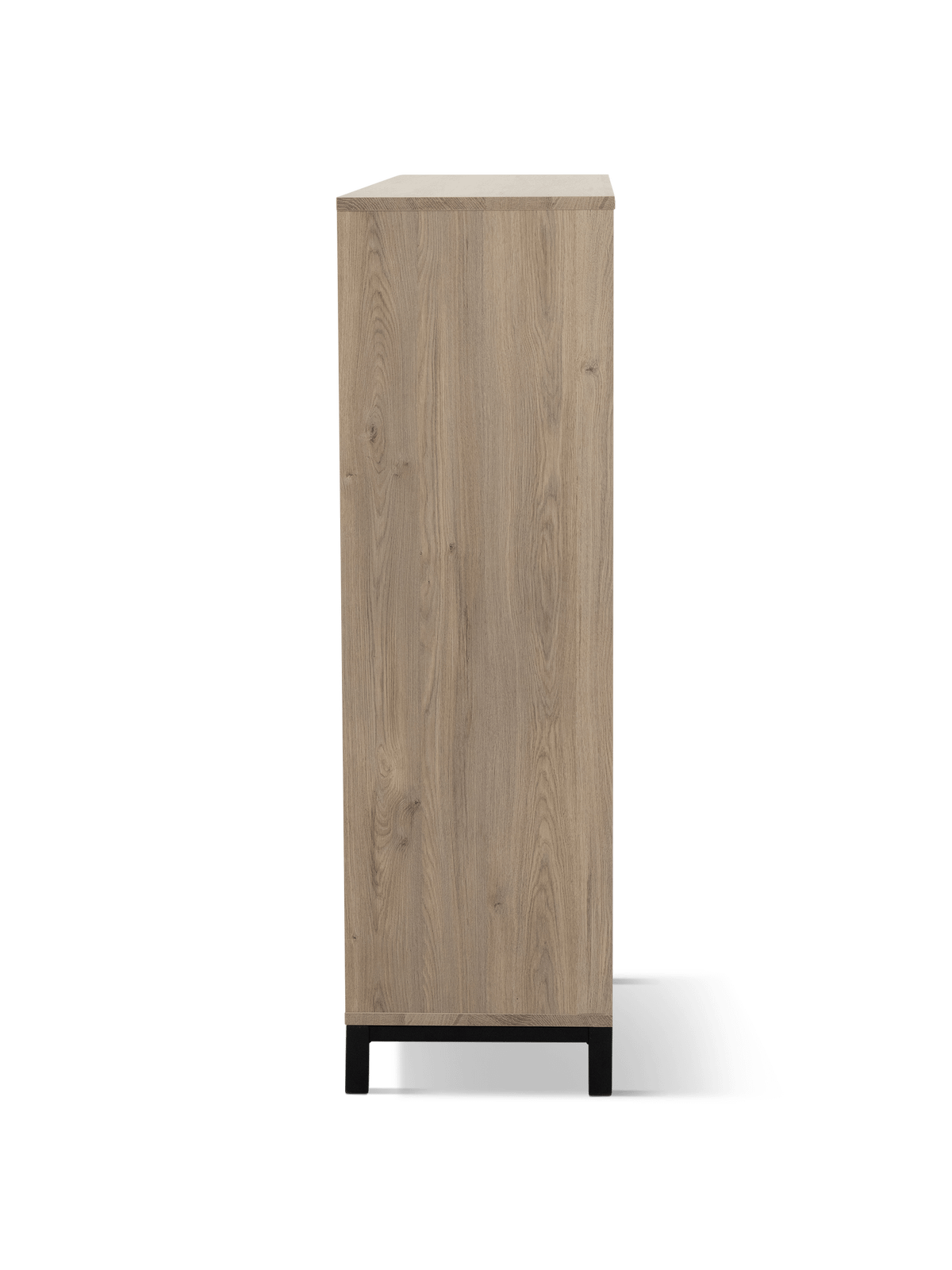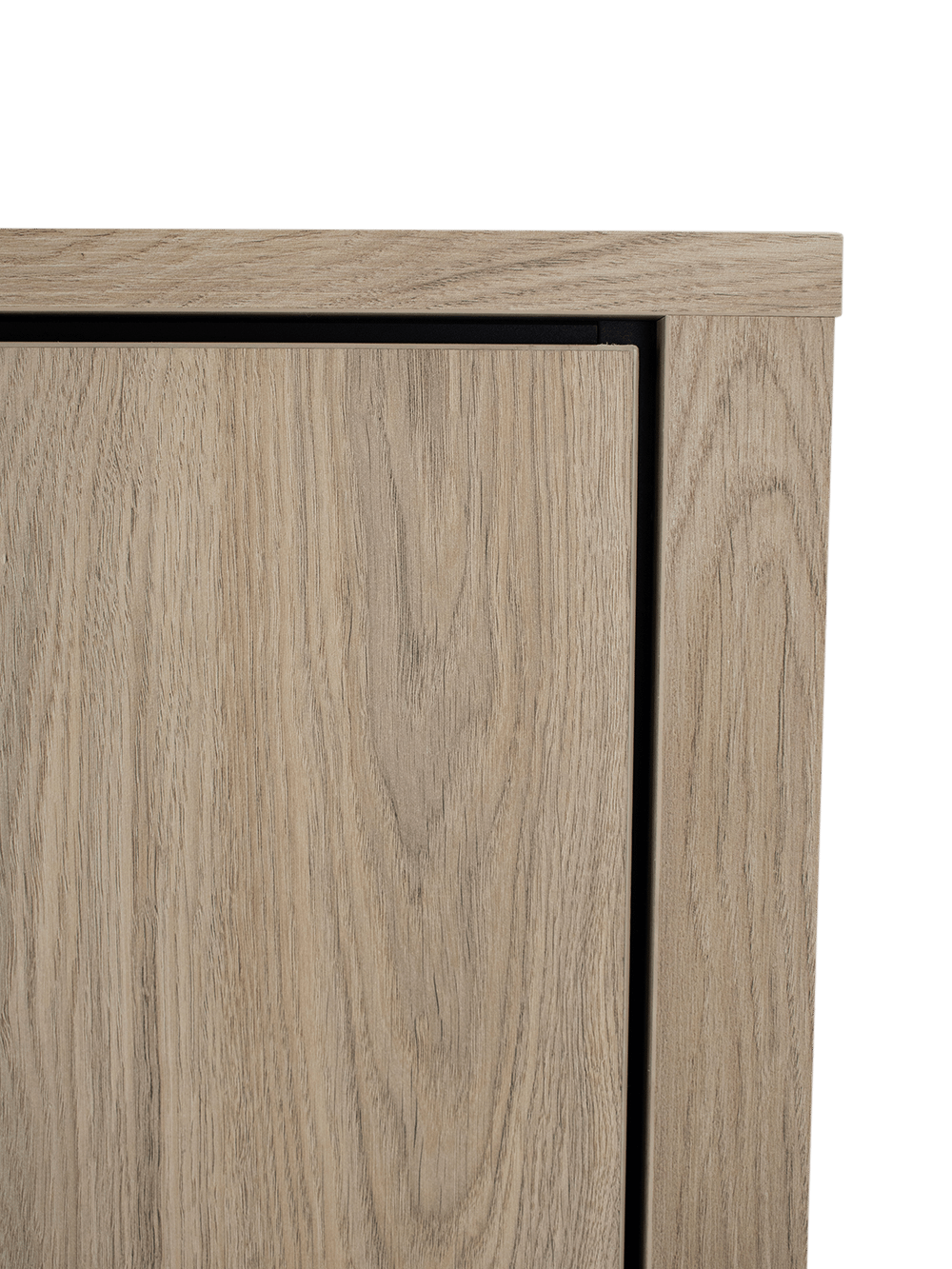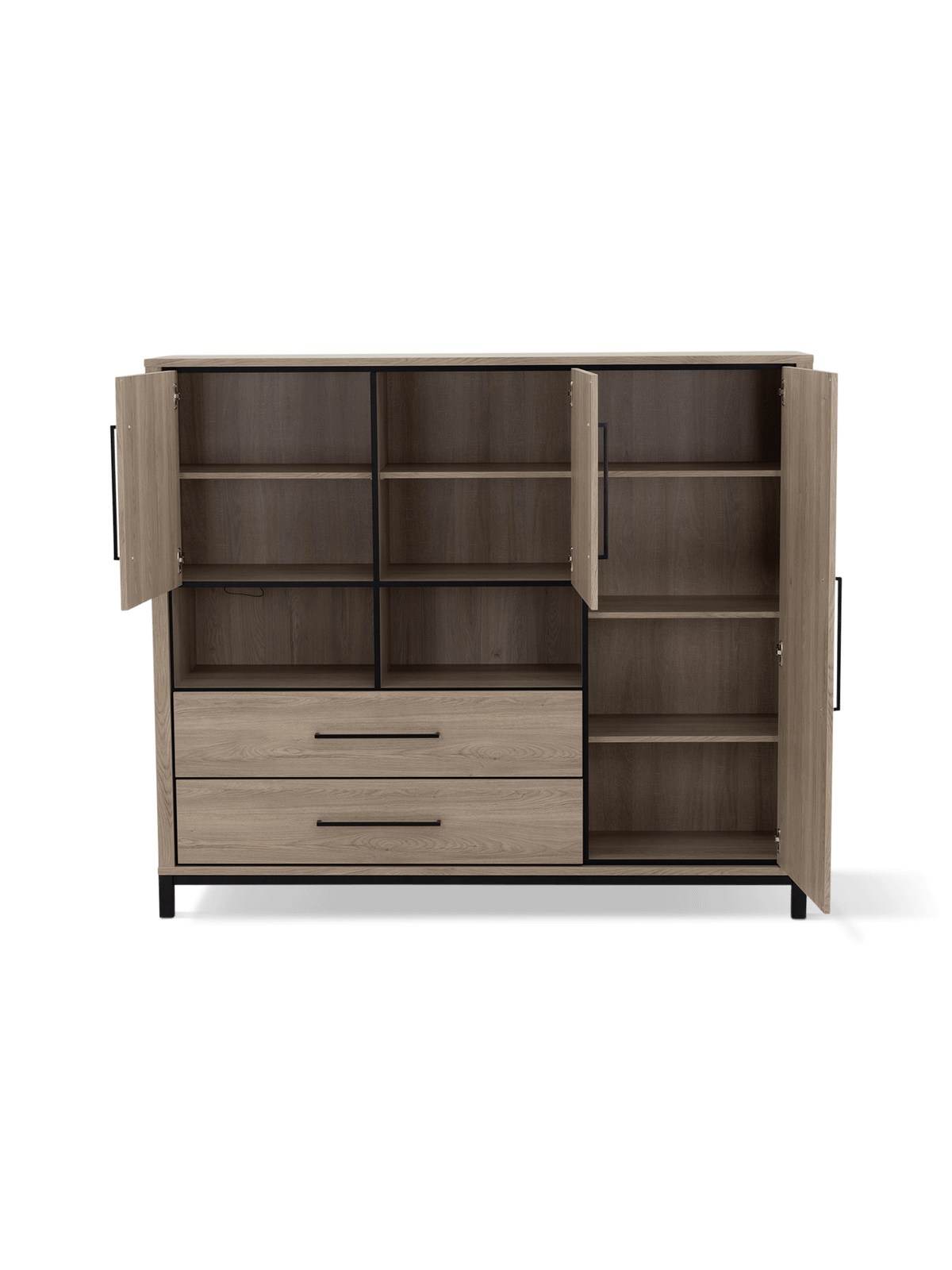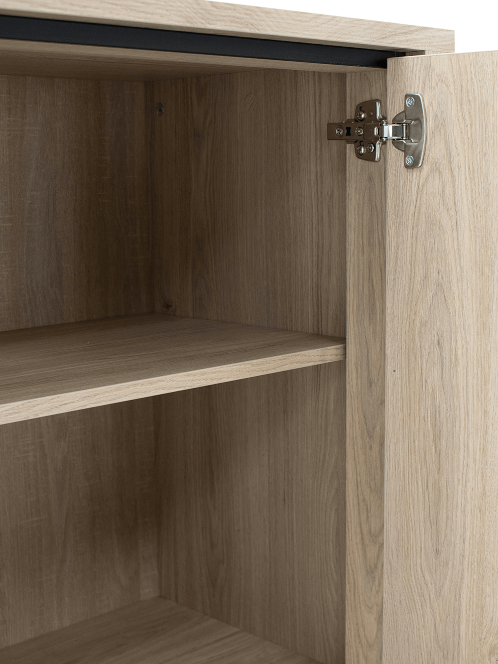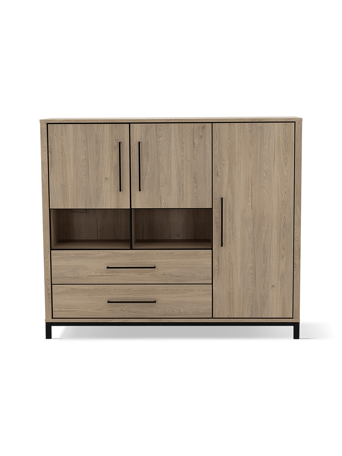 De kast is praktisch ingedeeld met drie deuren, twee ruime lades en twee open nissen. Achter de deuren kan je servies, documenten of andere spullen netjes opbergen, terwijl de lades ideaal zijn voor kleinere items die je graag snel terugvindt. De open nissen bieden ruimte voor decoratie, boeken of persoonlijke accessoires, waardoor je de kast eenvoudig een eigen karakter geeft.