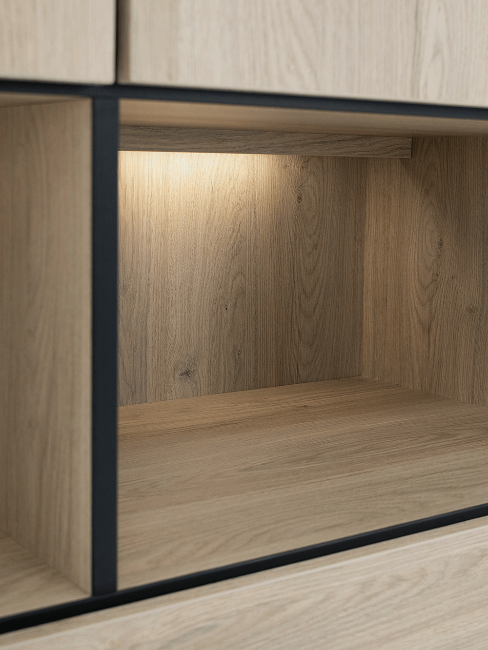 Voor een harmonieus interieur kan je deze kast eenvoudig combineren met andere meubels uit de Shot collectie. Zo creëer je moeiteloos een stijlvolle en uniforme kastenwand in je woonruimte. De LED-verlichting in de nissen op de foto is optioneel en niet inbegrepen.