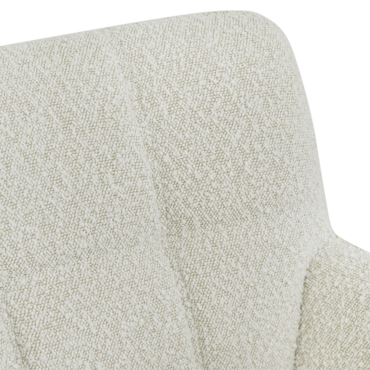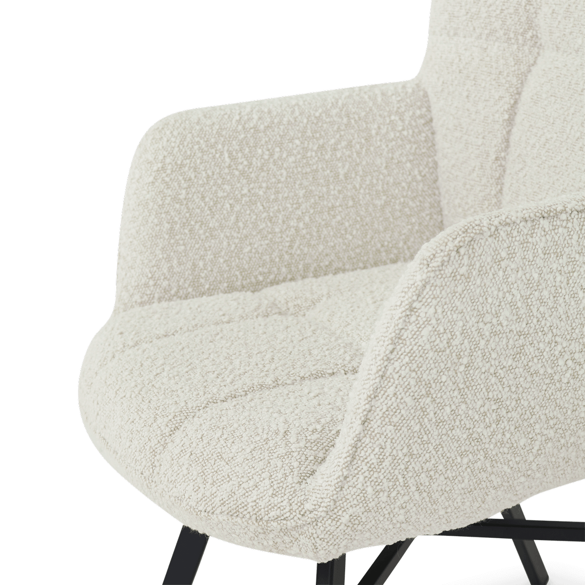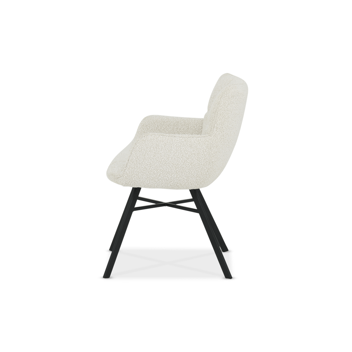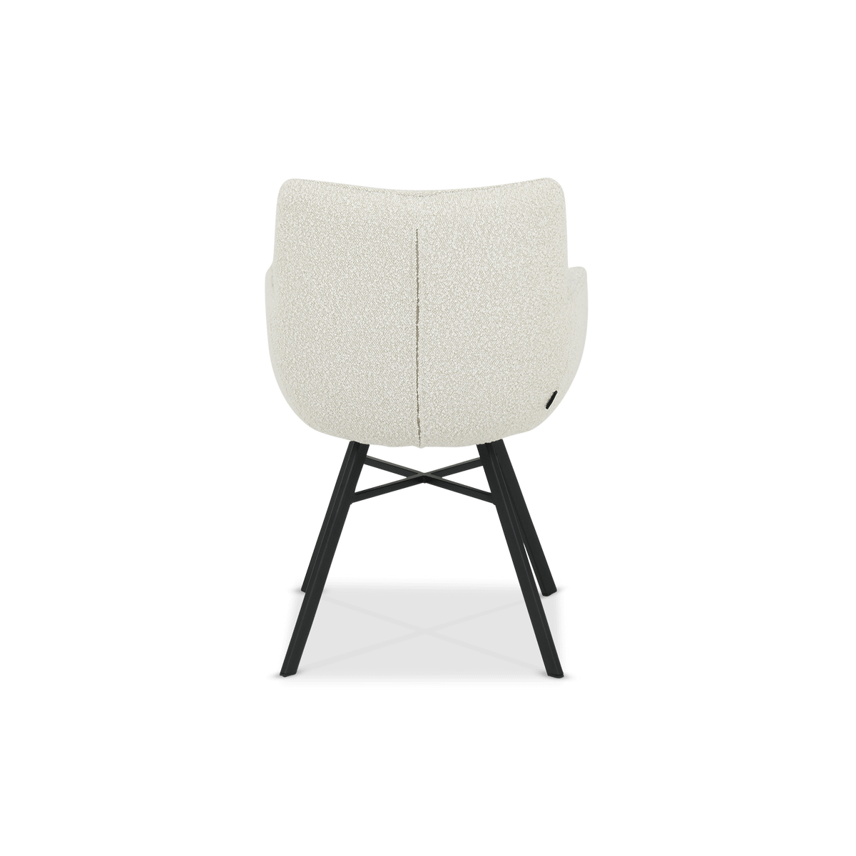 De stoel Camina combineert eigentijds design met een uitzonderlijk zitcomfort. De zitting in de zachte stof Touch Pearl straalt verfijning uit, terwijl de lichte bouclétextuur zorgt voor een luxueuze uitstraling. De geïntegreerde armleuningen en de lichte rondingen bieden extra ondersteuning, ideaal voor lange diners of gezellige avonden aan tafel.