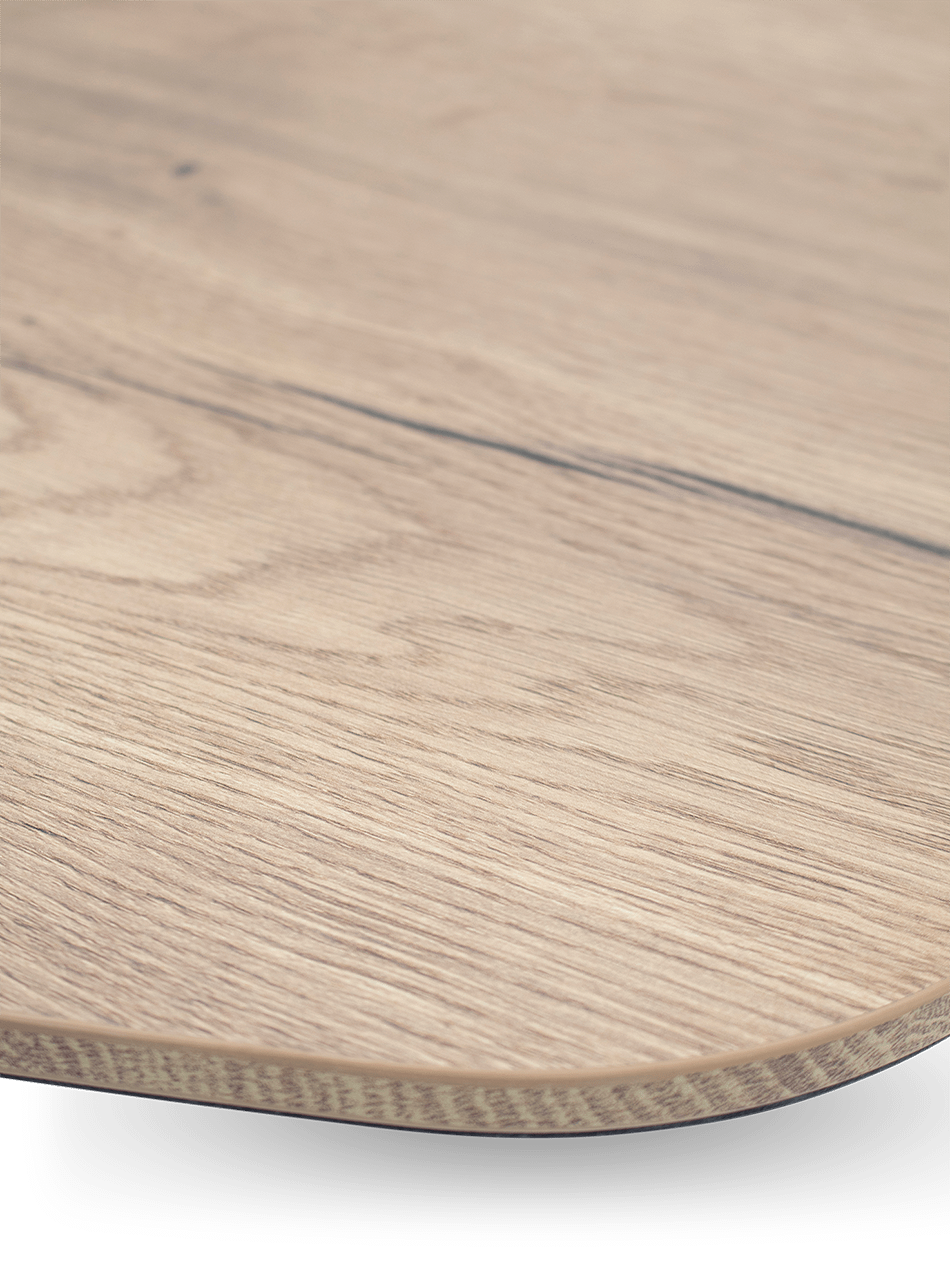 Het tafelblad is uitgevoerd in lamulux in de kleur Natur en straalt de warme look van echt hout uit. De subtiele houtstructuur en natuurlijke nuances geven de tafel een tijdloos karakter. De elegante facetrand zorgt voor een verfijnde afwerking en geeft het blad een lichtere, slankere uitstraling.