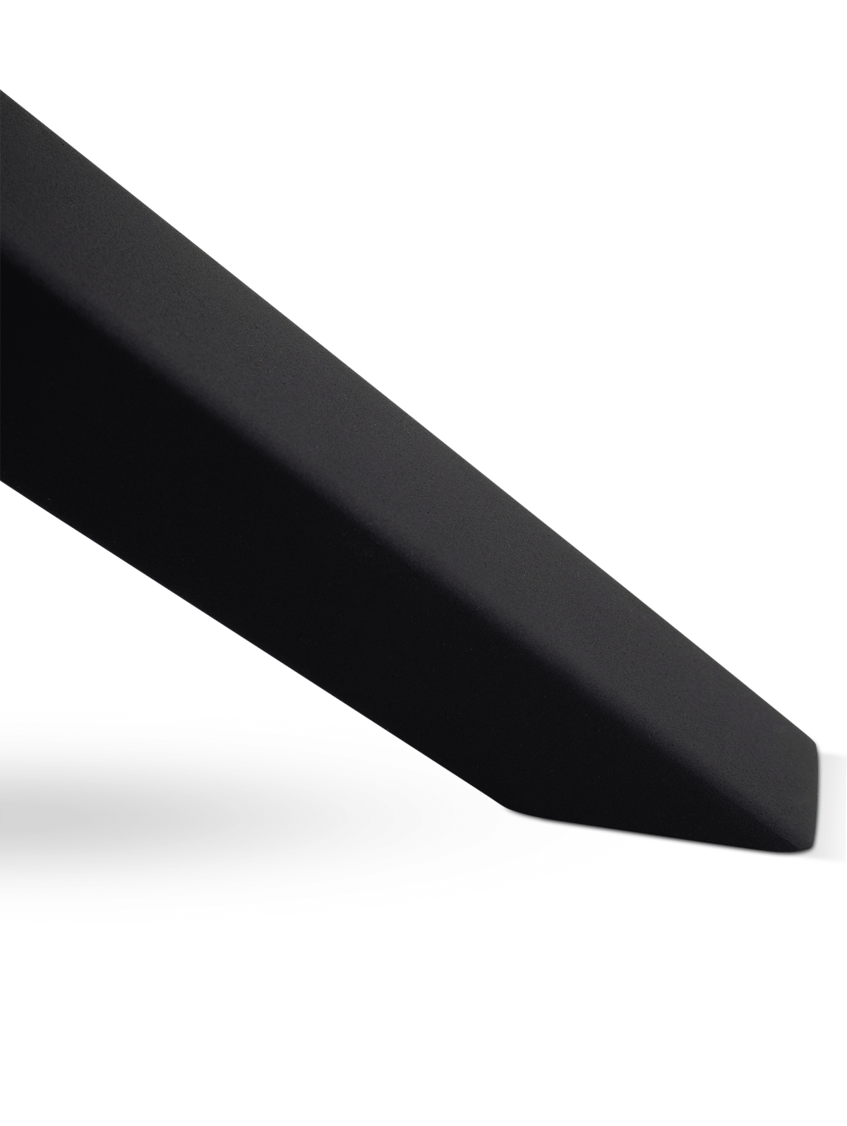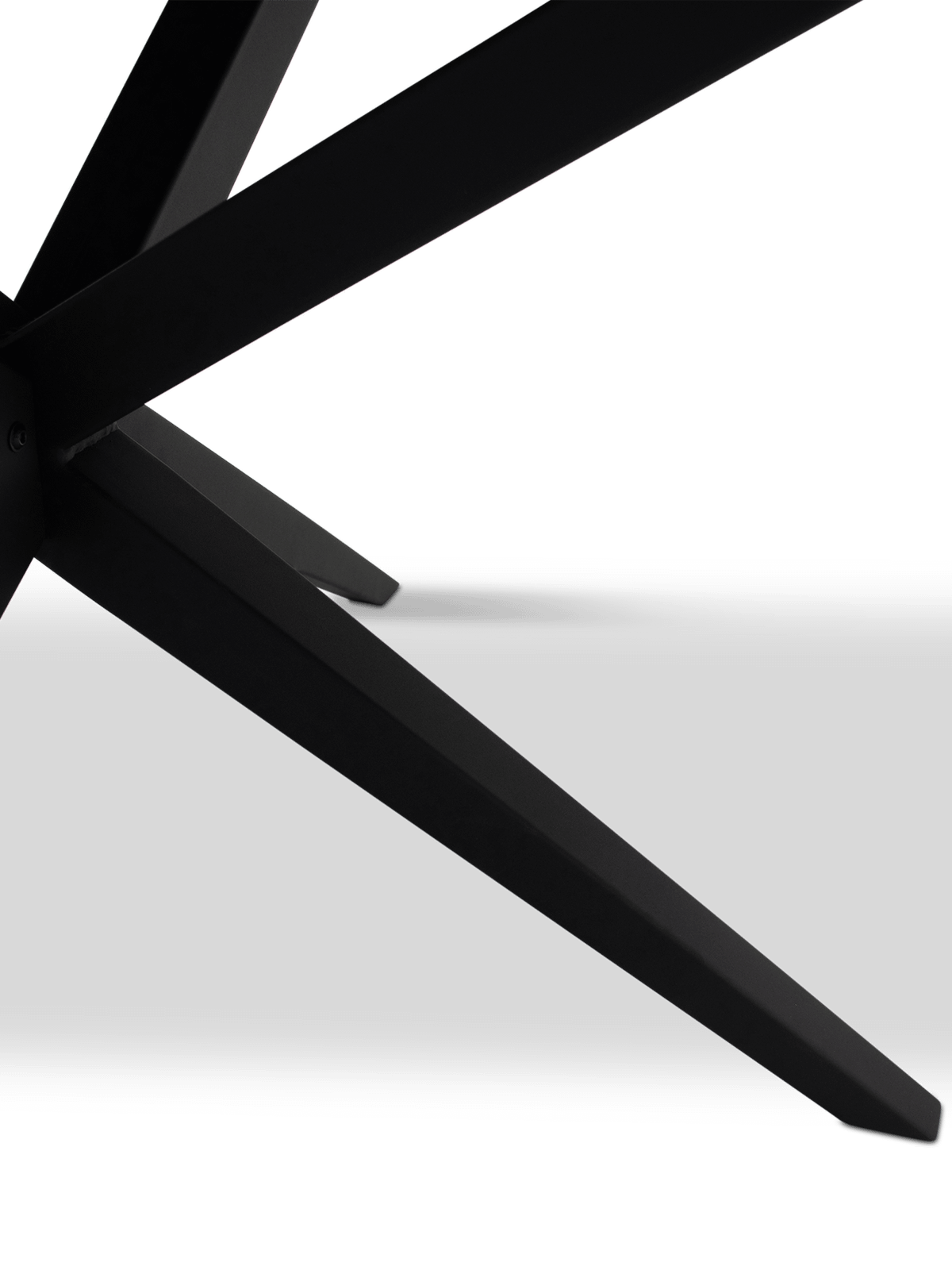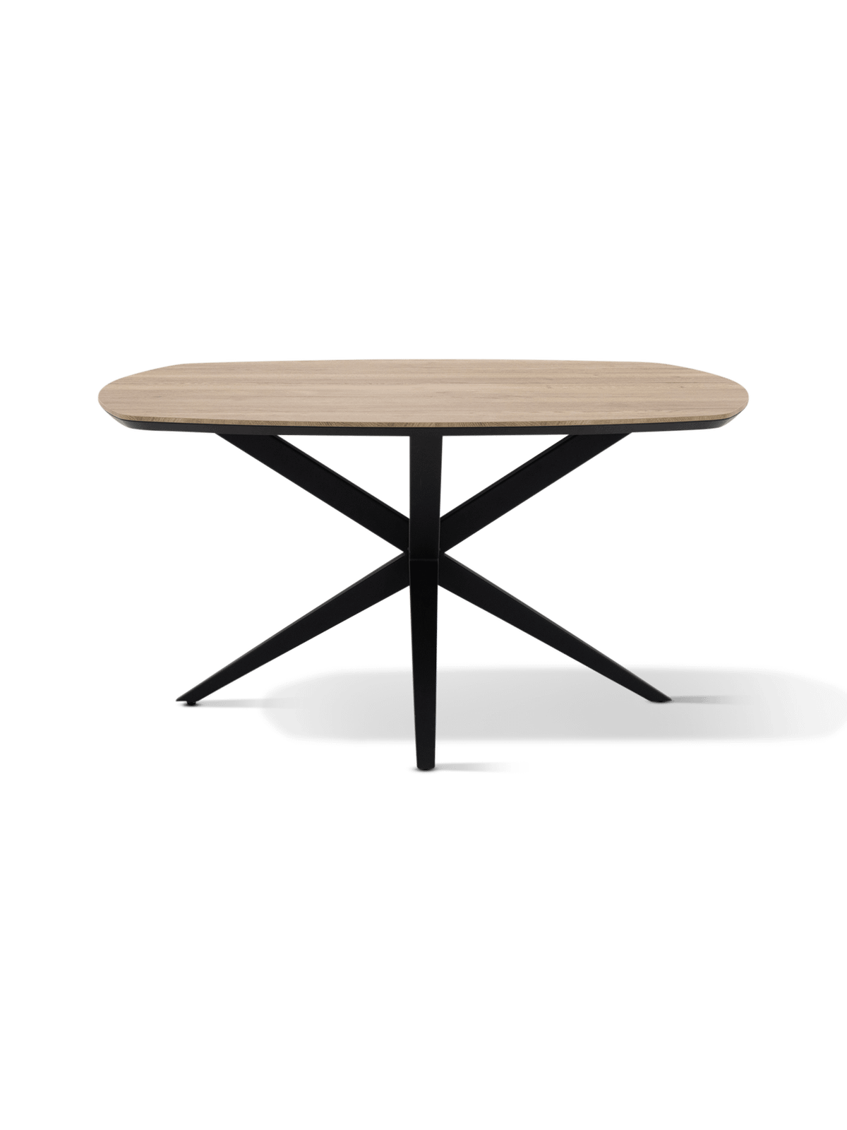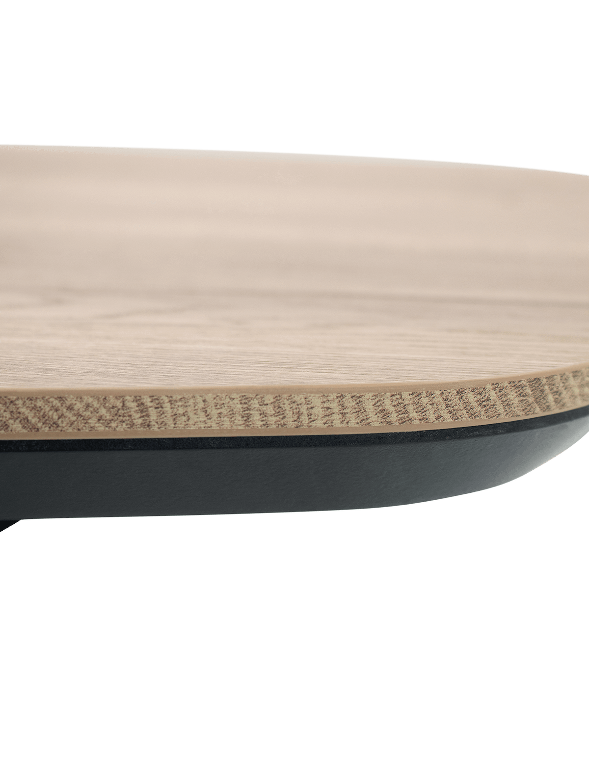 De centrale poot in zwart gepoedercoat metaal vormt een stijlvol contrast met het warme houtdecor. Deze stevige constructie zorgt voor optimale stabiliteit en laat tegelijk voldoende beenruimte rondom de tafel, wat het zitcomfort verhoogt.