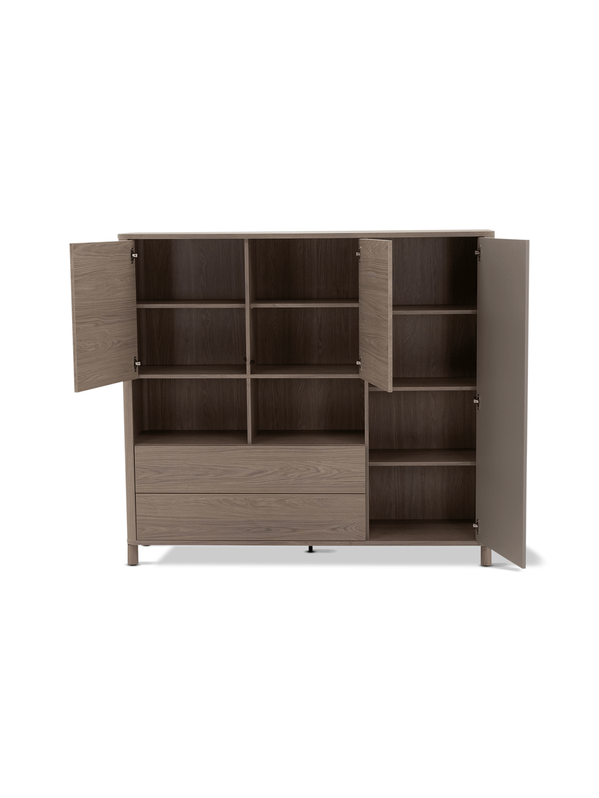 De kast biedt een royale opbergruimte met 3 deuren, 2 lades en 2 open vakken – ideaal voor het opbergen en uitstallen van je favoriete items. De indeling is ontworpen voor optimaal opruimcomfort, met praktische vakverdelingen voor een overzichtelijke organisatie. Zowel de deuren als de lades zijn voorzien van een push-to-open systeem, waardoor de kast een strak en greeploos karakter krijgt.