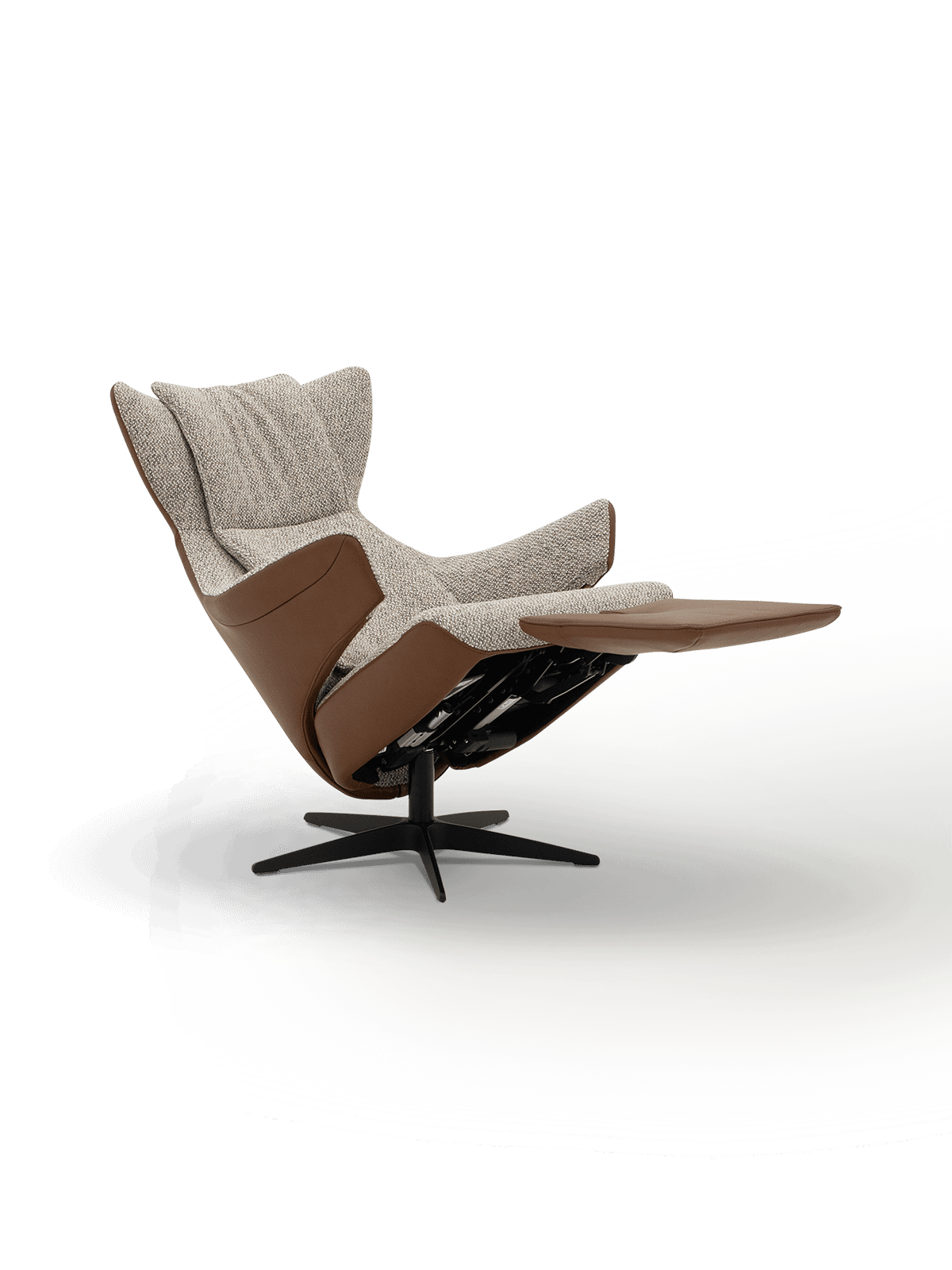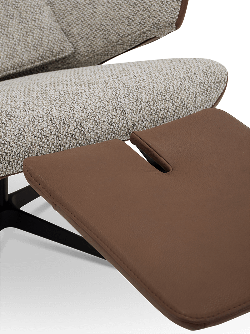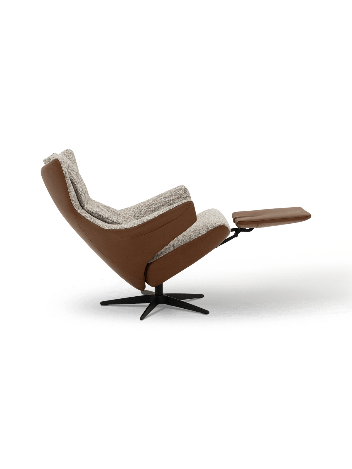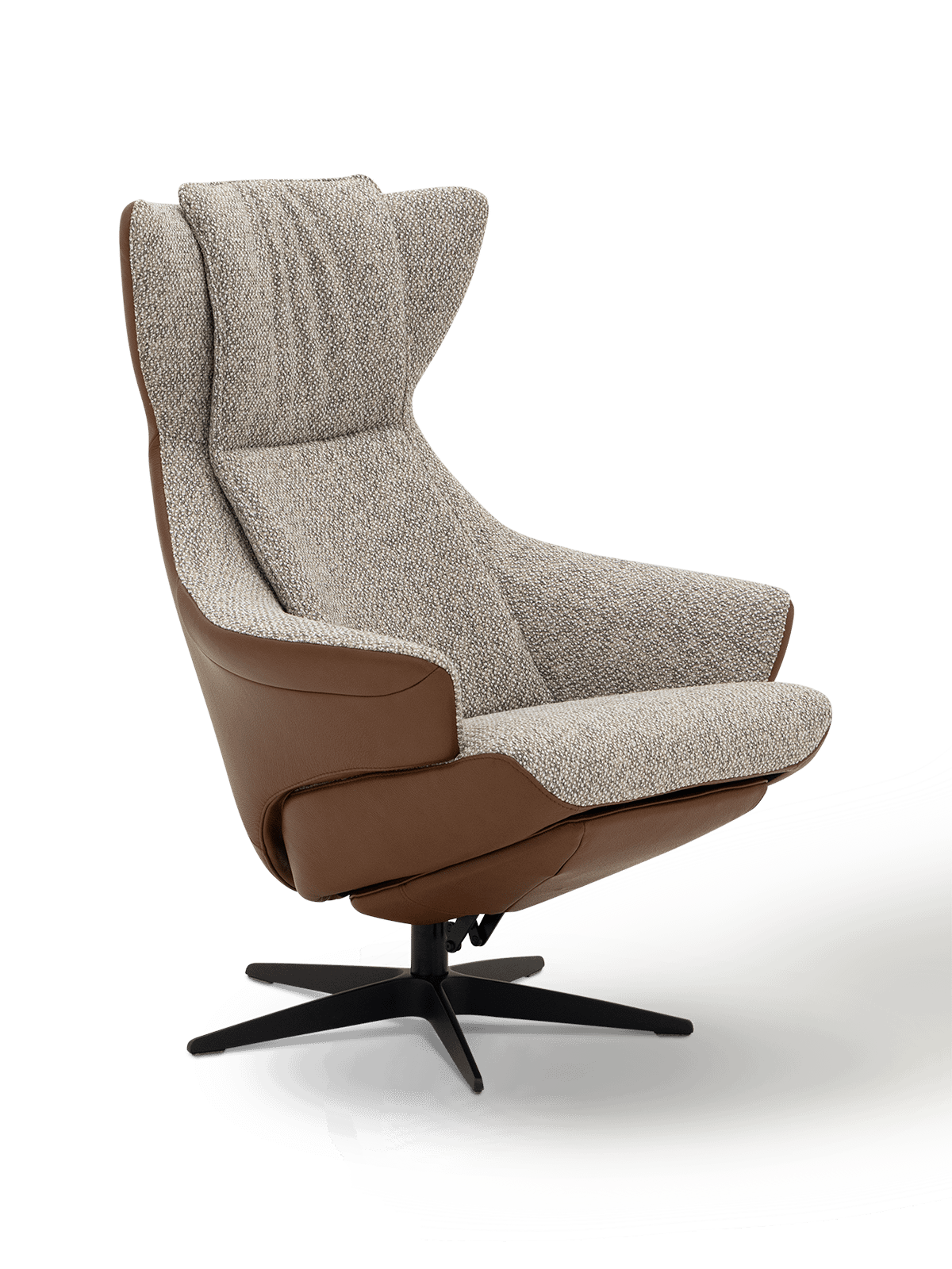 Relaxfauteuil Lira valt meteen op door zijn uitgesproken vormgeving en materiaalcombinatie. De stof aan de binnenzijde wordt gecombineerd met warm leder aan de buitenkant. Het resultaat is een moderne zetel met een eigen karakter die perfect tot zijn recht komt in elk interieur.