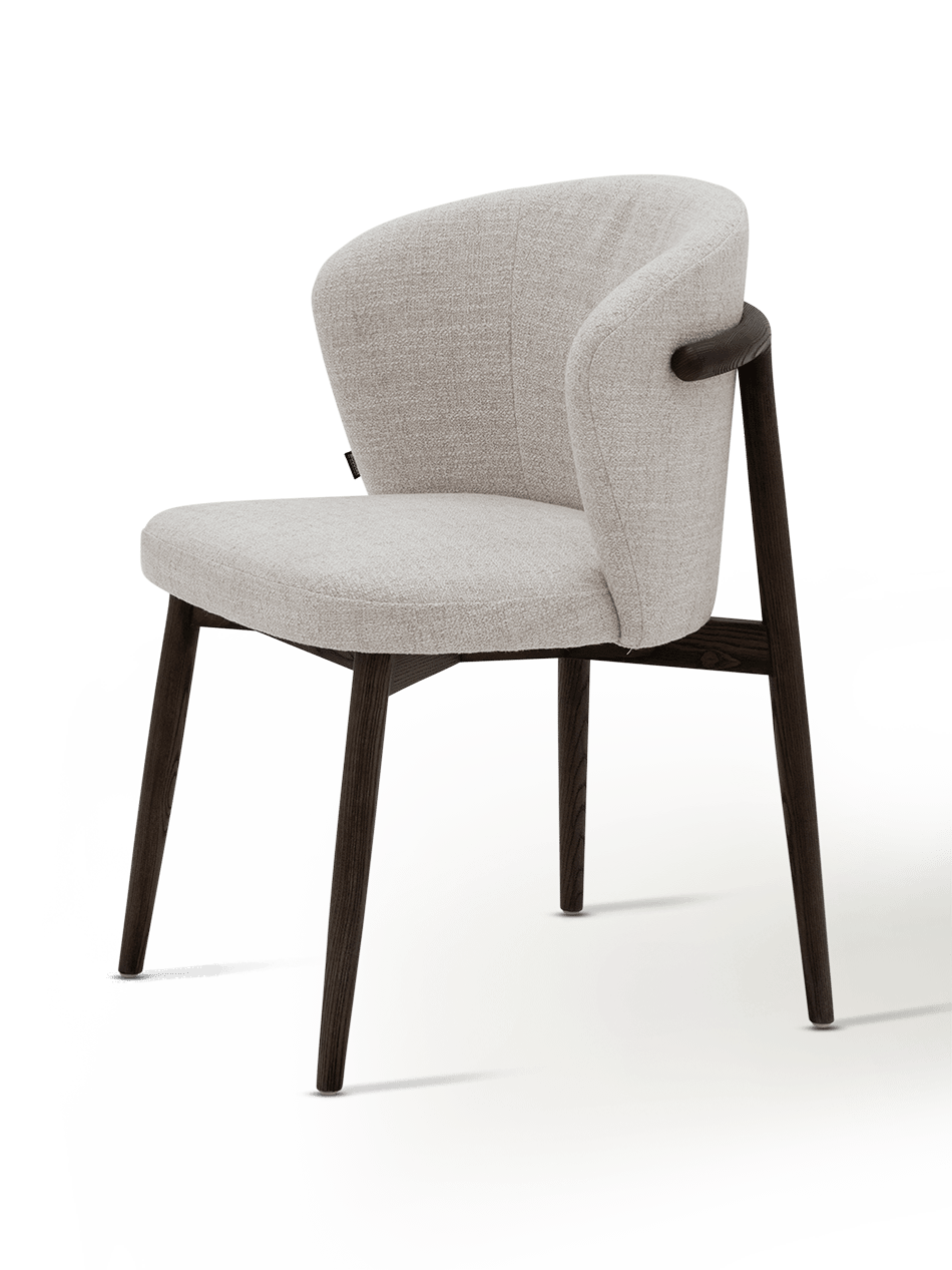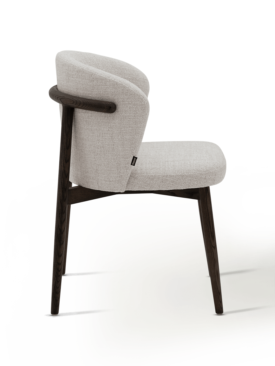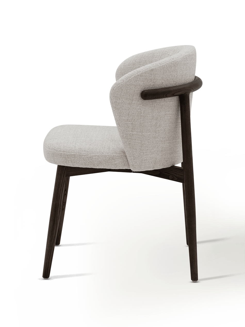 De Nido stoel straalt verfijning en warmte uit. De afgeronde rugleuning vormt één vloeiende lijn met de armsteunen, waardoor de stoel een uitnodigende, omhullende vorm krijgt. De bekleding in zachte stof contrasteert met de donker houten structuur. Een ontwerp dat rust brengt in elk interieur.