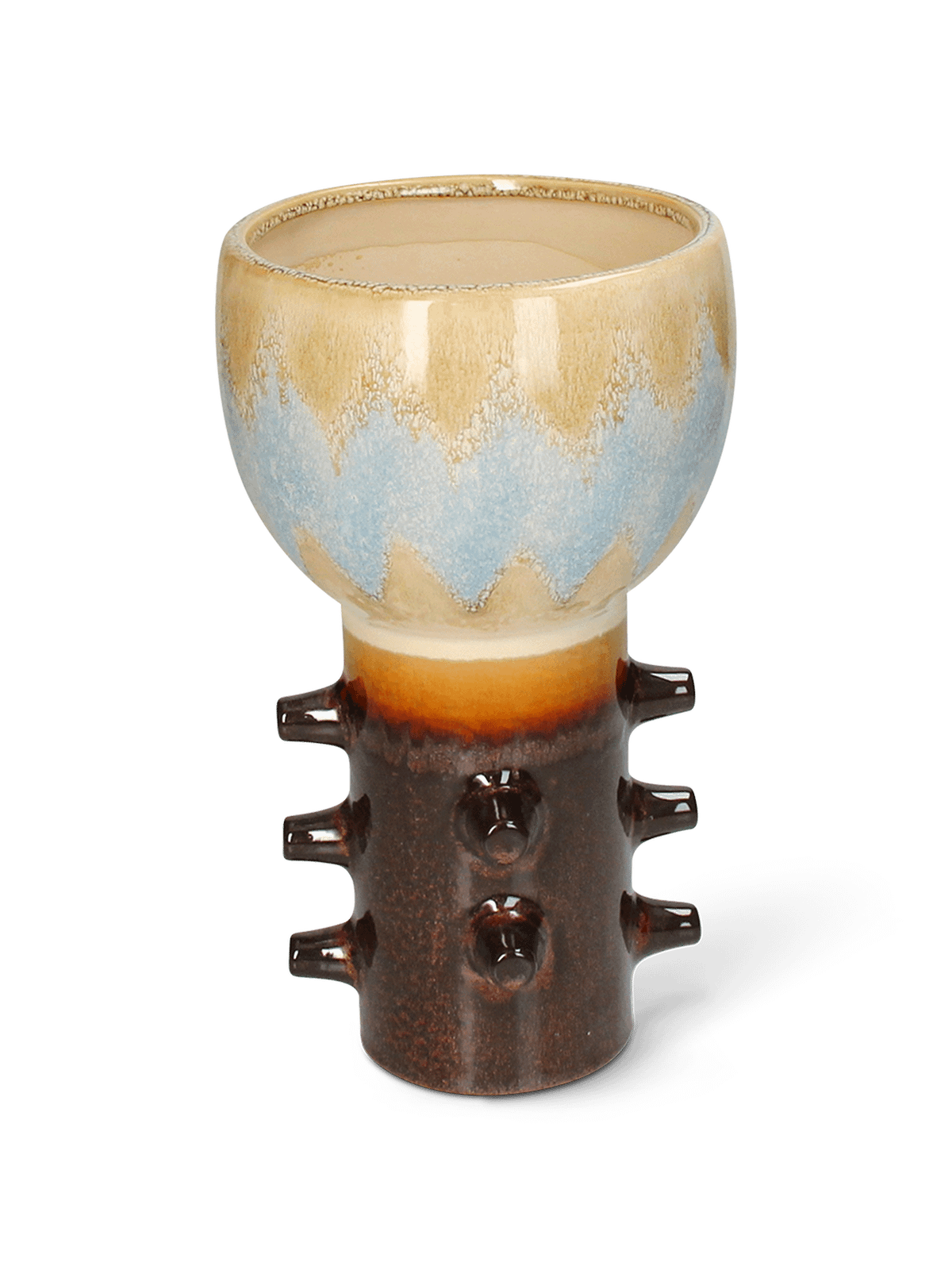 Deze unieke keramische vaas combineert warme bruine tinten met een frisse aqua afwerking. Het opvallende ontwerp met een geglazuurde bovenkant en een speelse, getextureerde onderkant maakt het een stijlvolle blikvanger in elk interieur. Perfect om bloemen of als decoratief object te gebruiken.
