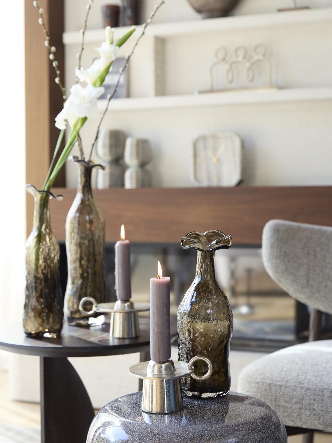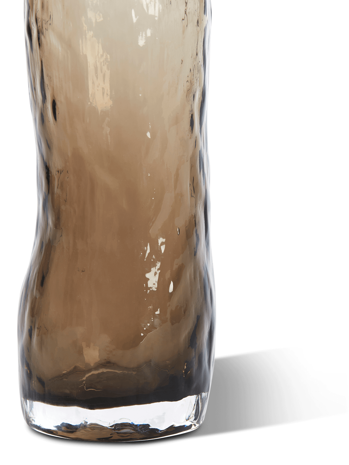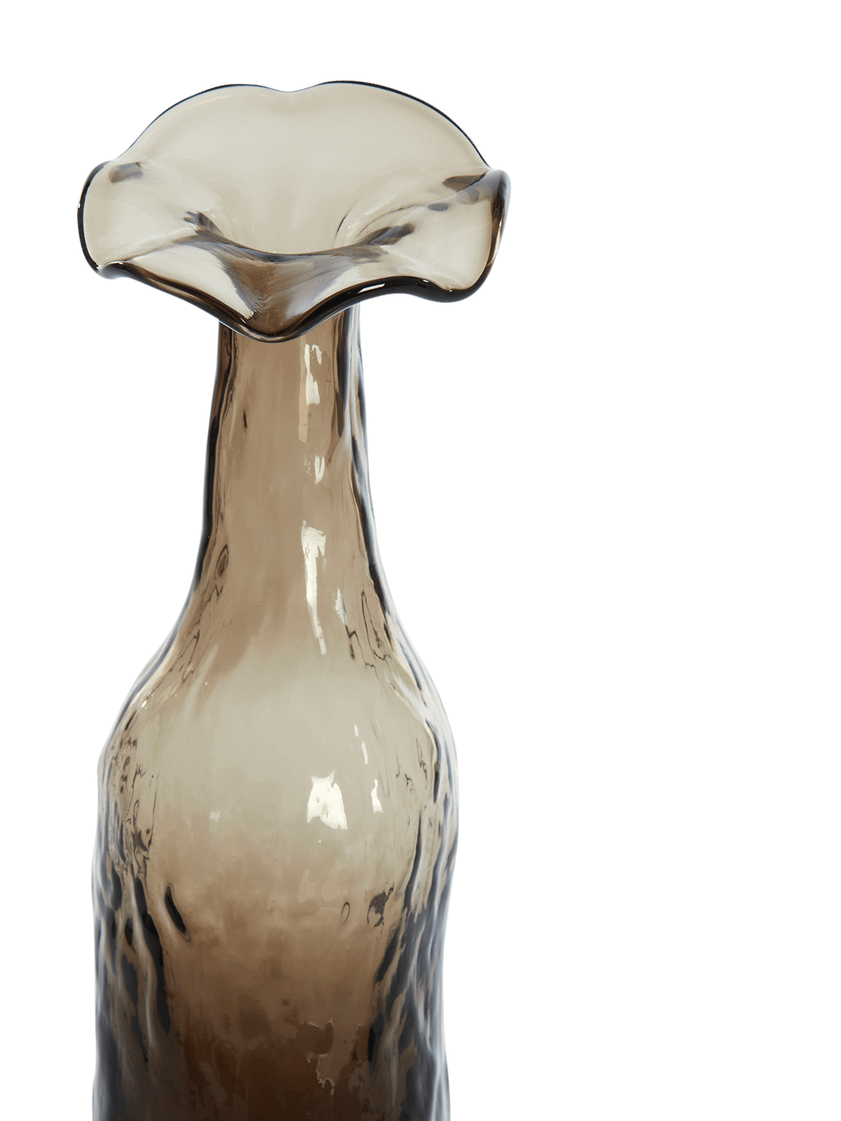 Deze bruine glazen vaas Rivolli is met zijn golvende hals en subtiel gehamerde textuur, elegant en speels tegelijk. De vloeiende vorm en licht getinte kleur geven een luxueus gevoel, ideaal voor zowel losse bloemen als decoratief gebruik.