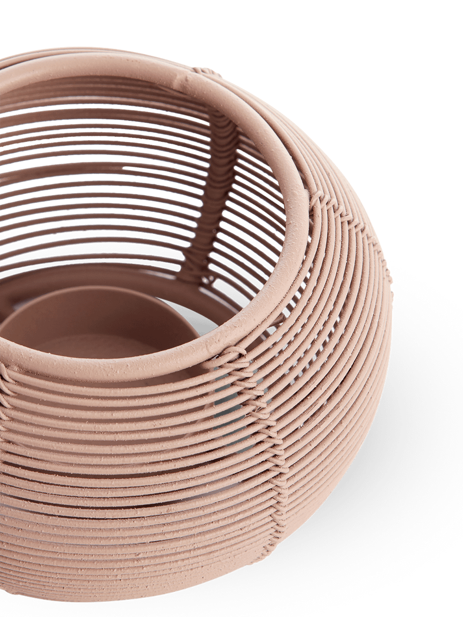 De theelichthouder Biano in licht terra brengt een zacht en modern accent in je interieur. De ronde vorm en open draadstructuur zorgen voor een mooi spel van licht en schaduw, terwijl de warme terratint een natuurlijke en uitnodigende sfeer creëert.