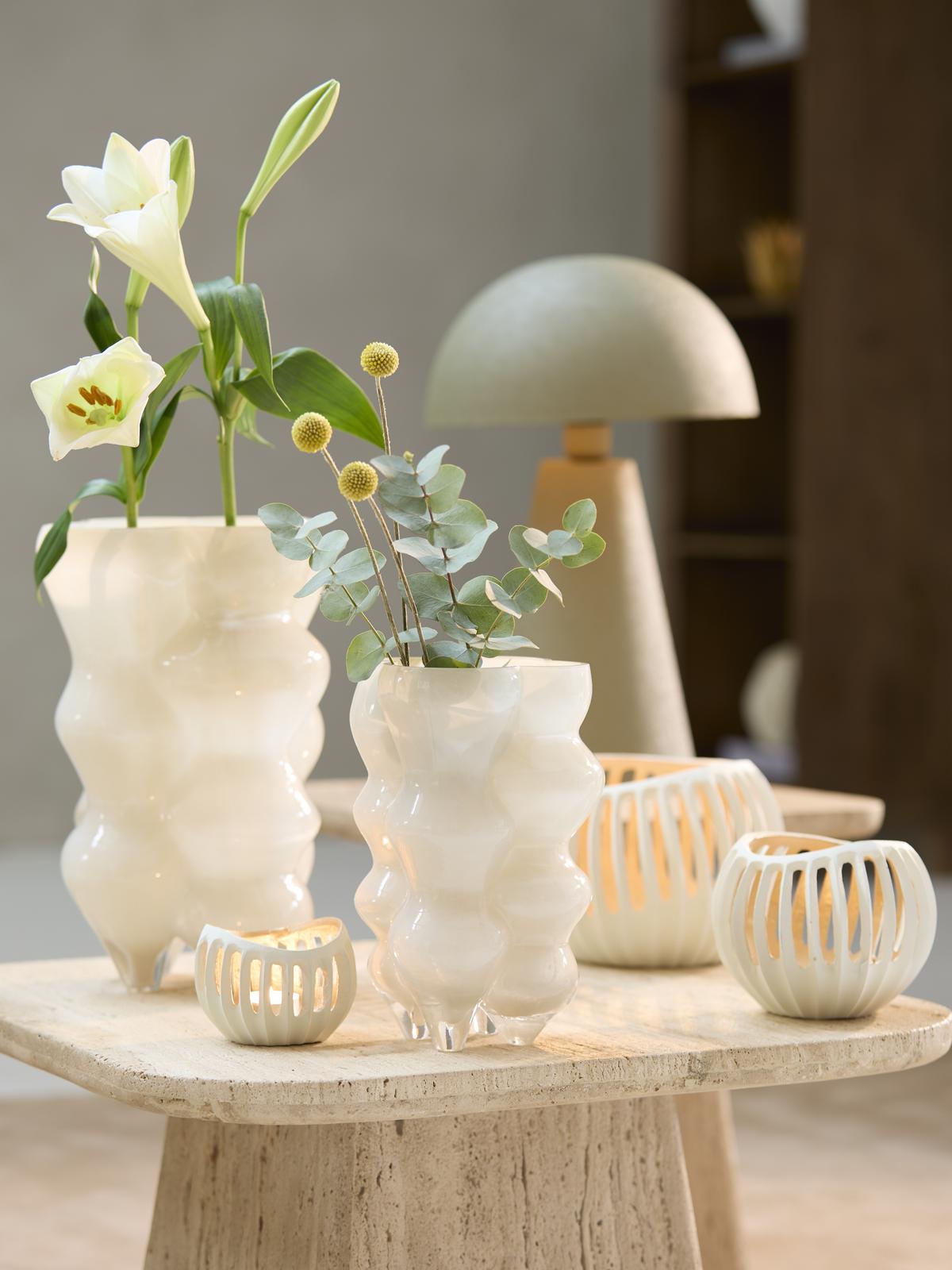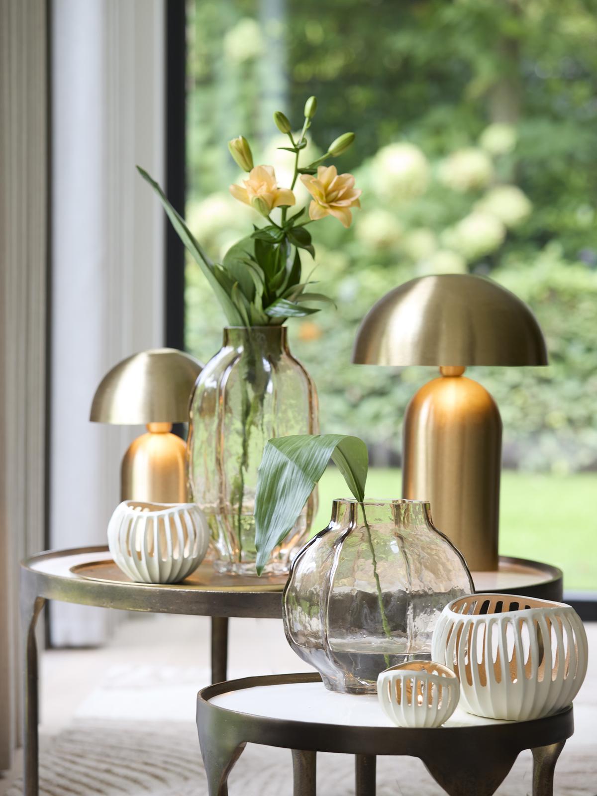 Chalco combineert een zachte, neutrale look met een subtiele metallic touch. Daardoor past hij moeiteloos bij zowel lichte natuurmaterialen als warmere tinten. Zet er eentje als klein accent, of groepeer meerdere theelichthouders voor een rijker, gelaagd effect.