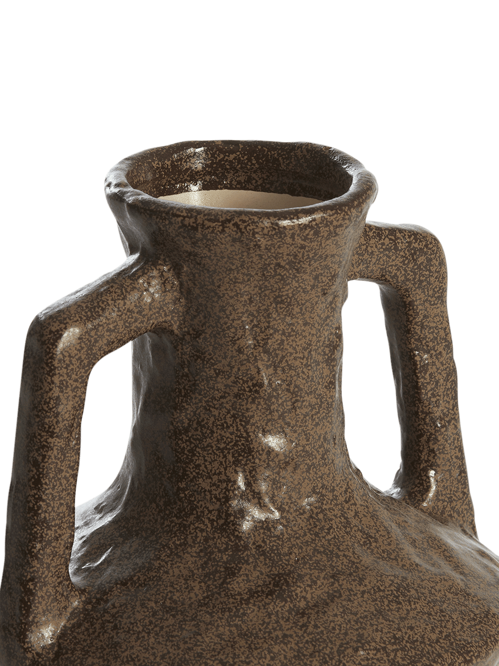 Vaas Ticino L is een stijlvol decoratief object in donkerbruin keramiek. De robuuste vorm met twee handgrepen en de subtiel gespikkelde afwerking geven deze vaas een warme, ambachtelijke uitstraling. Mooi op een dressoir, wandplank of bijzettafel, met enkele takjes of als decoratief object op zichzelf.