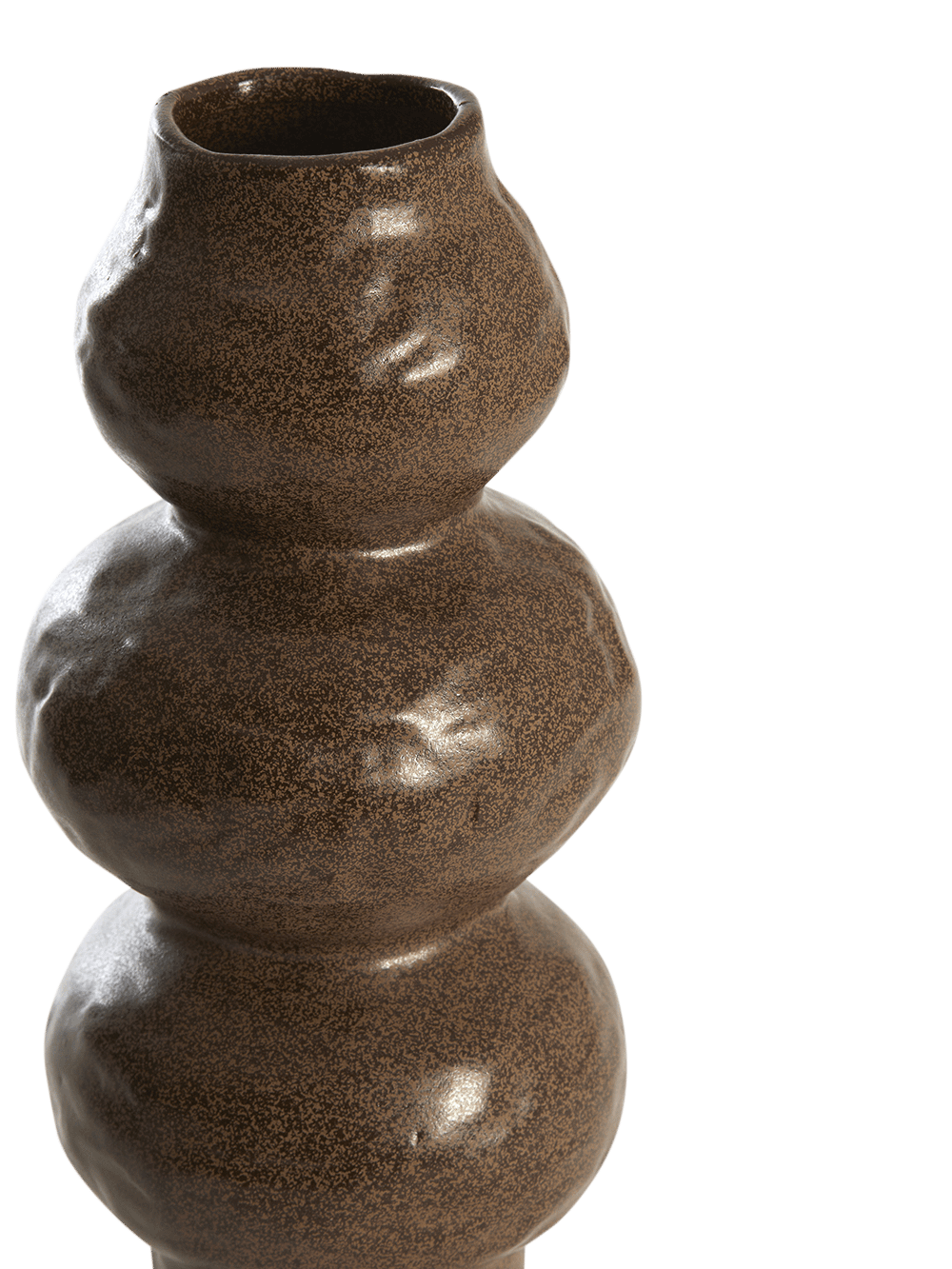 Vaas Rogano L is een stijlvol decoratief object in donkerbruin keramisch materiaal. De organische, gestapelde vorm en de subtiel gespikkelde afwerking geven deze vaas een warme en karaktervolle uitstraling. Mooi op een dressoir, in een open kast of op een sidetable, met enkele droogtakjes of gewoon als decoratief object op zichzelf.