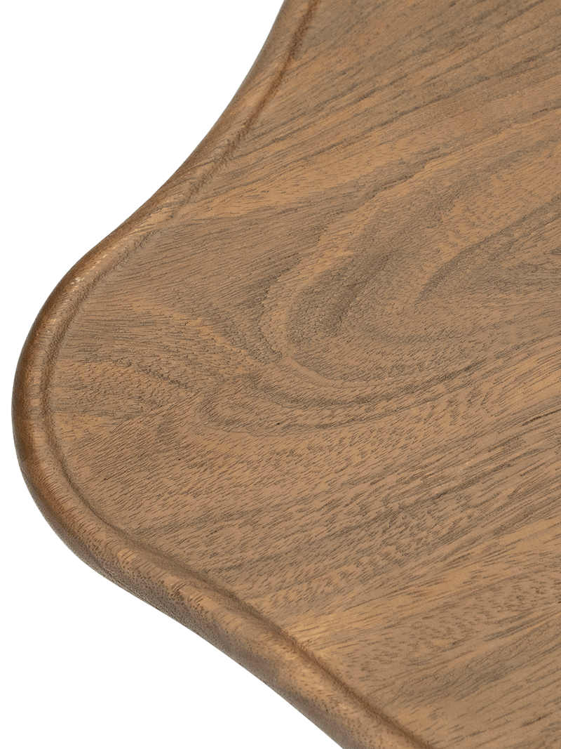 Het mangohout is zorgvuldig afgewerkt om de natuurlijke nerf en kleurvariatie te behouden, waardoor elk stuk uniek is. De afgeronde rand en gladde afwerking benadrukken de vakmanschap van het ontwerp.