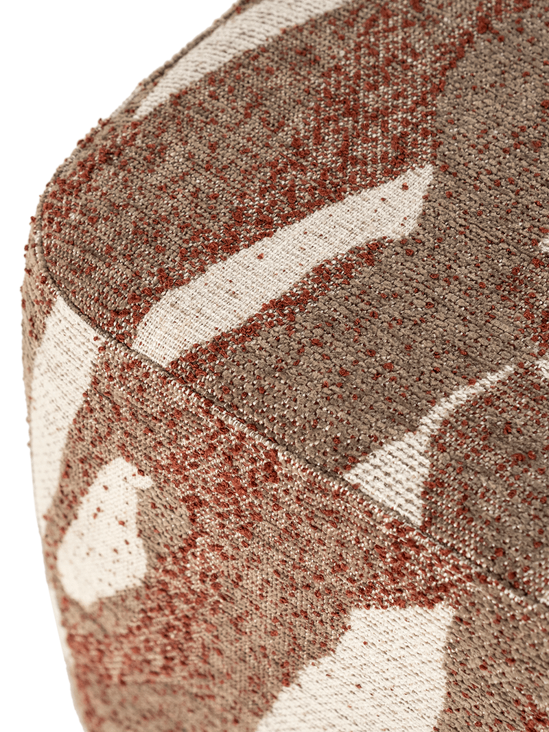 De Rytm pouf van By-boo valt op door zijn expressieve patroon en natuurlijke kleurencombinatie. De mix van warme aardetinten en lichte accenten zorgt voor een levendig maar gebalanceerd effect dat karakter toevoegt aan elke ruimte.